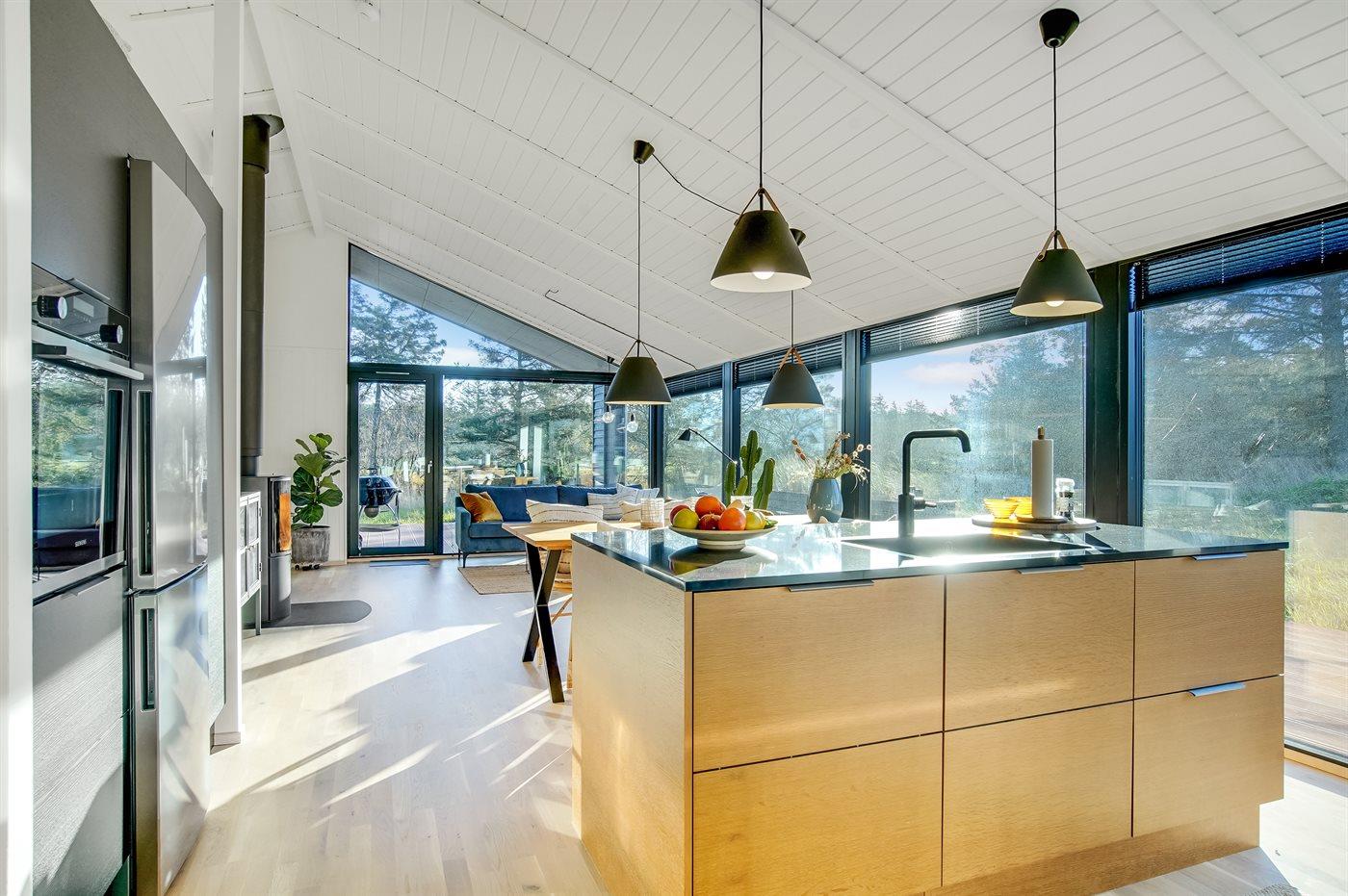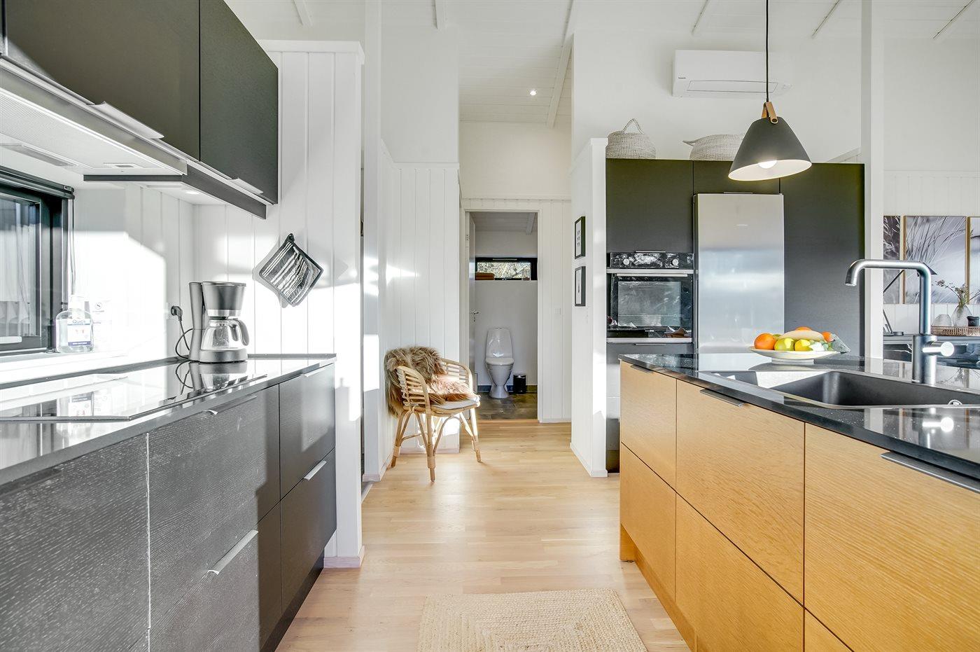 Køkkenet er udstyret med 1 køleskab. Der er 4 induktionskogeplader, varmluftovn samt opvaskemaskine.