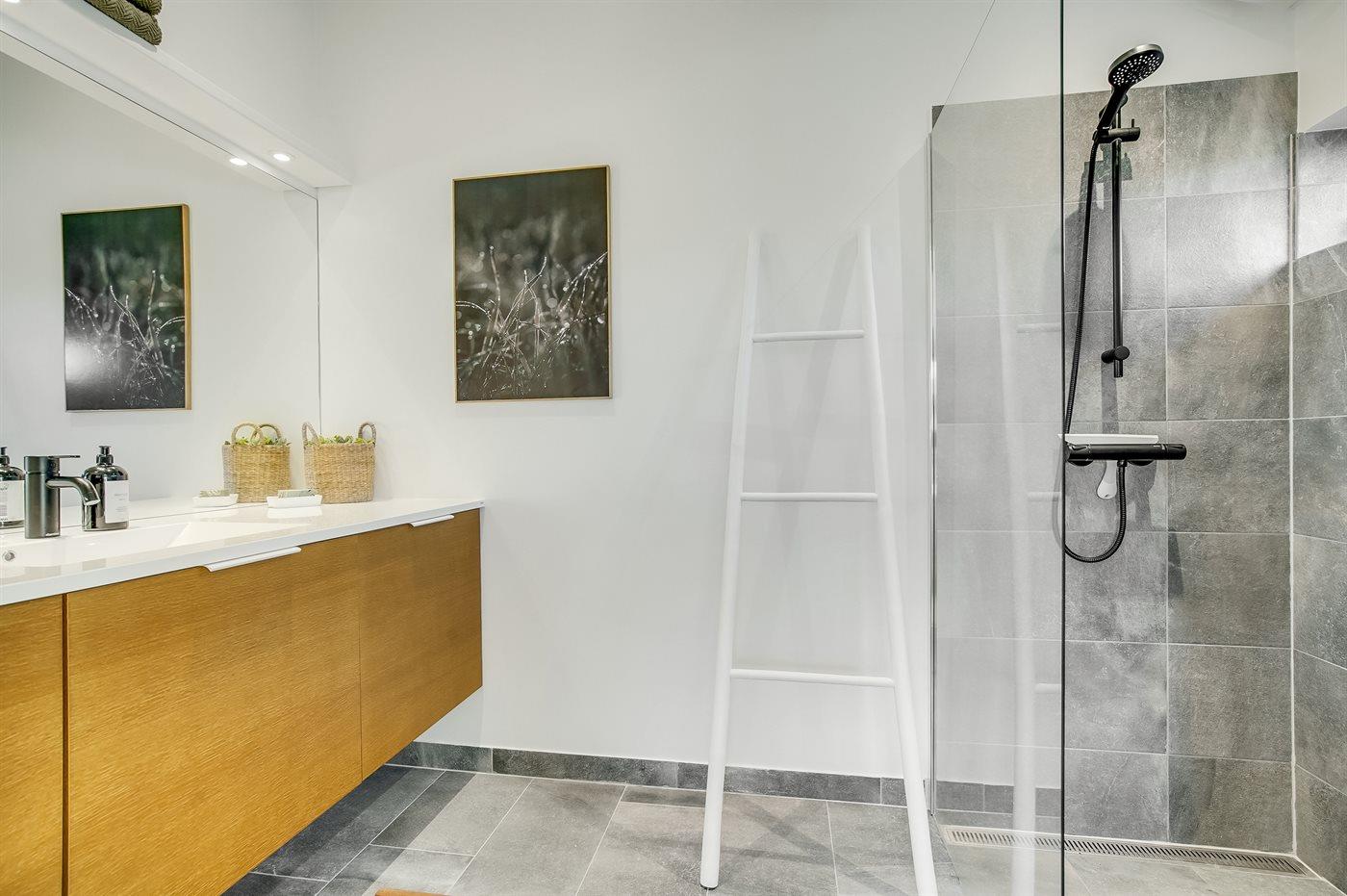 Der er 2 badeværelser med bruseniche og 2 toiletter. Der er gulvvarme på 2 badeværelser.