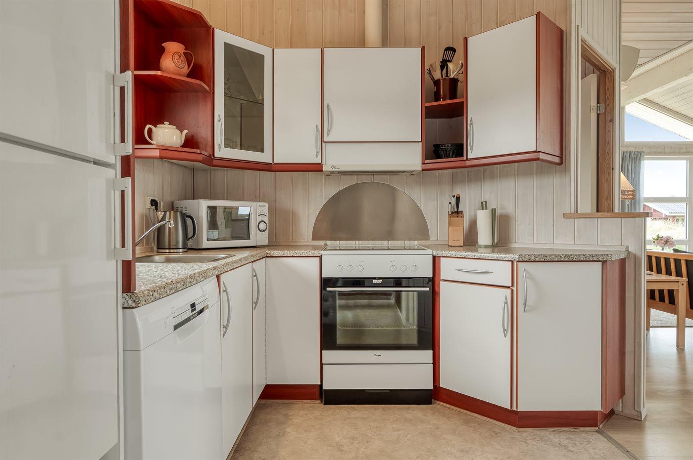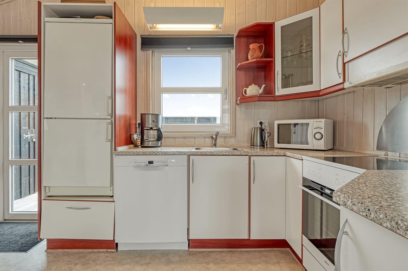 Køkkenet er udstyret med 1 køleskab. Der er 4 keramiske kogeplader, varmluftovn, mikrobølgeovn samt opvaskemaskine.
