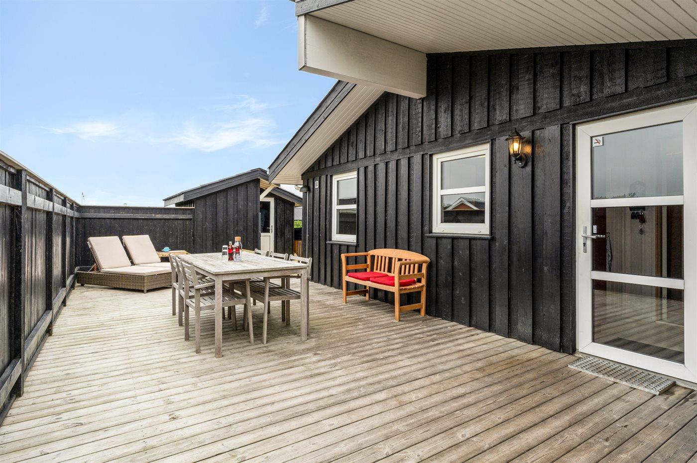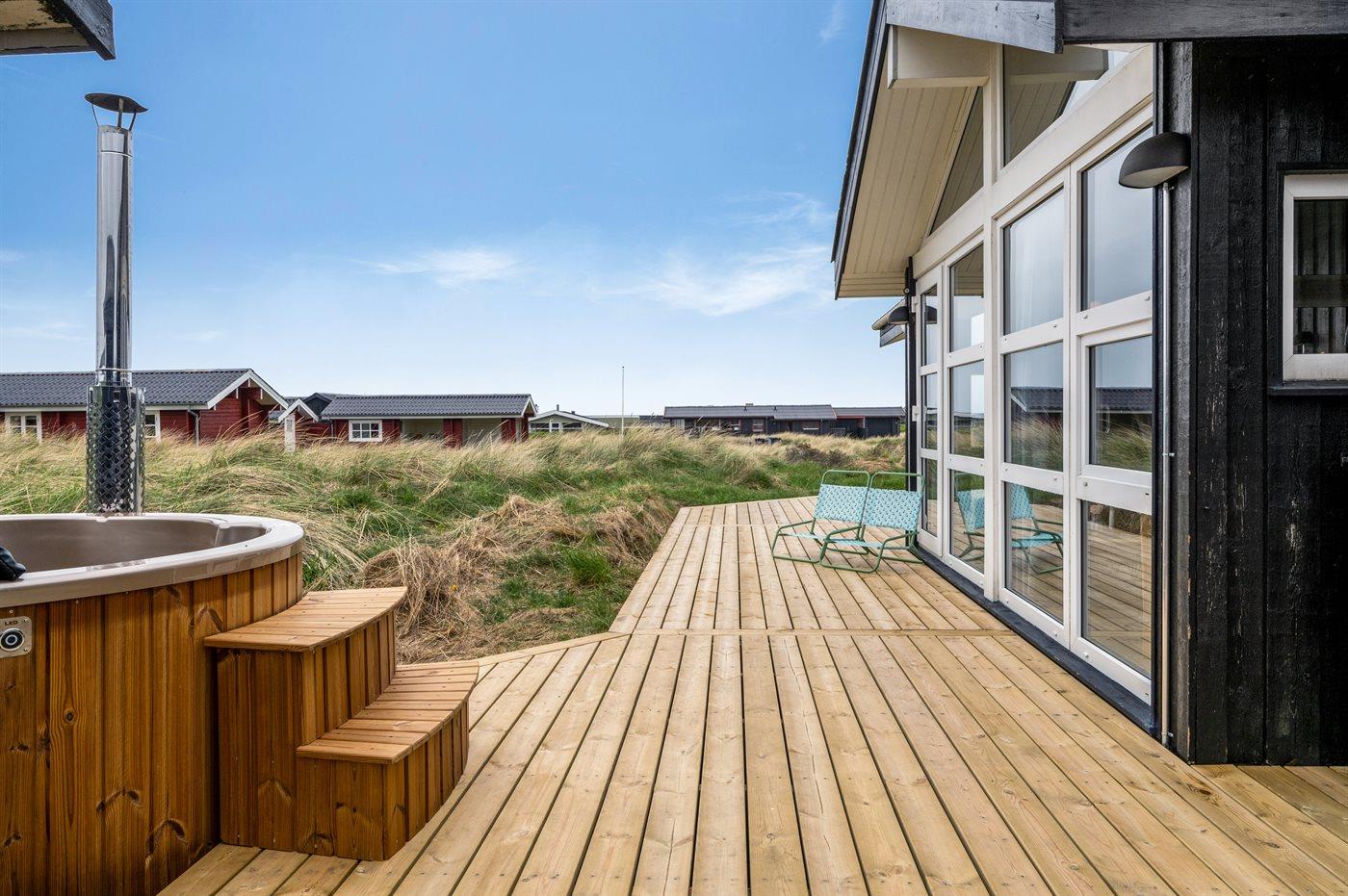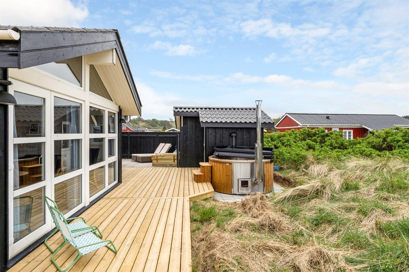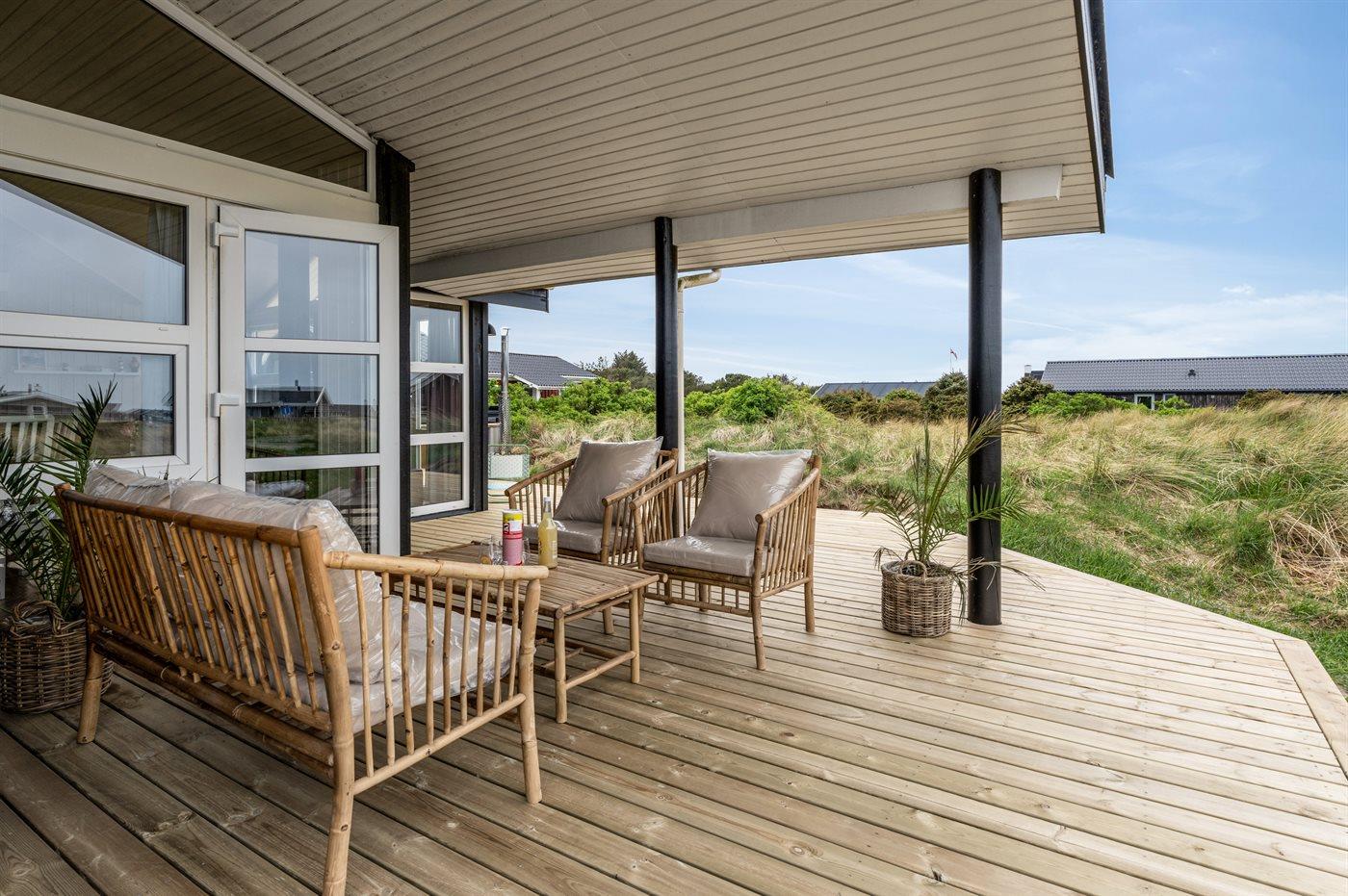 Ferieboligen er beliggende på en 1275 m² stor naturgrund. Der er 280 m til havet. Nærmeste forretning er beliggende i en afstand af 800 m. Til ferieboligen hører åbent terrasseareal. Desuden er der overdækket terrasse. Der er redskabsrum. Sandkasse. Udendørs bruser. Grill til rådighed. Parkering ved ferieboligen.