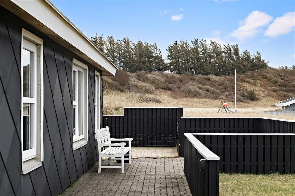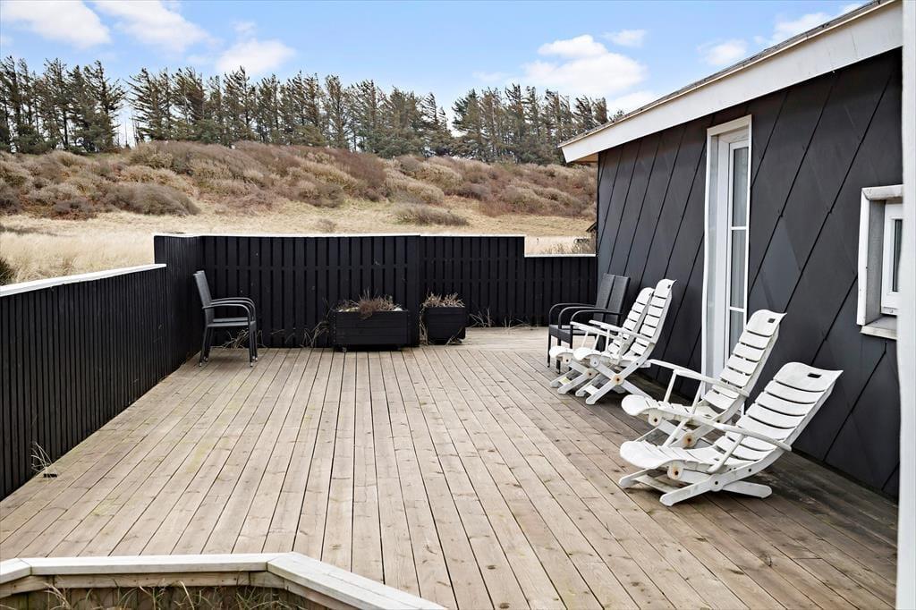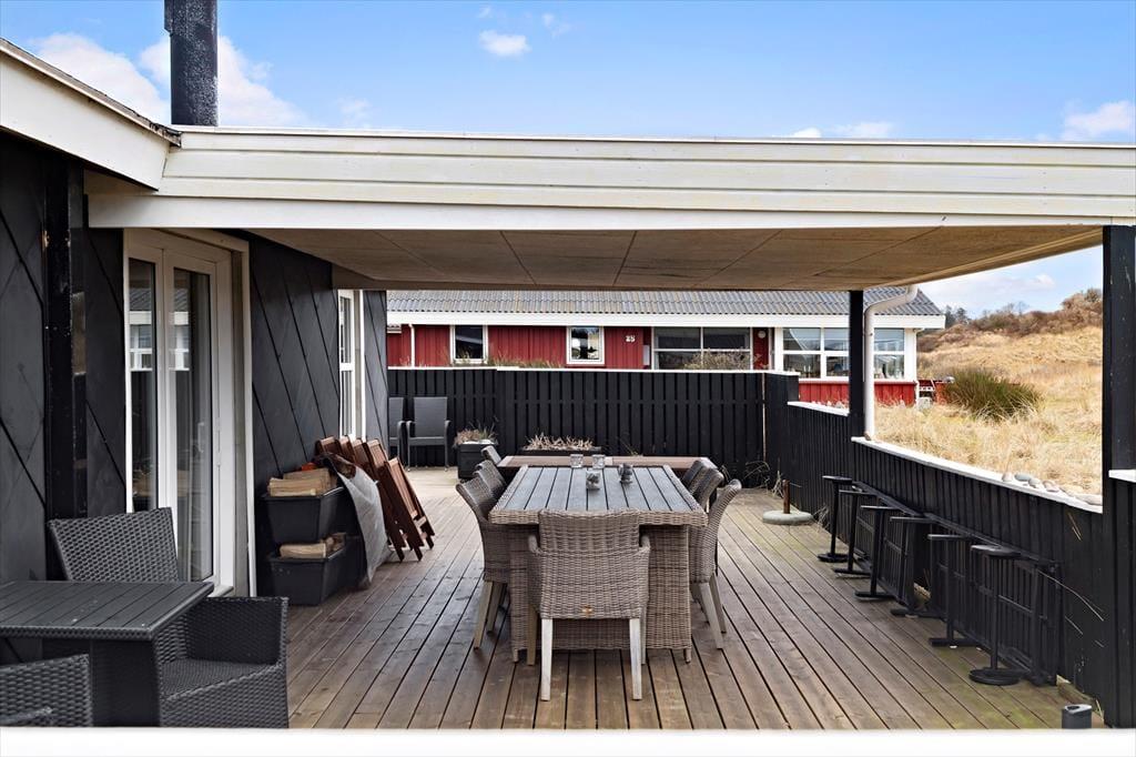 På tre af husets sider er der anlagt et skønt terrassemiljø, så alt efter tidspunktet på dagen kan I nyde solen fra øst, syd eller vest. Foretrækker I at sidde i skyggen, kan I rykke ind på det overdækkede terrasseafsnit, der ligger i forlængelse af stuen. På den 1250 m2 store grund er der god plads til at lege på græsset, og der er både sandkasse og gynge til de yngste feriegæster.