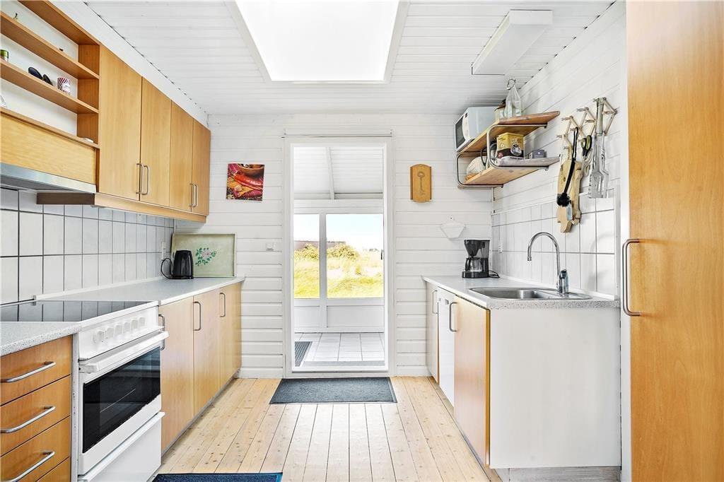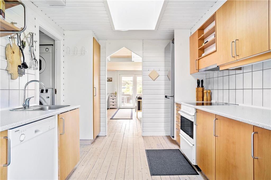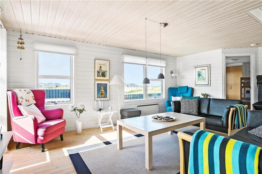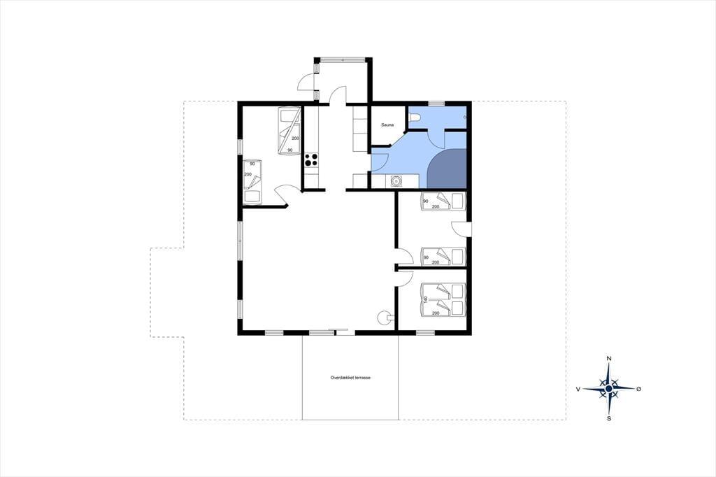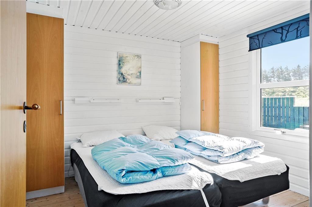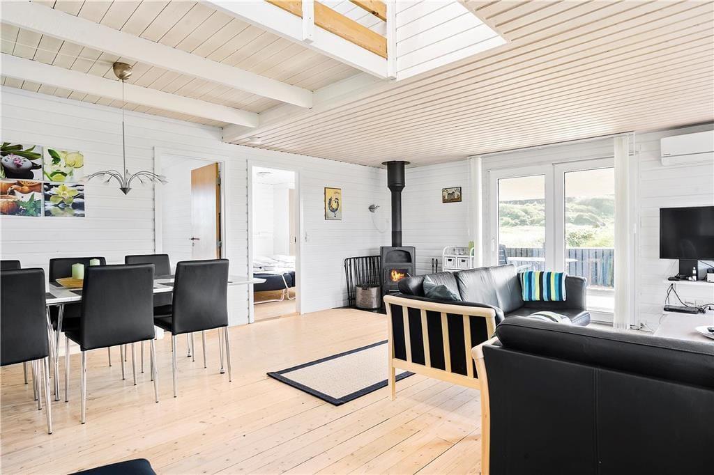 Inden døre er planløsningen gennemtænkt, så op til seks personer nemt og bekvemt kan holde ferie i sommerhuset. Her er tre gode soveværelser at gøre godt med, der ligesom stuen, køkkenet og badeværelset alle sammen er lyst og pænt indrettet. Køkken og stue ligger i åben forbindelse, så i opholdsafdelingen kan I nyde det gennemstrømmende lysindfald i løbet af dagtimerne. Når aftenen falder på, kan I skrue op for hyggestemningen ved at tænde op for brændeovnen, mens I kokkererer eller slapper af i sofaafdelingen. Er det køligt udenfor, kan husets varmepumpe tages i brug, og så er det selvfølgelig velgørende at blive varmet igennem med et spabad og en tur i saunaen.