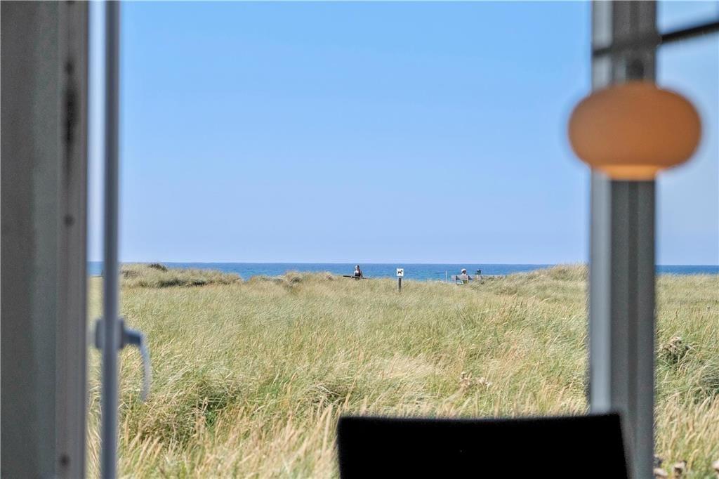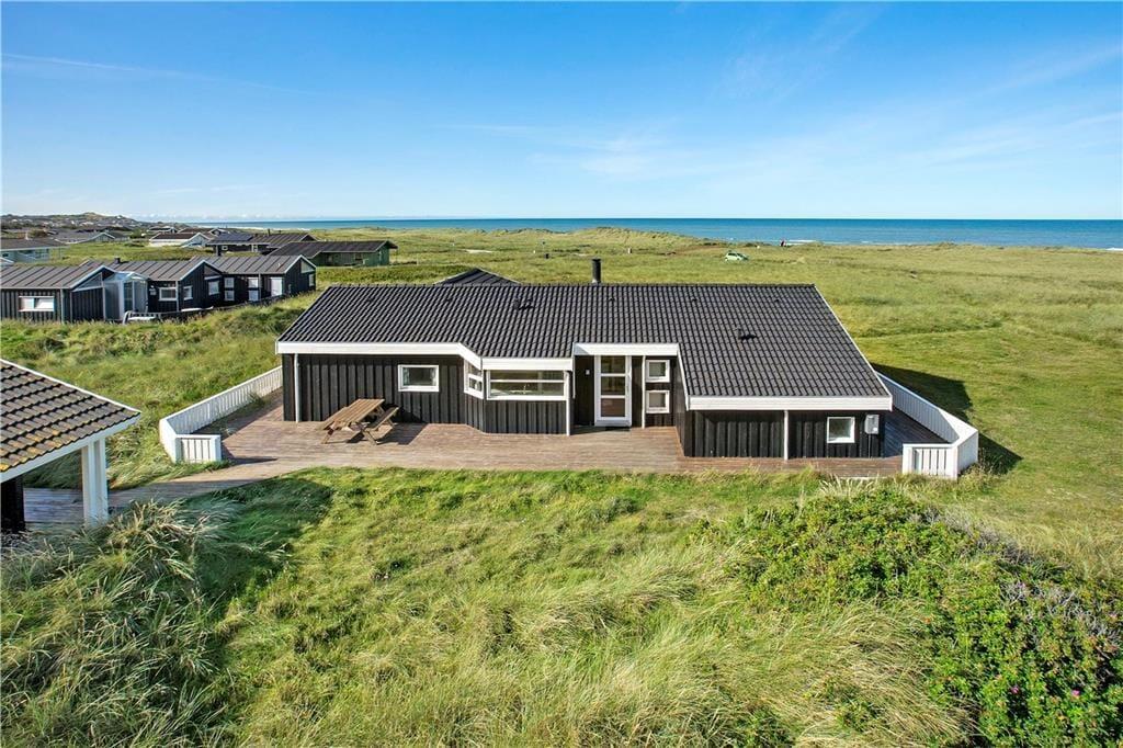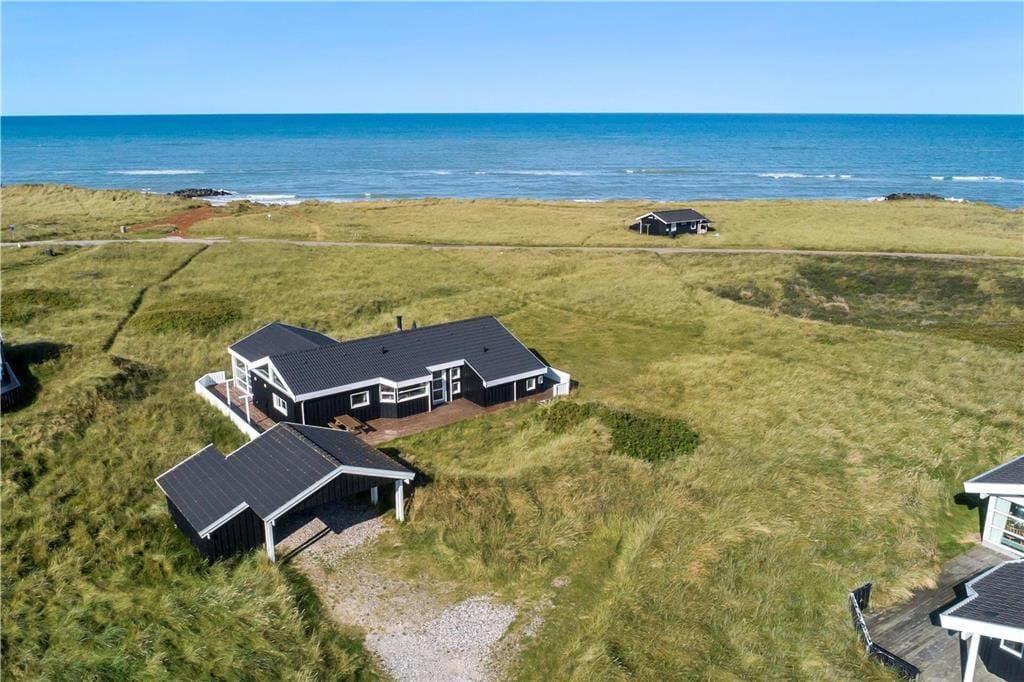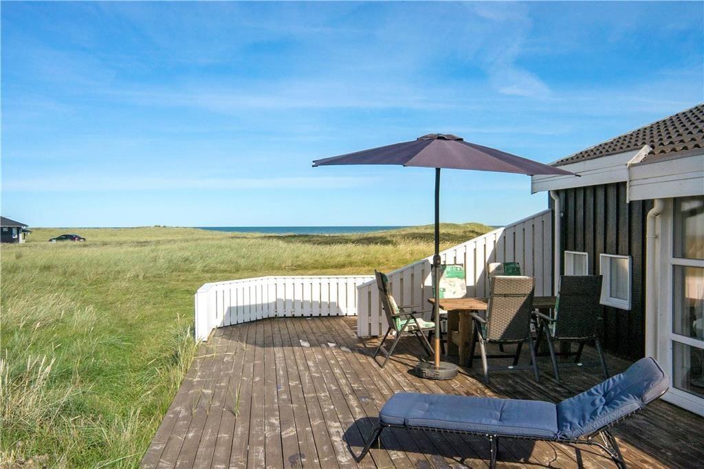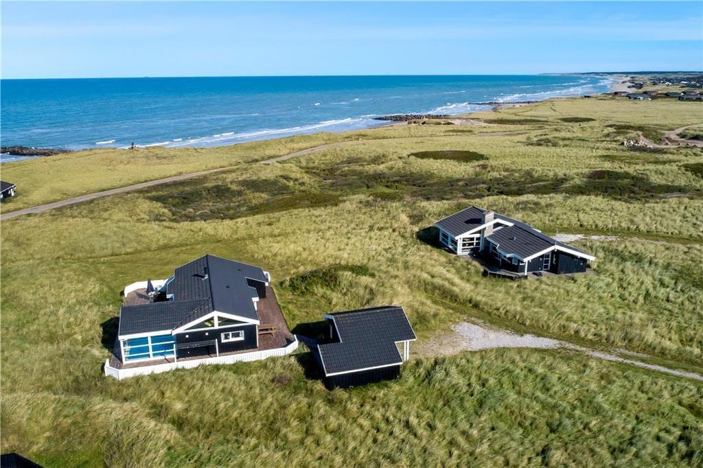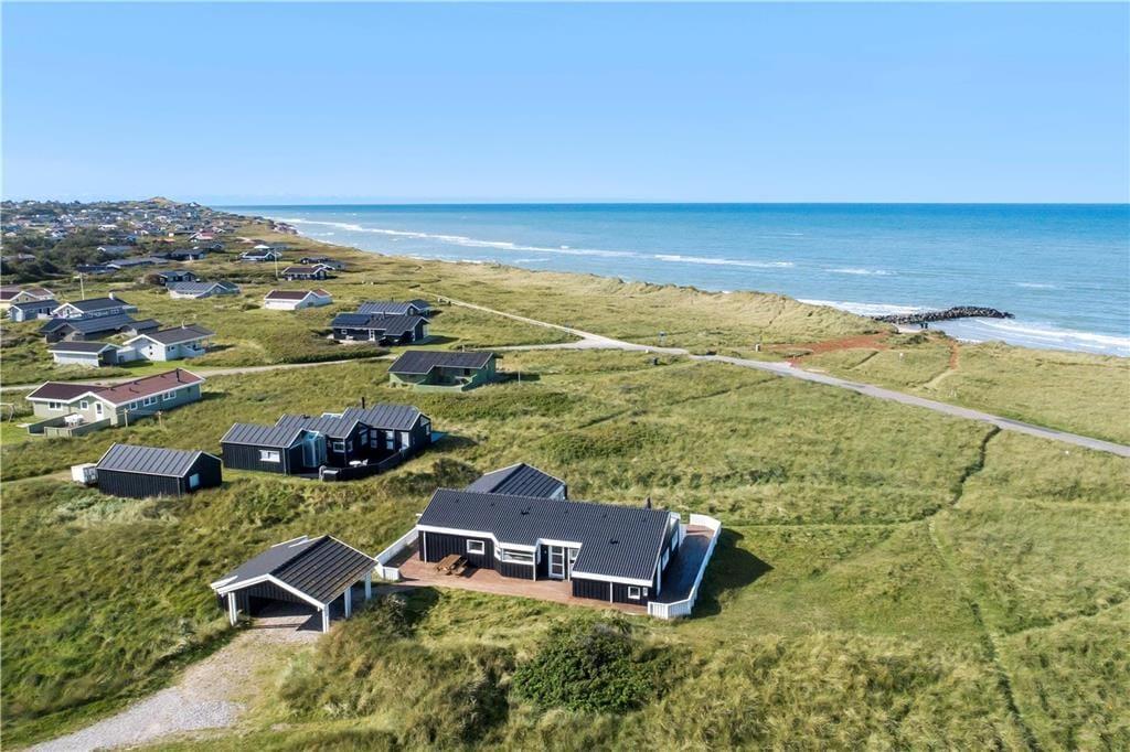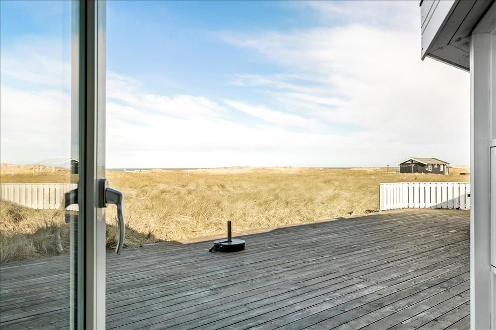 Huset har en unik placering på en 3.000 m2 stor naturgrund. Her får I Vesterhavet helt tæt på, og I kan nyde den friske, salte havluft fra husets dejlige terrasser. Der er terrasser hele vejen rundt om huset, så der er rig mulighed for at søge sol, skygge eller læ efter behov. Her kan man sidde i timevis og kigge ud over det bølgende landskab, der skifter farve og karakter, som dagen skrider frem. Og når aftenen falder på, kan I servere aftensmaden på den store terrasse med havet som bagtæppe – meget bedre bliver det ikke.