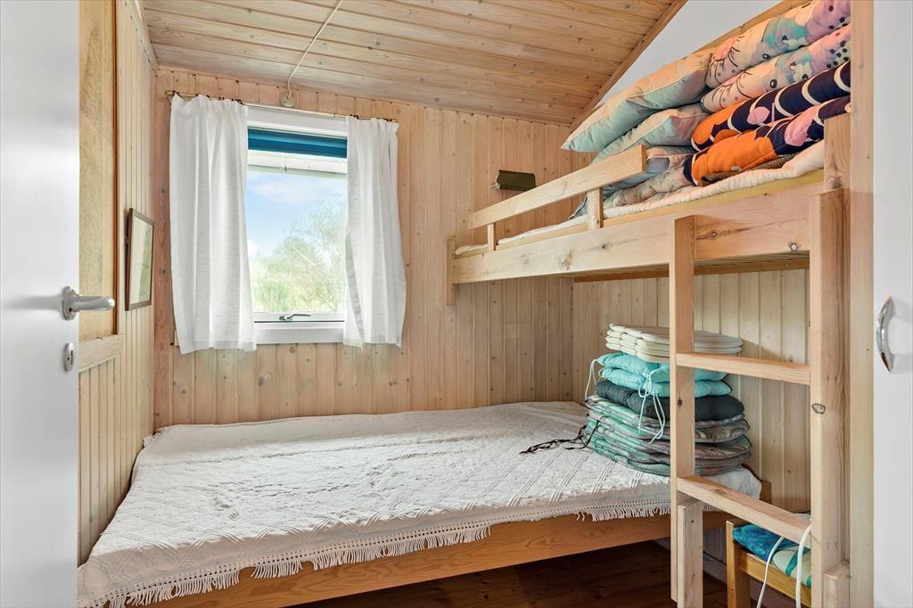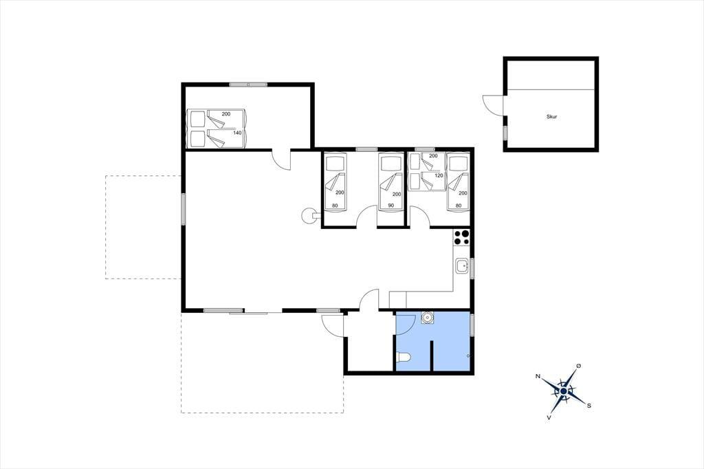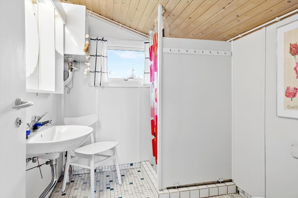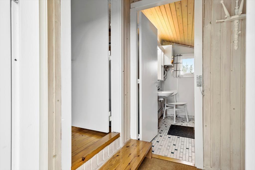 Sommerhuset måler 63 m2 og har en fin planløsning til fem personer. I bliver budt velkommen i en lille entré, og herfra går der et par trin op til den hyggelige opholdsafdeling. Den består af køkken og stue i åben forbindelse, så en stor del af dagens afslapningsstunder og sociale samvær kommer sikkert til at foregå her. Spisebordet er placeret lige ved et stort sydvestvendt vindue, der giver frit udsyn til de åbne vidder, mens I spiser. Efter måltidet må I smøge ærmerne op, for der er ingen opvaskemaskine i køkkenet – til gengæld kan I nyde den smukke udsigt, mens I står og vasker op. Aftenen kan foregå i sofaen nær brændeovnen, eventuelt med en film på fladskærmen, og når det er sengetid, kan I fordele jer på husets tre soveværelser. Sidst, men ikke mindst, byder planløsningen på et badeværelse med bruser.