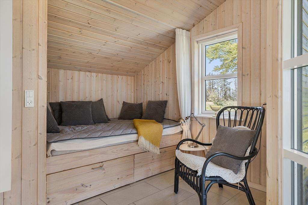Fra alkoven kan I skimte havet, og fra terrassen kan I nyde synet af vandet og det grønne landskab. En dejlig træterrasse omkranser huset og giver jer mulighed for at finde en solrig plads – eller skygge under parasollen eller den overdækkede terrasse. Børnene kan more sig med gyngestativ, sandkasse og fodboldmål, og hele familien kan samles om at riste skumfiduser ved bålstedet.