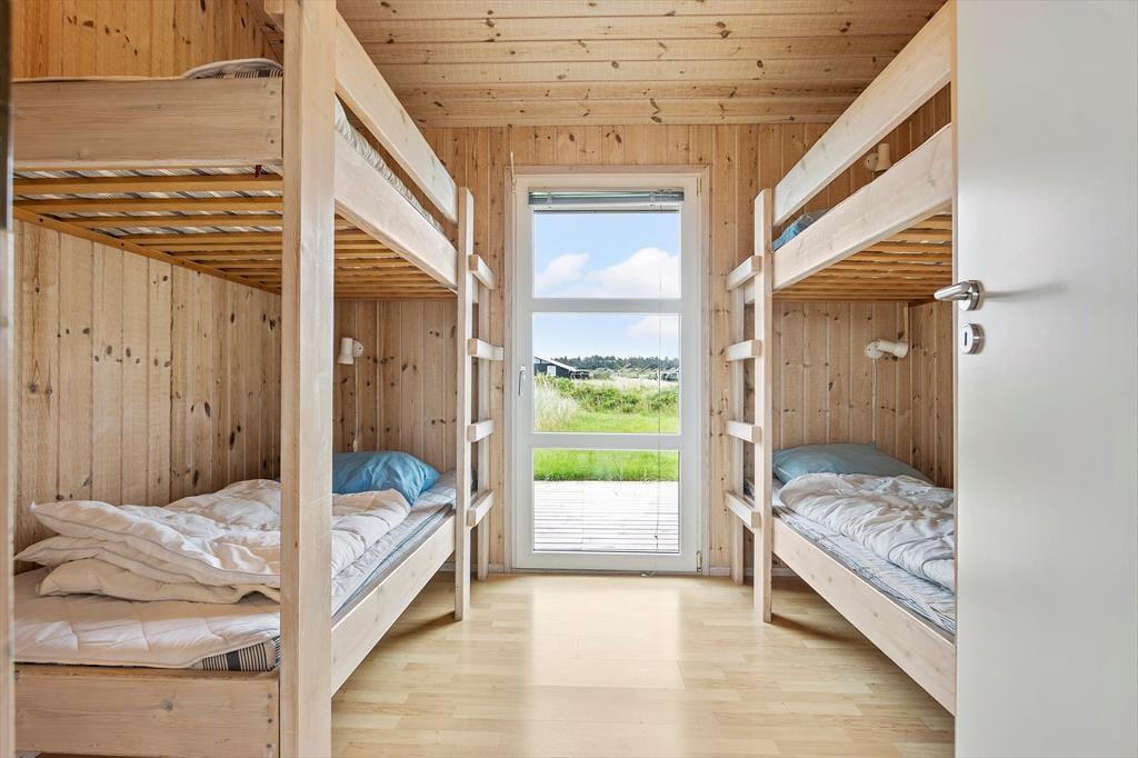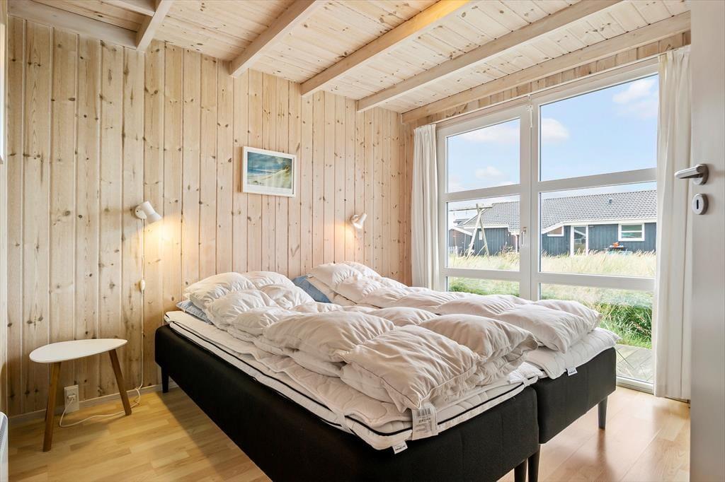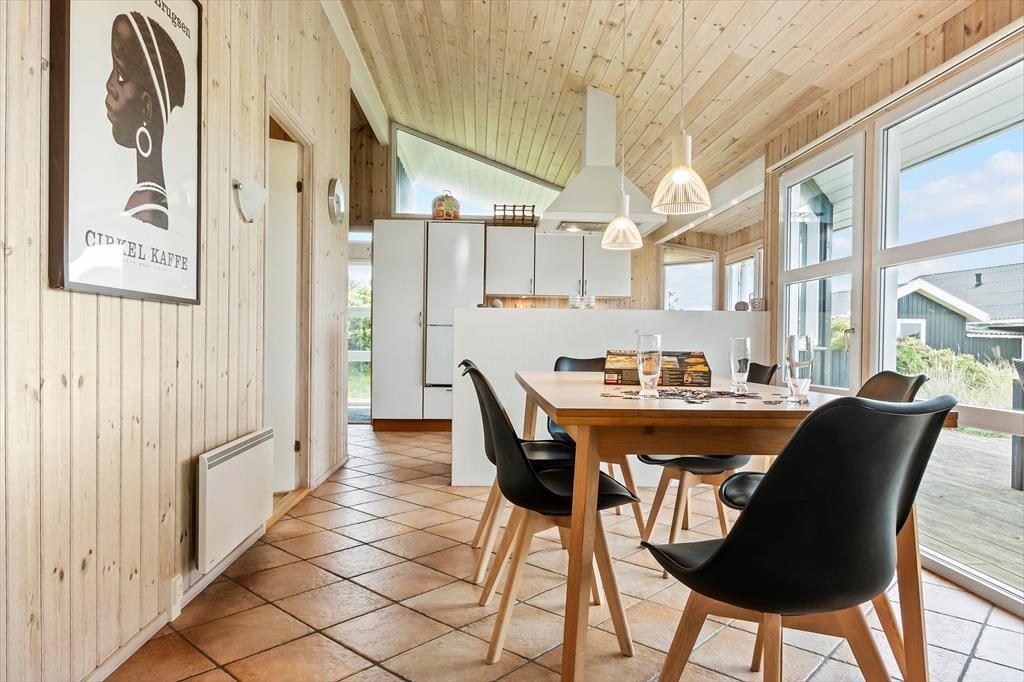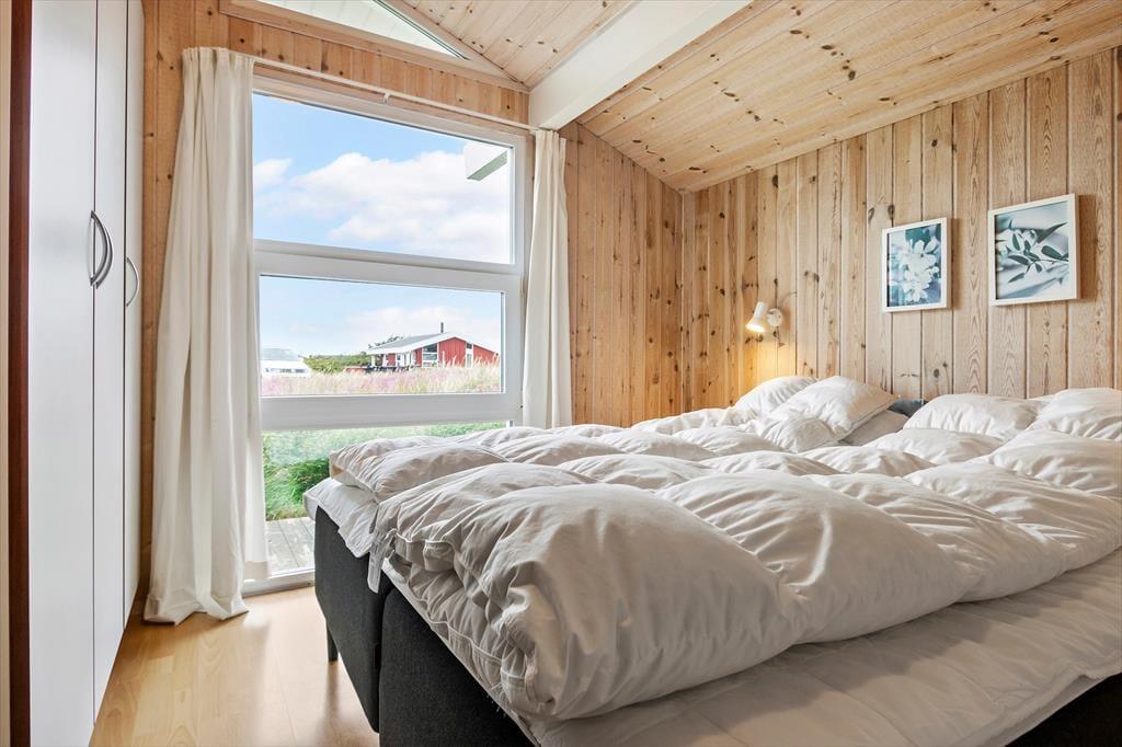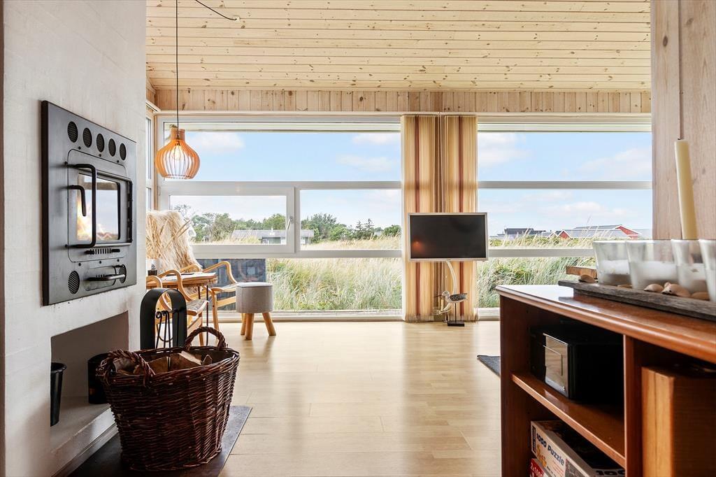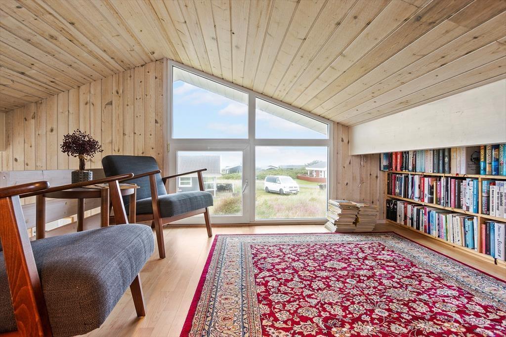 Sommerhusets indre er lyst og imødekommende med en hyggelig atmosfære, der straks får dig til at føle dig hjemme. Den åbne opholdsafdeling danner rammen om ferielivet med stue og køkken i ét – perfekt til nærvær og fælles aktiviteter. Brændeovnen står klar til at sprede varme og stemning på kølige aftener, mens store vinduespartier lader lyset strømme ind og trækker den smukke natur udenfor helt tæt på. Som noget særligt har huset en hems med udsigt til det omkringliggende landskab – et helt ideelt sted at slå sig ned med en god bog eller blot nyde roen. Hemsens placering gør det til en favorit blandt både store og små, og dens hyggelige rammer bidrager til husets charme.