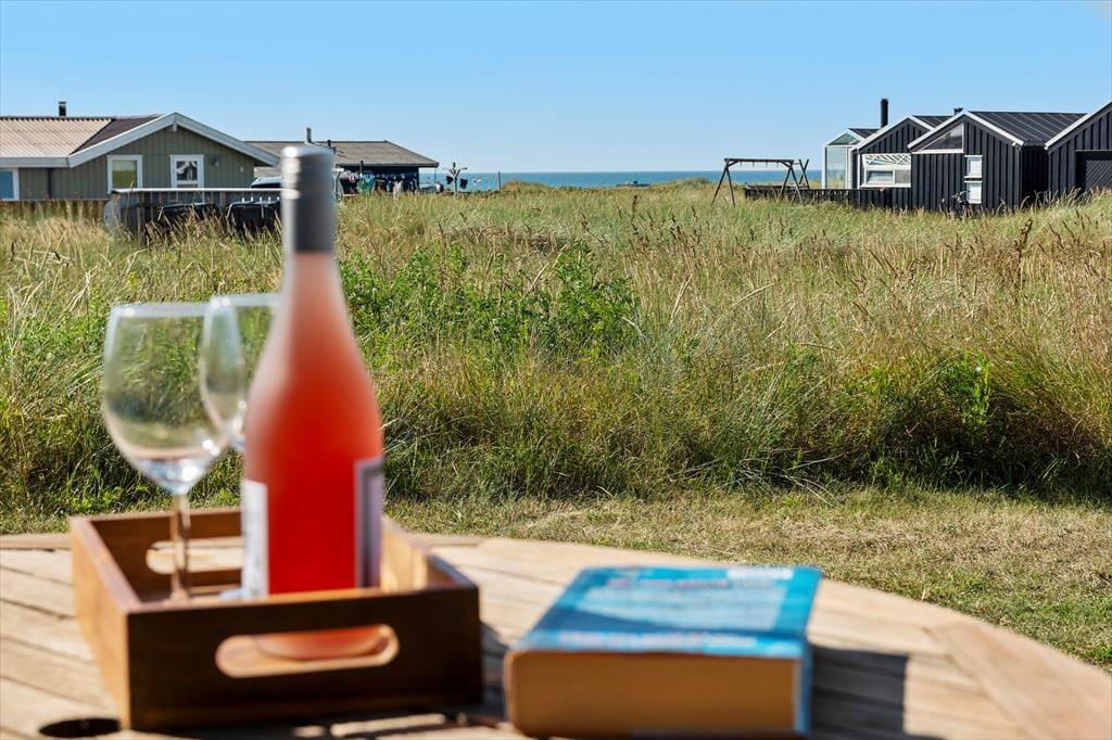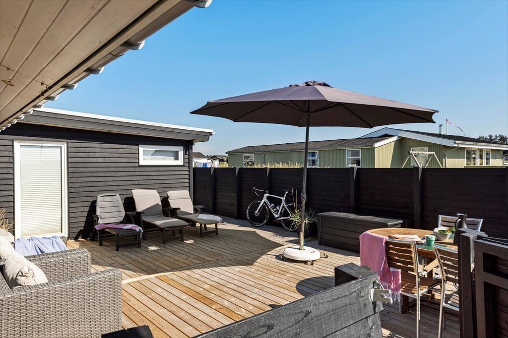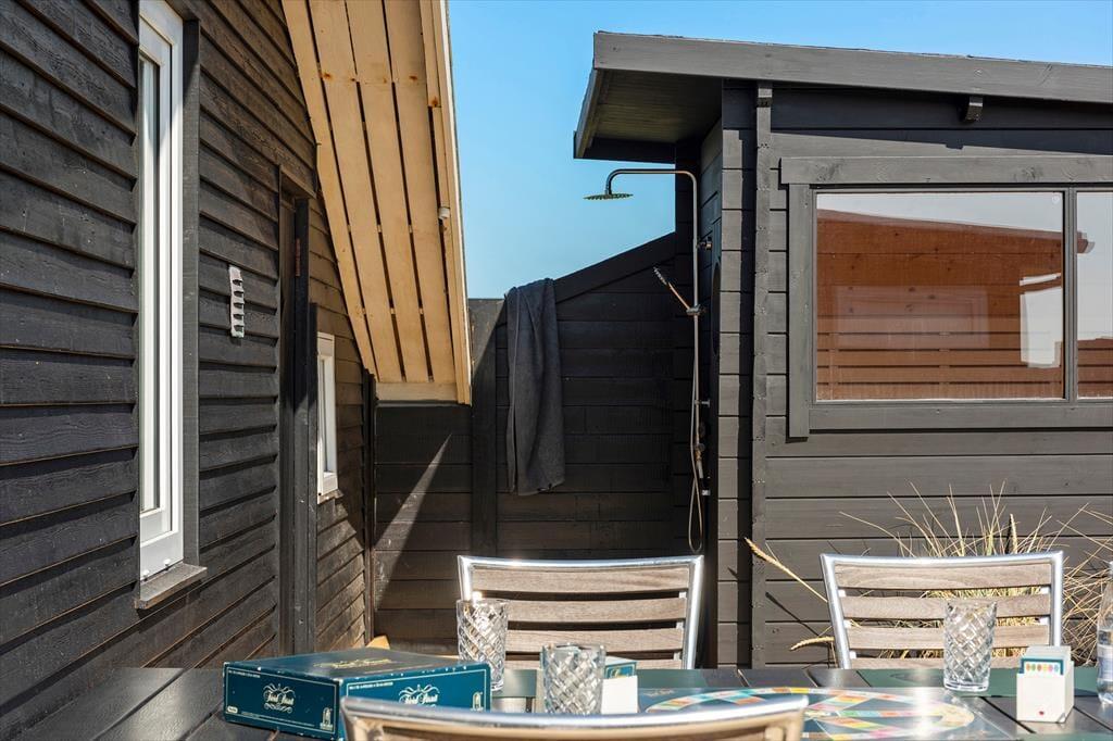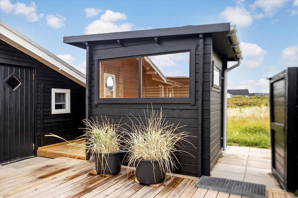 Udenfor på sommerhusets grund kan du virkelig mærke roen, der præger området. En stor terrasse indbyder til afslapning, hvor du kan nyde en god bog i solens varme stråler eller lade tankerne vandre med udsigt til den smukke natur omkring huset. Et af sommerhusets helt særlige træk er den udendørs sauna, som giver dig mulighed for at forkæle dig selv med en wellnessoplevelse under åben himmel – perfekt efter en forfriskende dag på stranden. Og netop stranden er tæt på: Du kan nemt gå ned og mærke sandet mellem tæerne eller tage en dukkert i Vesterhavet, der er lige rundt om hjørnet.