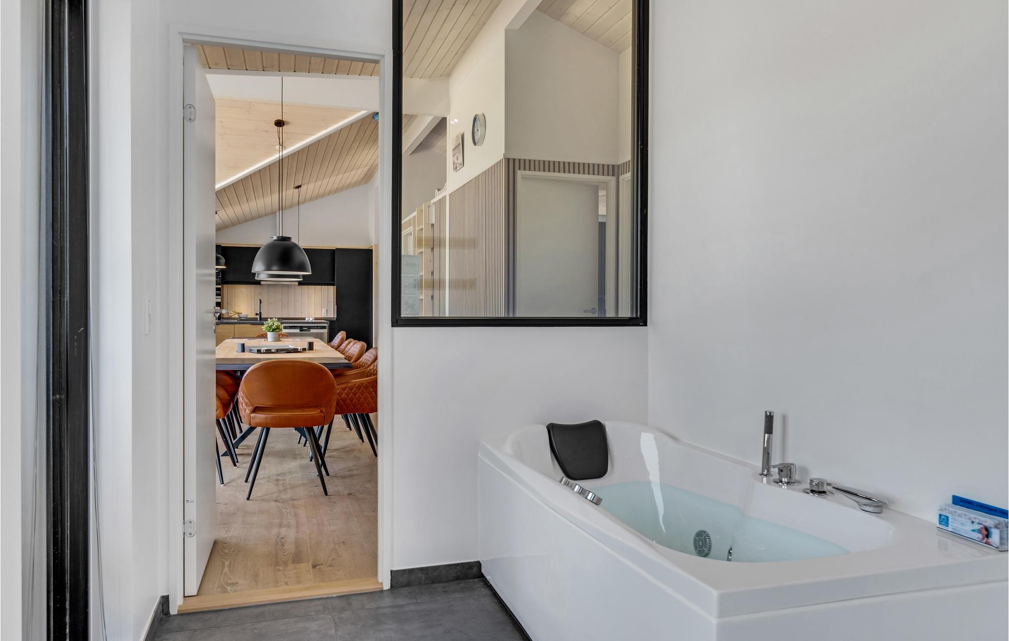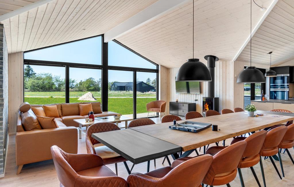 Huset er meget smagfuldt indrettet i lyse, indbydende farver og med moderne møbler. Den rummelige stue har en hyggelig brændeovn, loft til kip og store vinduespartier, der slipper masser af dagslys ind, og lader jer beundre den omkringliggende natur, selv når I er indendørs. Det åbne, veludstyrede køkken støder op til spisepladsen og den store stue. De hyggelige soveværelser har trægulv og gode senge, der med sikkerhed vil give jer en god nats søvn. Der er naturligvis flere skønne badeværelser - det ene med adgang til sauna, hvilket gør huset særdeles velegnet til to familier. I aktivitetsrummet kan nogle af jer spille bordtennis, mens de andre slapper af foran tv'et og ser en spændende film. Glæd jer også til mange timers badesjov i poolen og total afslapning i spabadet. Feriehuset er omgivet af skønne træterrasser med havemøbler, hvor I kan samles til grillmiddage på de lune sommeraftener.