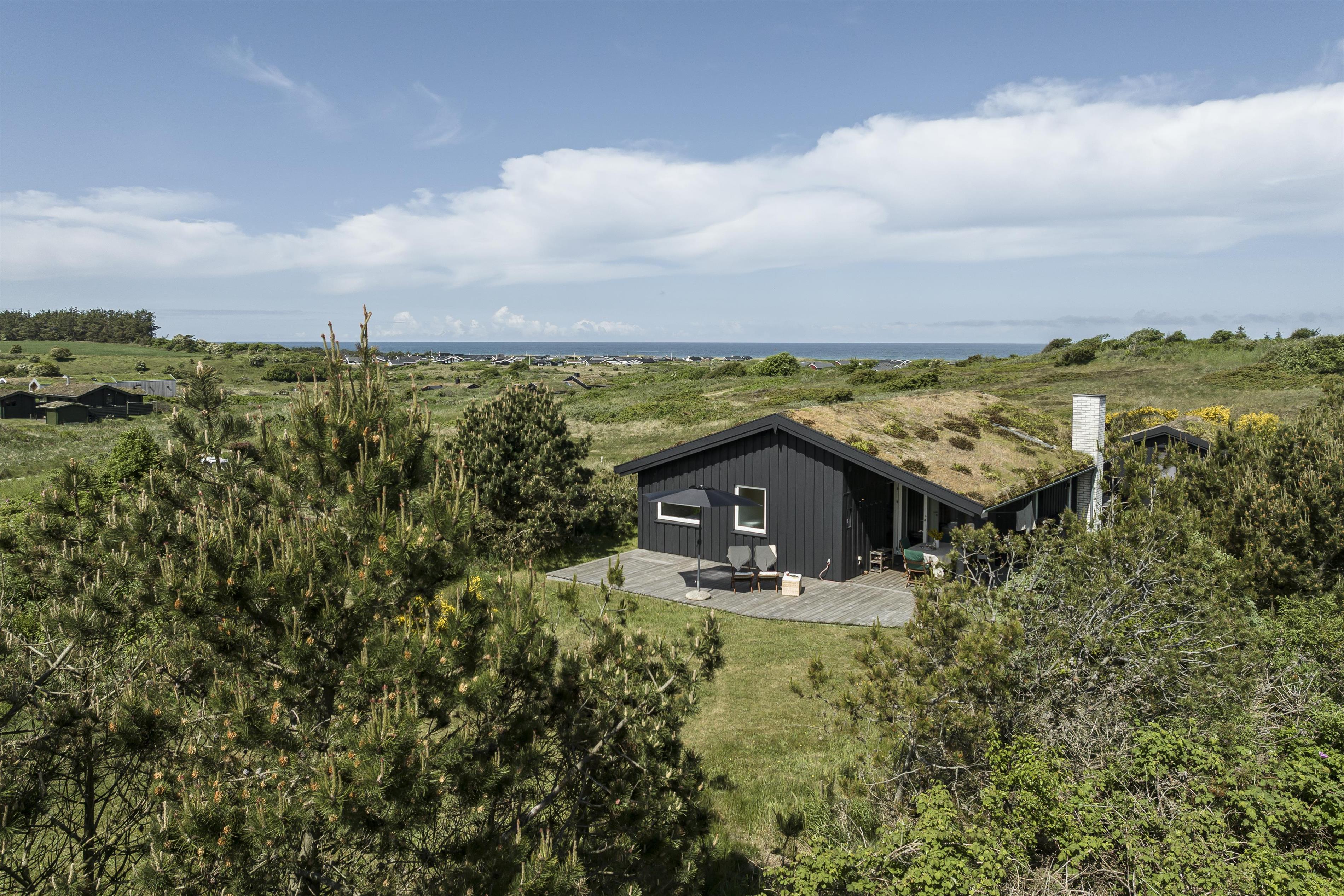 Fra feriehuset har I direkte adgang til flere skønne terrasser, hvoraf de 2 er overdækkede. Den vestvendte terasse indbyder til at samles omkring bordet til en dejlig middag og lange sommeraftener med solnedgang i baggrunden. Her kan I nyde udsigten over det kuperede klitlandskab - I er helt ugeneret her og med god afstand til nærmeste nabo.