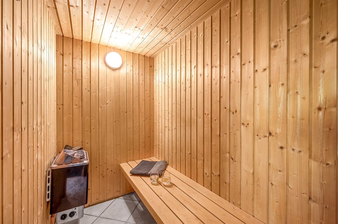 Der er 1 badeværelse med bruseniche og 2 toiletter, heraf 1 gæstetoilet. Der er gulvvarme på 1 badeværelse. Der er gulvvarme på gæstetoilettet. I saunaen er der mulighed for afslapning.