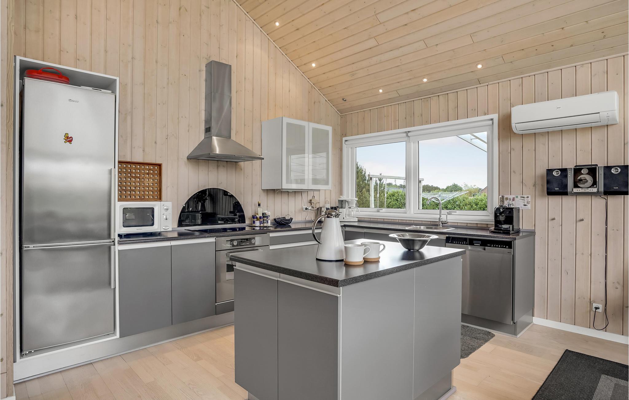 Dette komfortable og rummelige feriehus venter på jer i gåafstand fra stranden. Stå op til den smukke udsigt. Sæt jer til rette i saunaen og spabadet, og efter en begivenhedsrig dag kan I finde jer til rette i opholdsstuen, hvor I kan slappe af ved brændeovnen, streame en god film eller hygge jer.