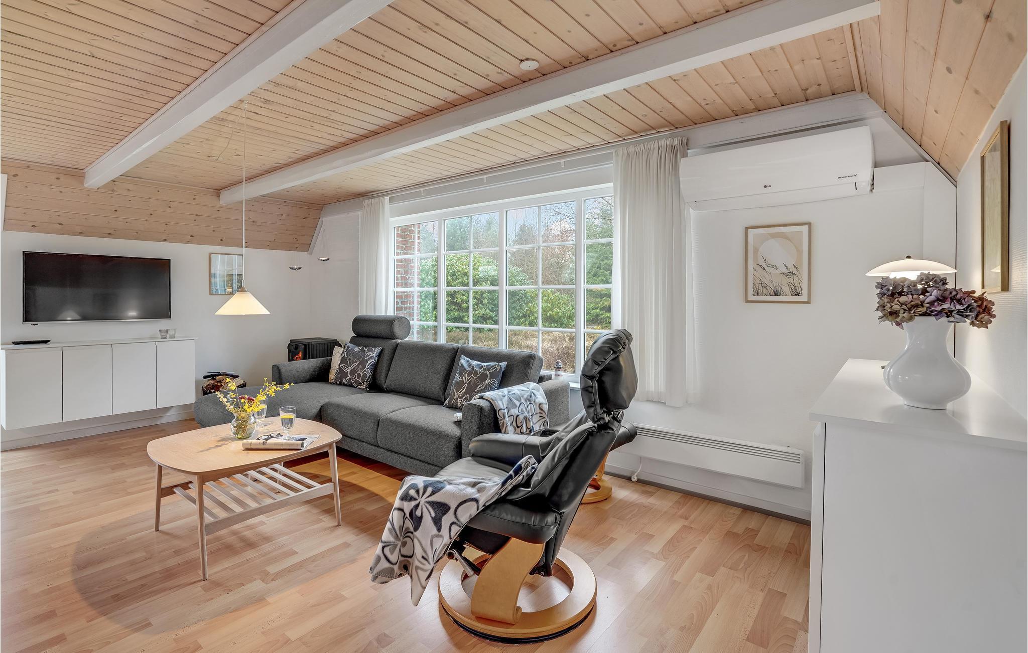 Velkommen til en rolig ferie, hvor I virkelig kan lade op i naturen og nyde pauserne i et dejligt hus. Huset har mange store lysindfald, så her får I en skøn ramme om familiehyggen, når I vender hjem efter en lang dag på farten. I opholdsrummet kan I samles om hyggelige aktiviteter som madlavning, brætspil og gode film, mens ilden knitrer i brændeovnen. I sommerhalvåret kan I sætte jer med dagens måltider på terrassen og nyde tonerne af fuglefløjt, mens I spiser.