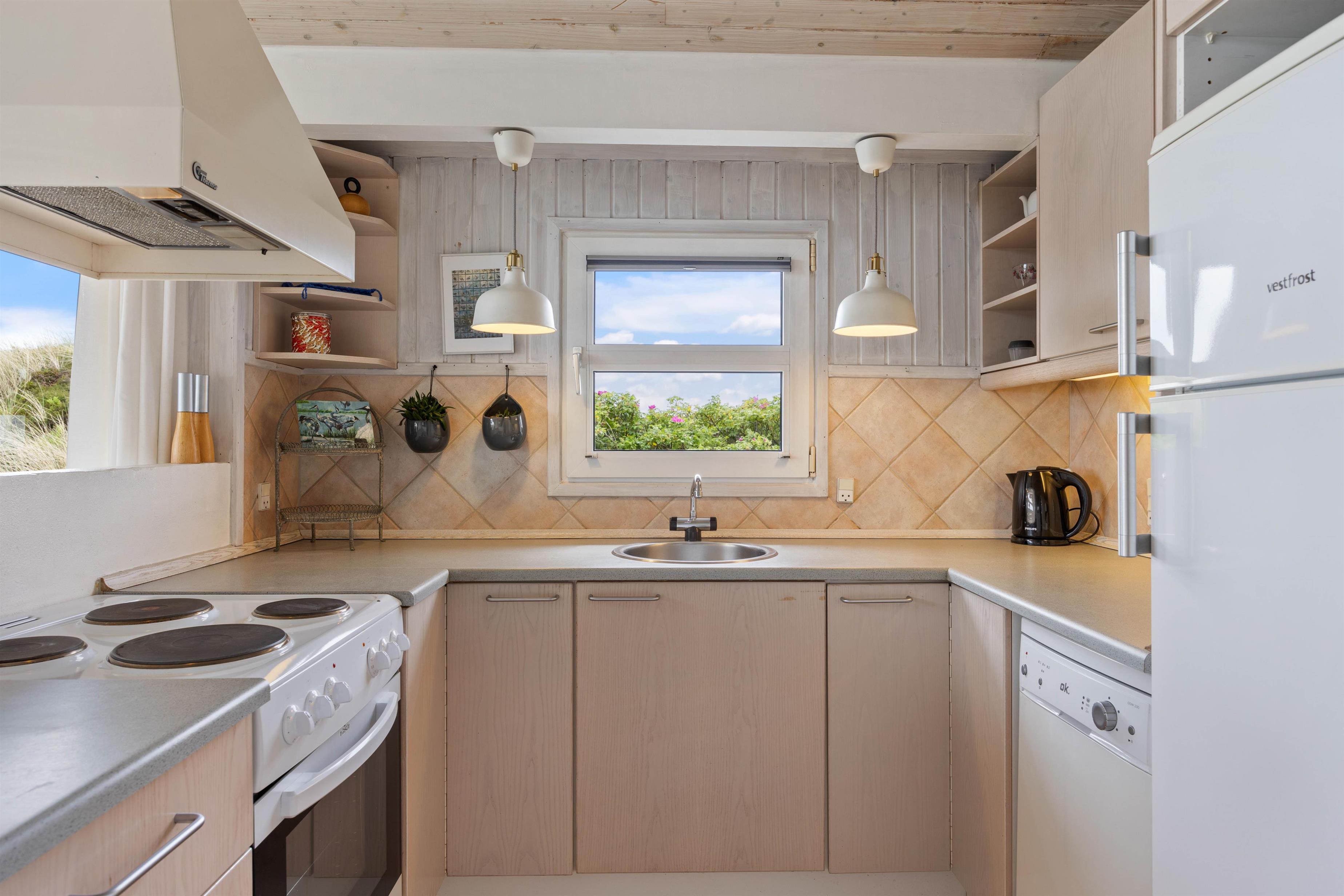 Sommerhuset har en fantastisk belligenhed på en skøn klitgrund med udsigt til fjorden. Fra stuen har i direkte udgang til den dejlige terrasse, som strækker sig fra øst- til vestsiden af feriehuset. En del af terrassen er afskærmet, så I kan sidde i læ for vinden. Dagen kan afsluttes med et lækkert grillmåltid, mens solen går ned i baggrunden.