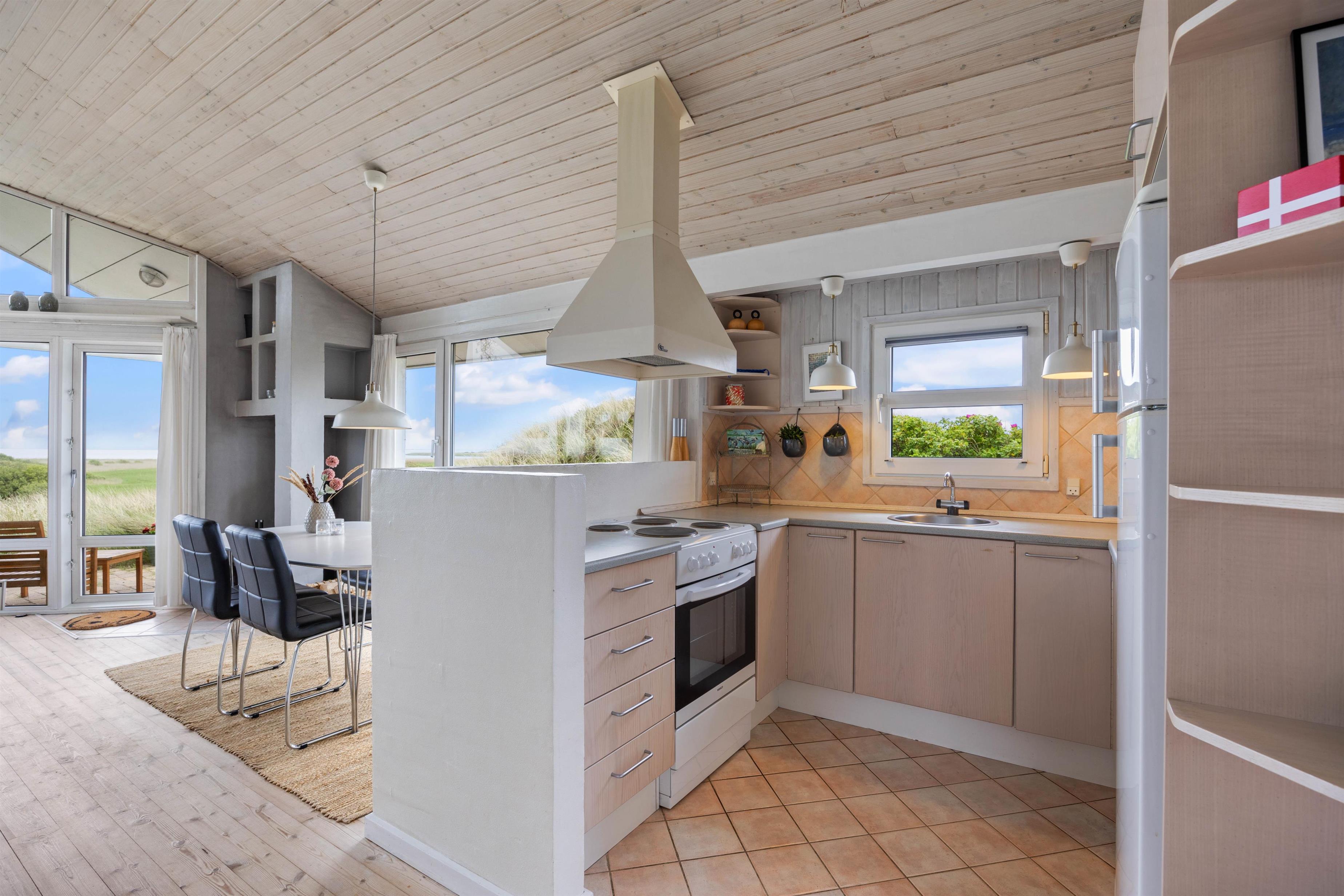Sommerhuset er bygget op omkring et stort fællesrum, hvorfra feriehusets aktiviteter foregår. Uanset, om du står i køkkenet eller sidder i stuen, så har du en fantastisk udsigt til de smukke, flade hedestrækninger og Ringkøbing Fjord.