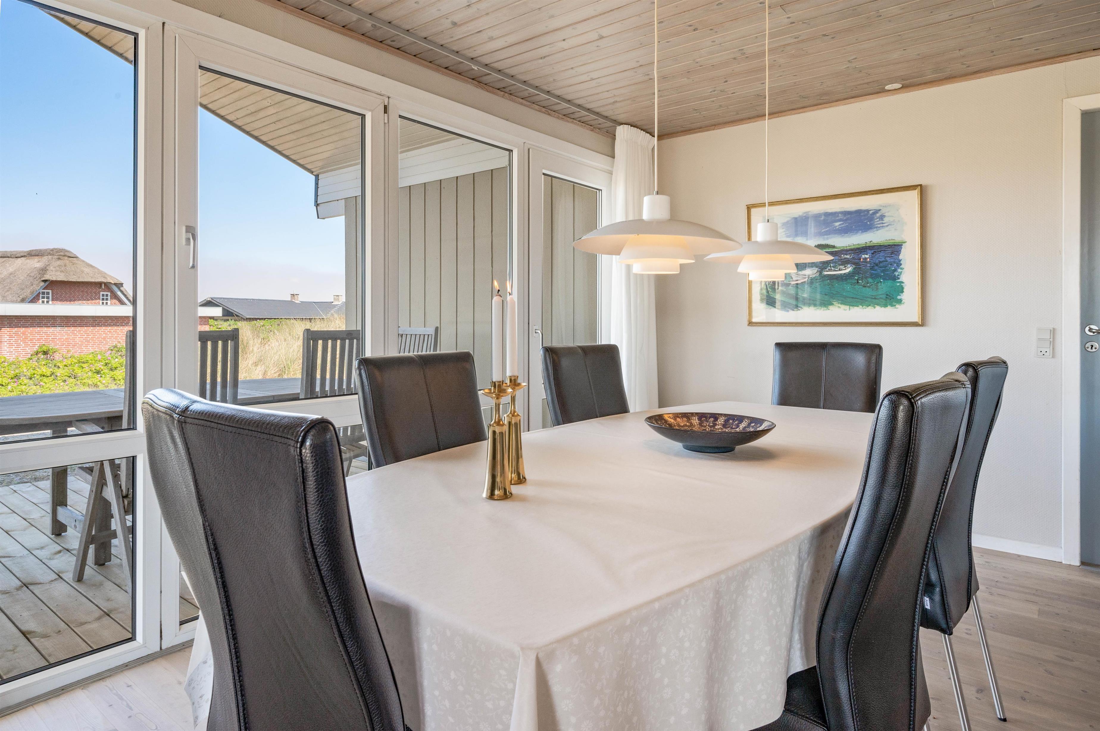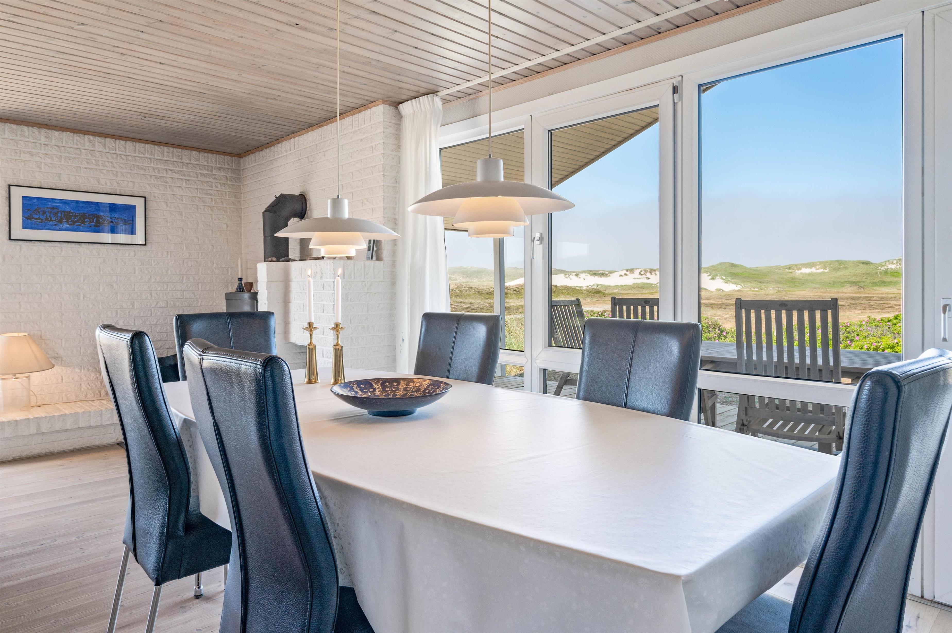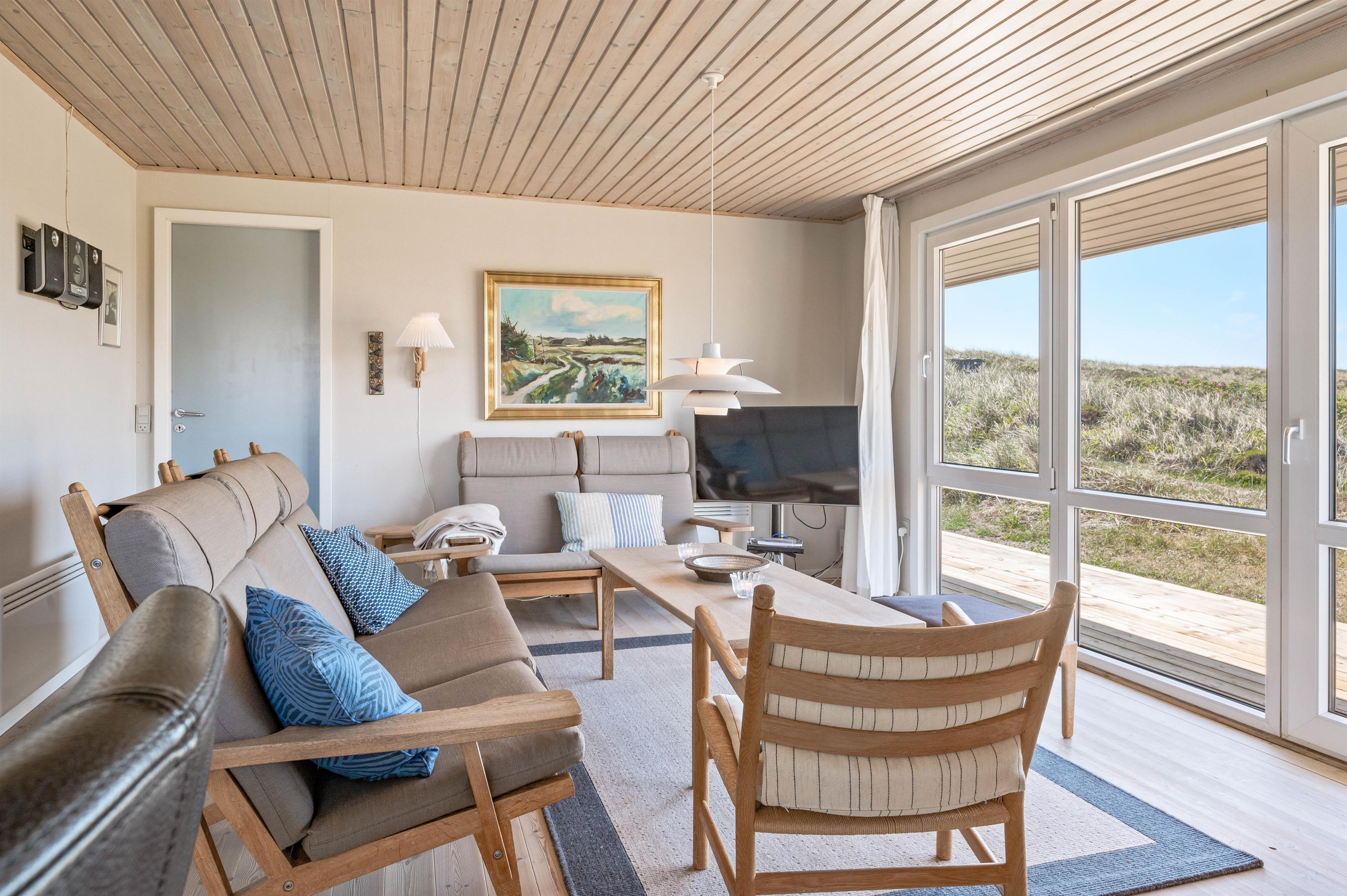 Dette sommerhus er beliggende med en vidunderlig udsigt over det fredede klit- og hedelandskab, som er specielt smukt, når lyngen blomstrer. De store vinduespartier i stuen bringer naturen og lyset helt ind i sommerhuset.