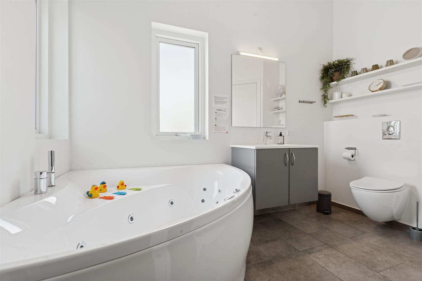 Der er 2 badeværelser med bruseniche og 2 toiletter. Der er gulvvarme på 2 badeværelser. I saunaen er der mulighed for afslapning.