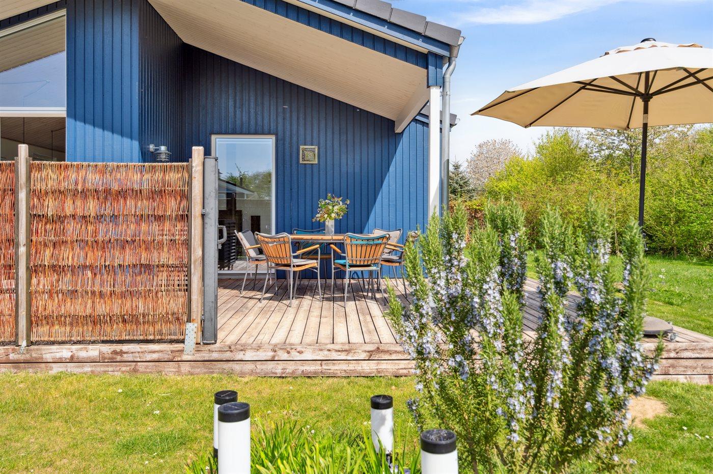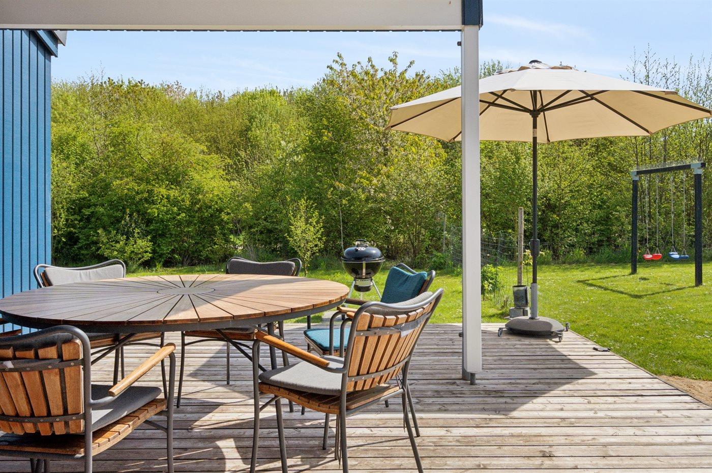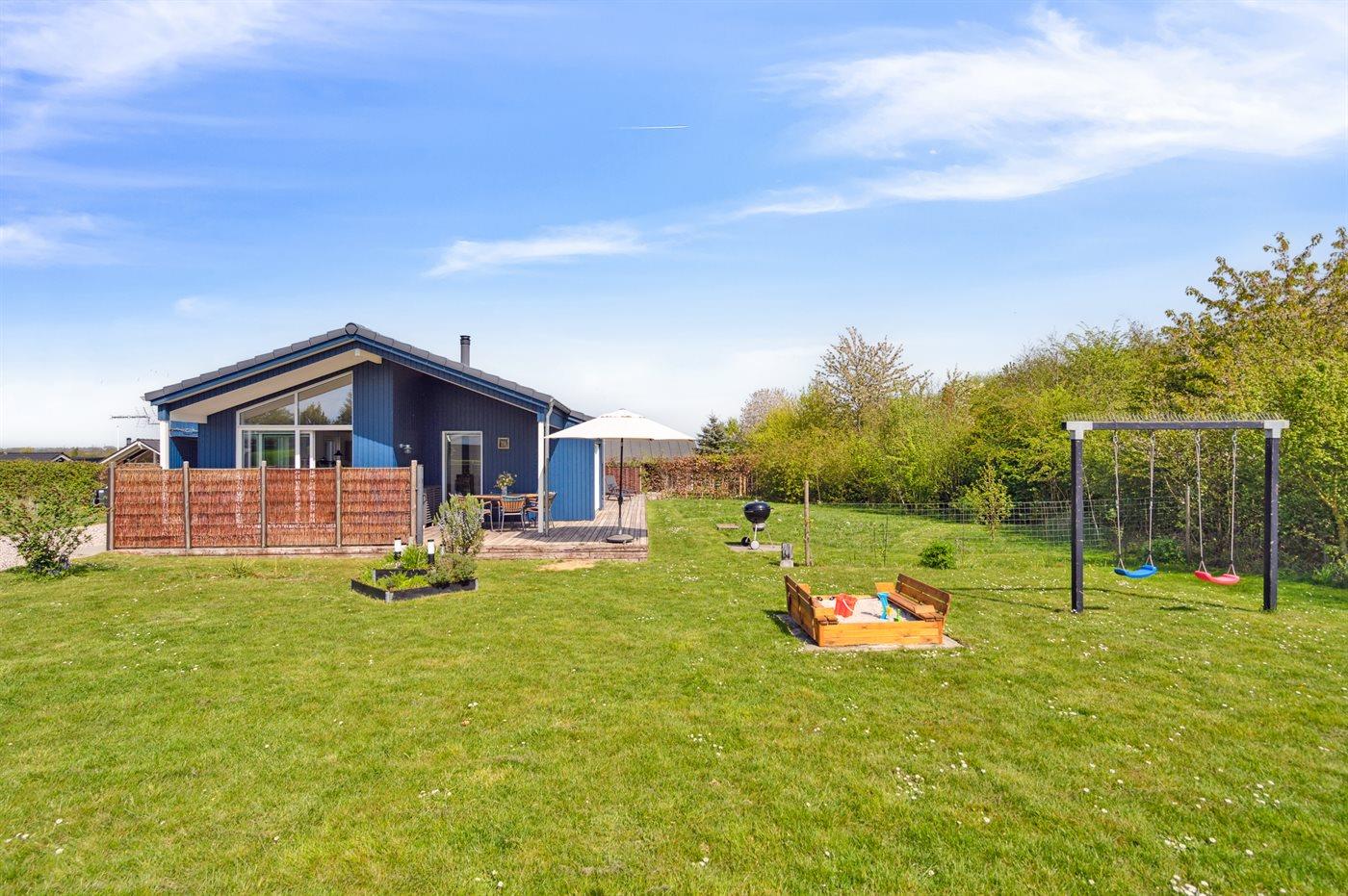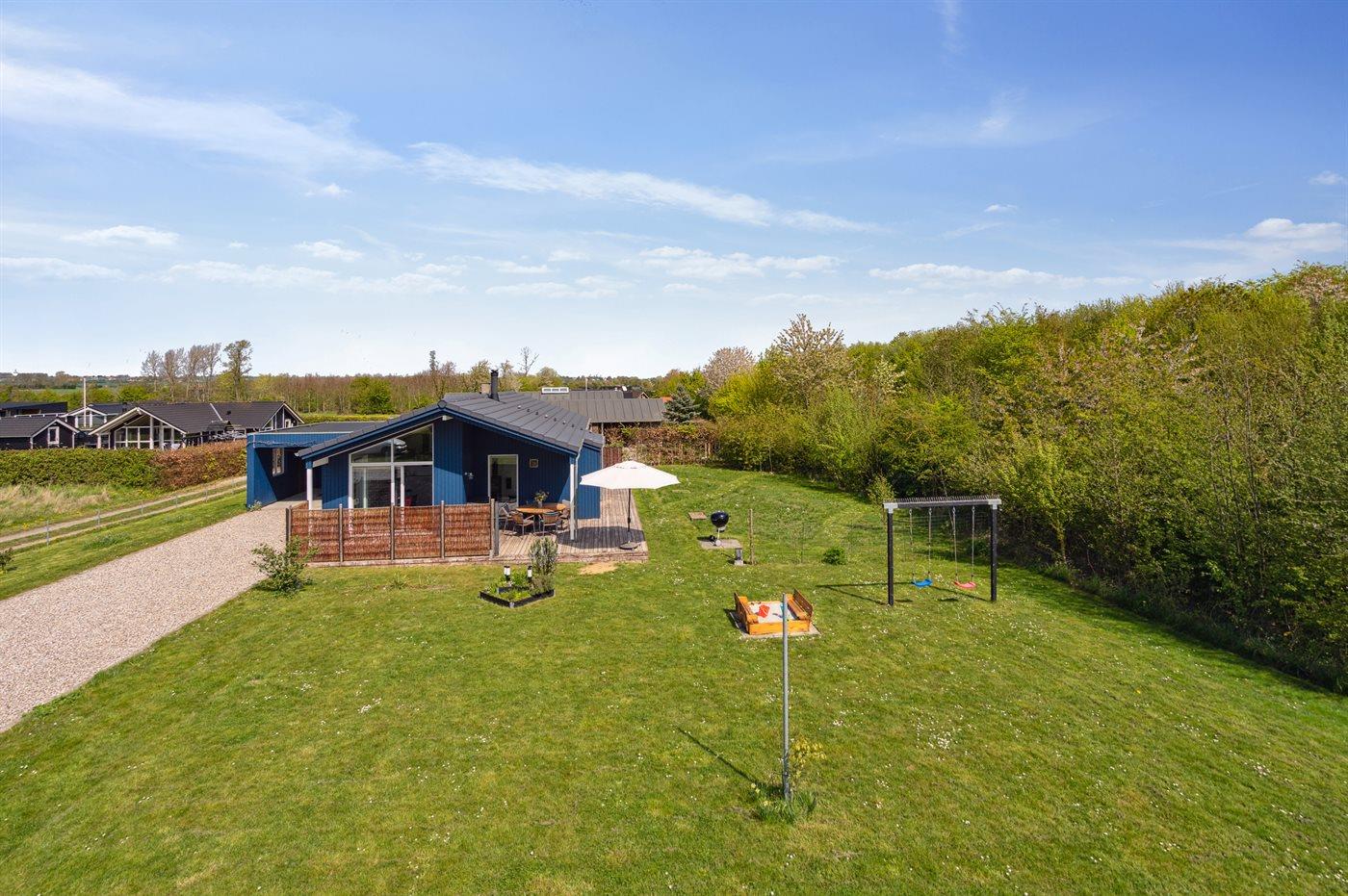 Ferieboligen er beliggende på en 1100 m² stor havegrund. Der er 700 m til havet. Nærmeste forretning er beliggende i en afstand af 1500 m. Der er en golfbane i en afstand af 16000 m. Til ferieboligen hører åbent og 23 m2 overdækket terrasseareal/indgang. Gynge. Sandkasse. Grill til rådighed. Der er installeret stik til opladning af elbil. Type 2 stik. Med 11 kW ladeeffekt. Parkering ved ferieboligen.