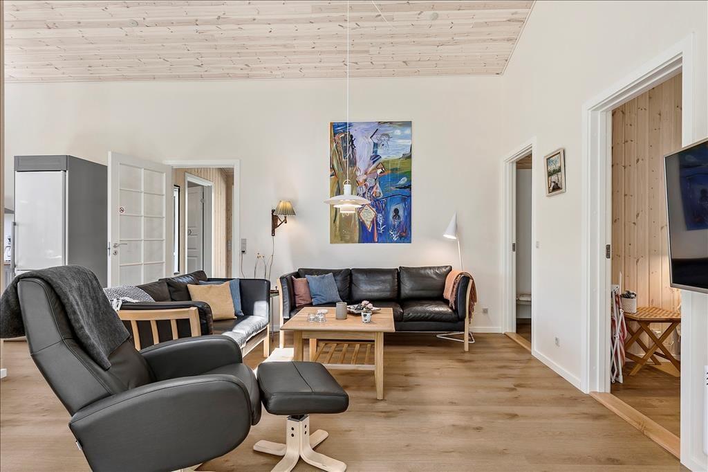 Det 100 m2 store sommerhus er opført i 2021, og som et byggeri af høj kvalitet giver det jer en særdeles skøn og stemningsfuld ramme om ferielivet. Stuen er et herligt opholdsrum med flotte gulve, ovenlysvinduer og store vinduer vendt mod tre verdenshjørner. Det åbne køkken passer godt ind i rummet – og så er det rart, at man kan stå for madlavningen, mens man fortsat tager del i hyggen med resten af familien. To af husets soveværelser er udstyret med komfortable dobbeltsenge, mens det tredje byder på en køjeseng, og på det stilfulde badeværelse er der gulvvarme og glasbruseniche med rainshower.