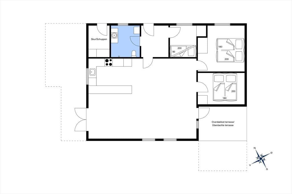 Fra opholdsrummet har I direkte adgang til to skønne fliseterrasser: Den sydøstvendte er delvist overdækket, og på vestsiden af sommerhuset ligger et helt åbent opholdsareal. Ligesom sommerhuset er grundens græsplæne nyanlagt, men randbeplantningen er af ældre dato, så den skærmer haven godt af.
