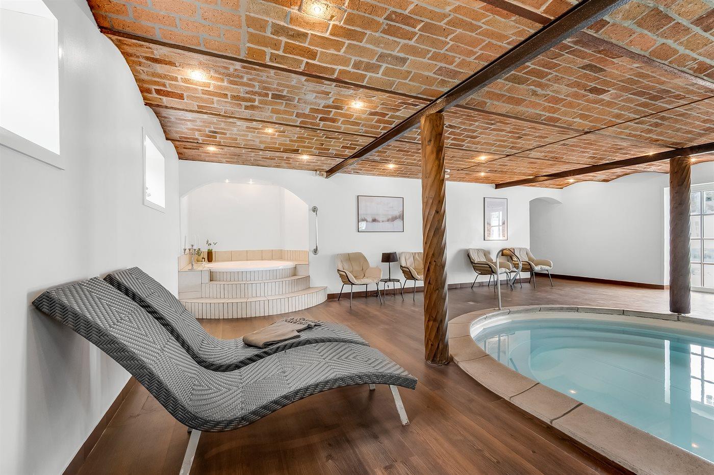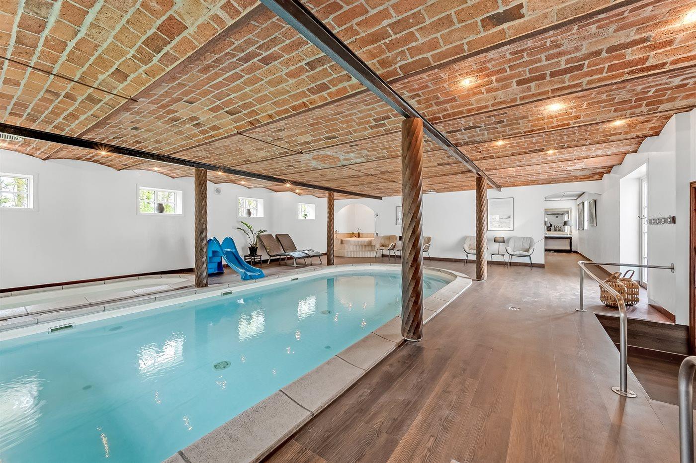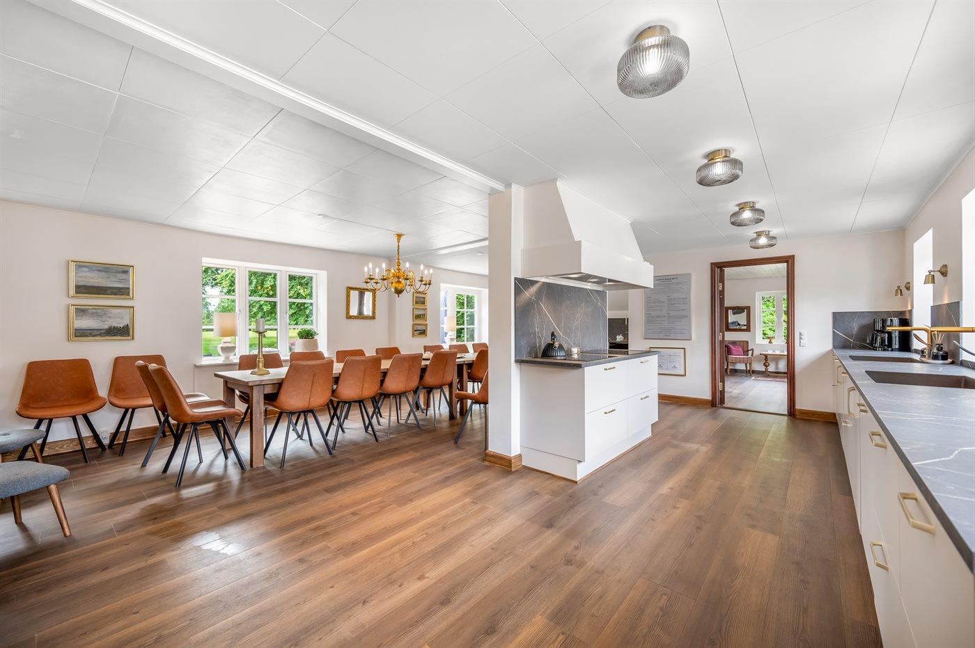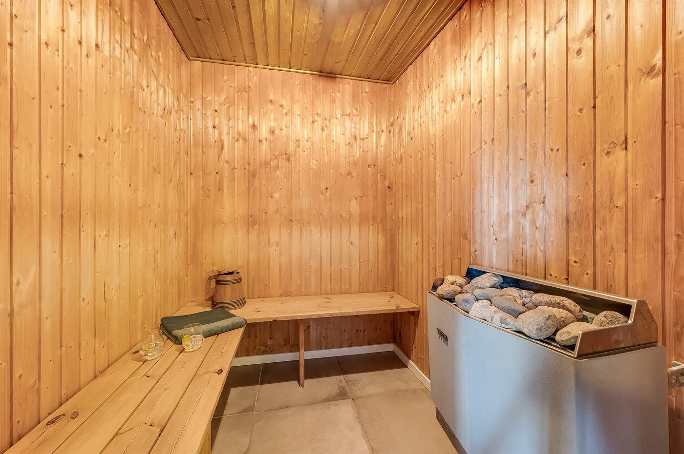 De synlige trækonstruktioner, de smukke stengulve og det hvælvede loft i poolafdelingen giver huset en varm og rustik atmosfære. Den rummelige spisestue med plads til 24 personer ligger i åben forbindelse med det veludstyrede køkken.