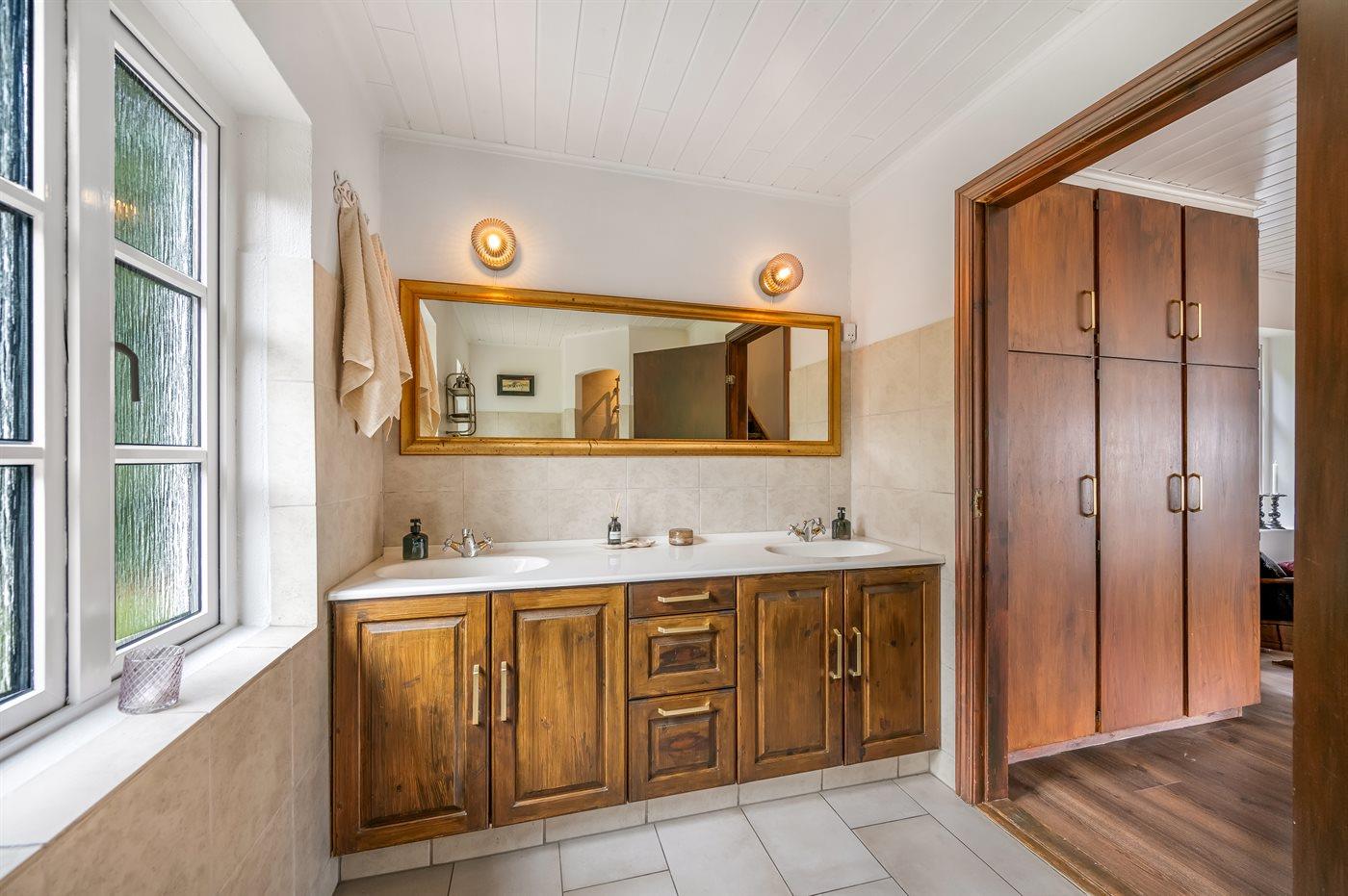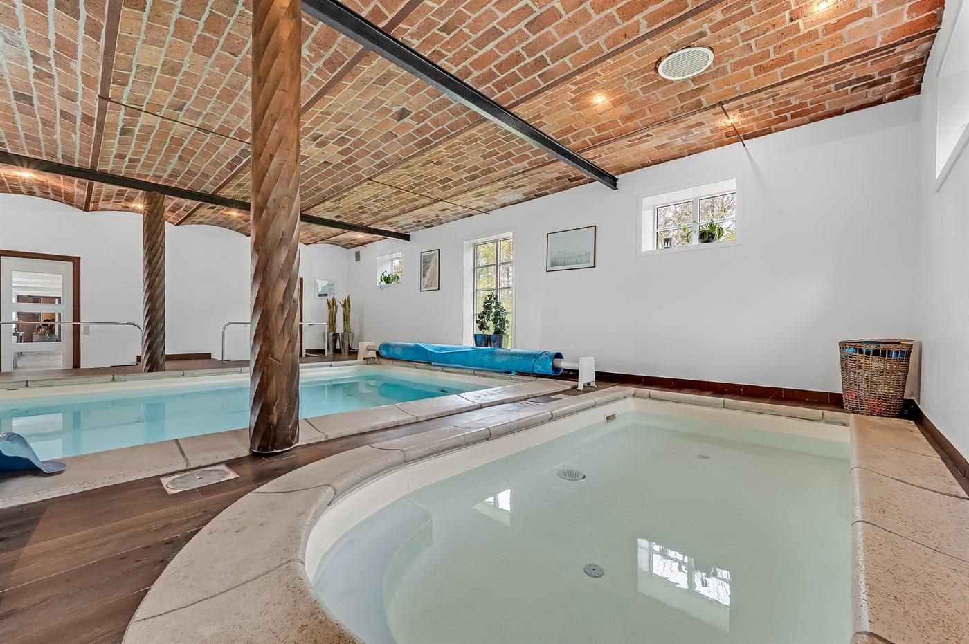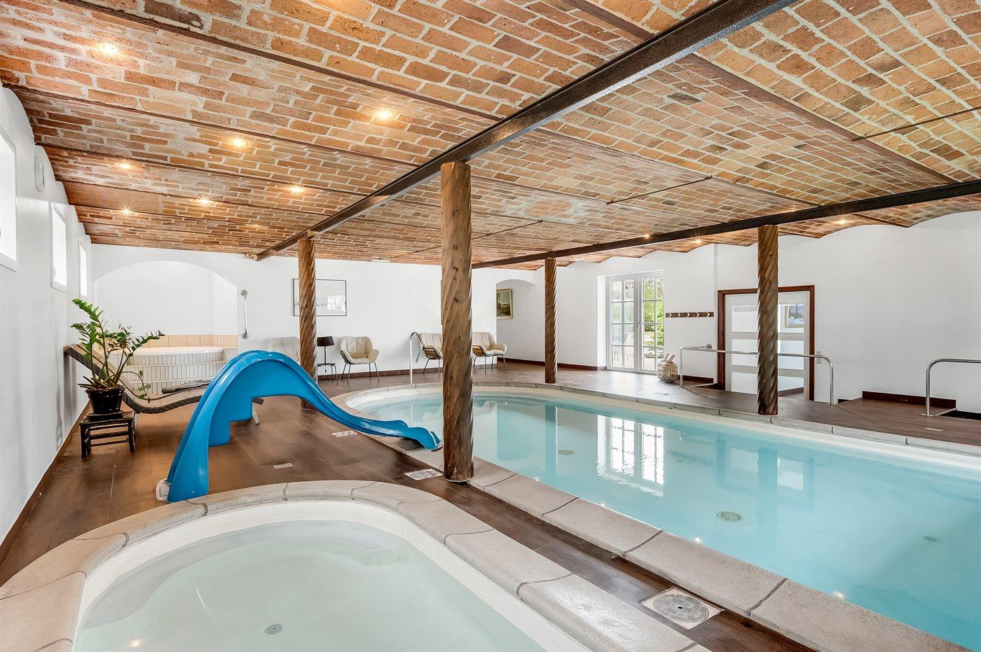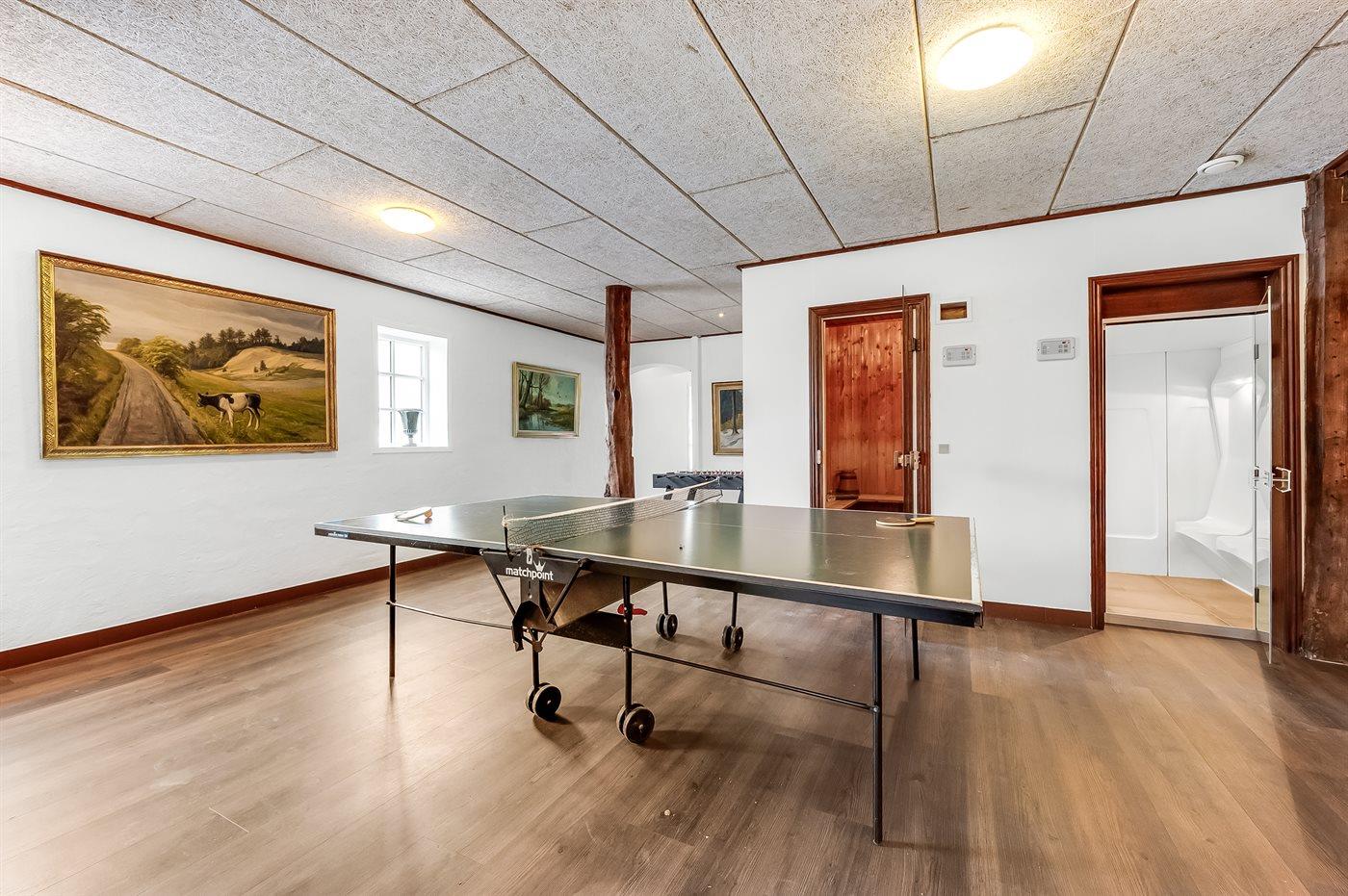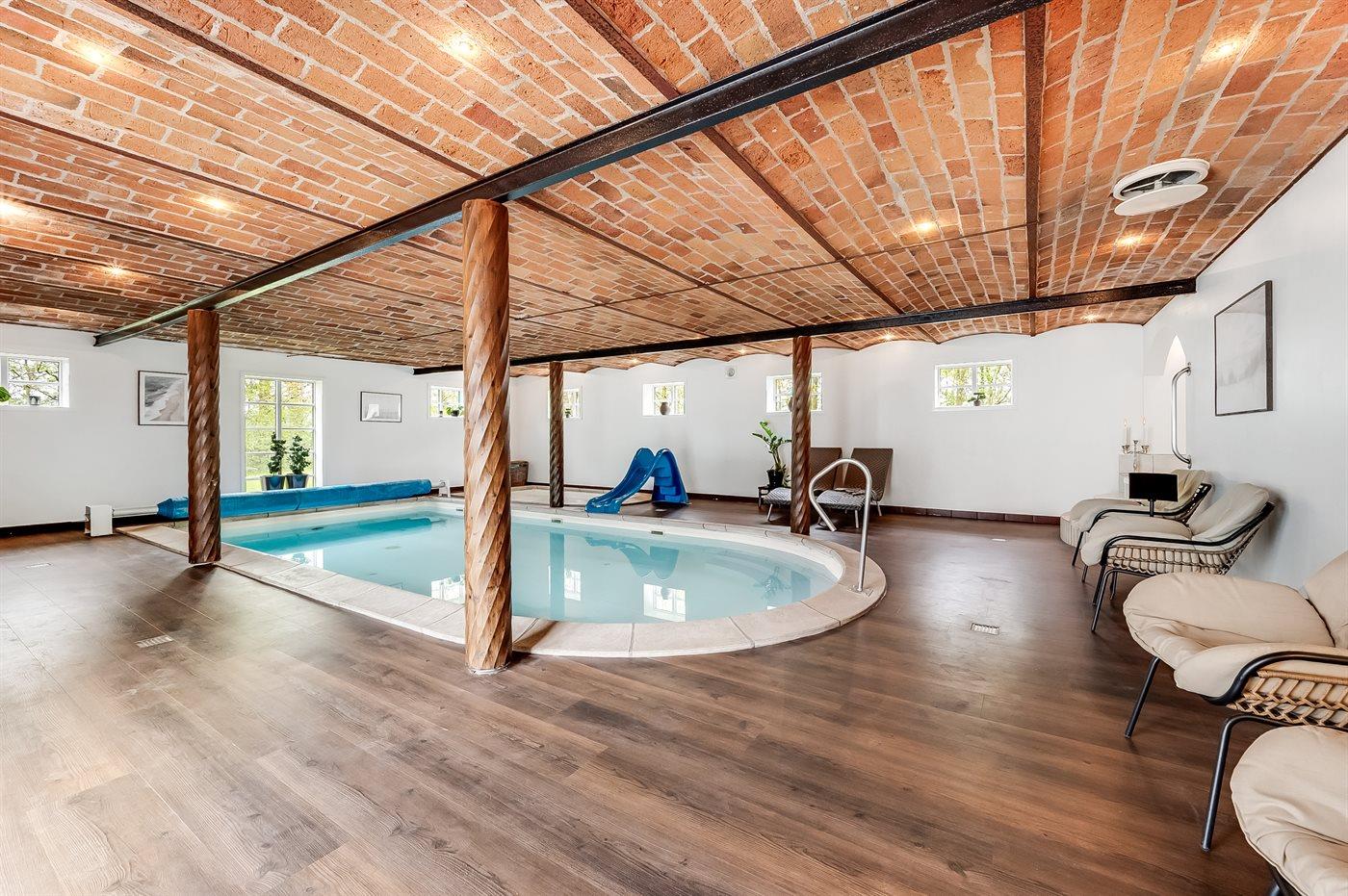 De synlige trækonstruktioner, de smukke stengulve og det hvælvede loft i poolafdelingen giver huset en varm og rustik atmosfære. Den rummelige spisestue med plads til 24 personer ligger i åben forbindelse med det veludstyrede køkken.