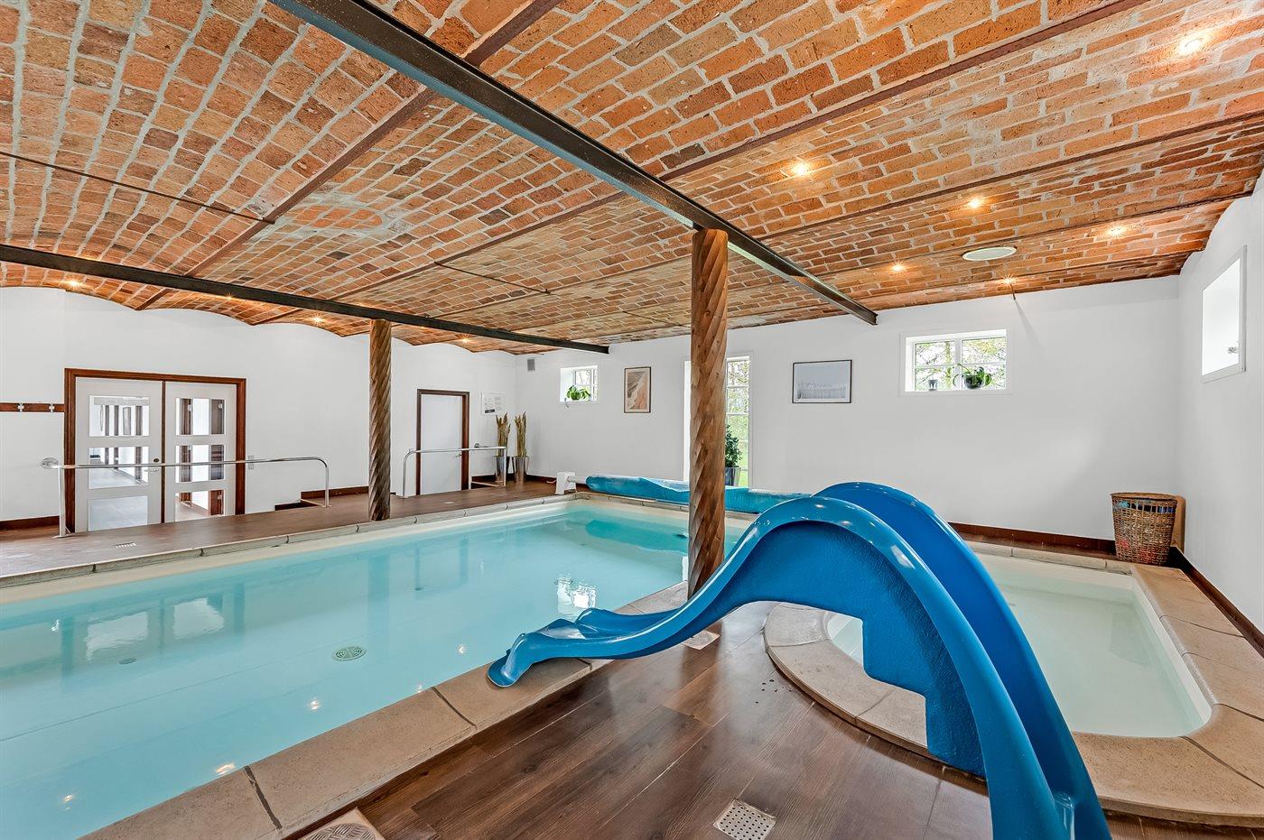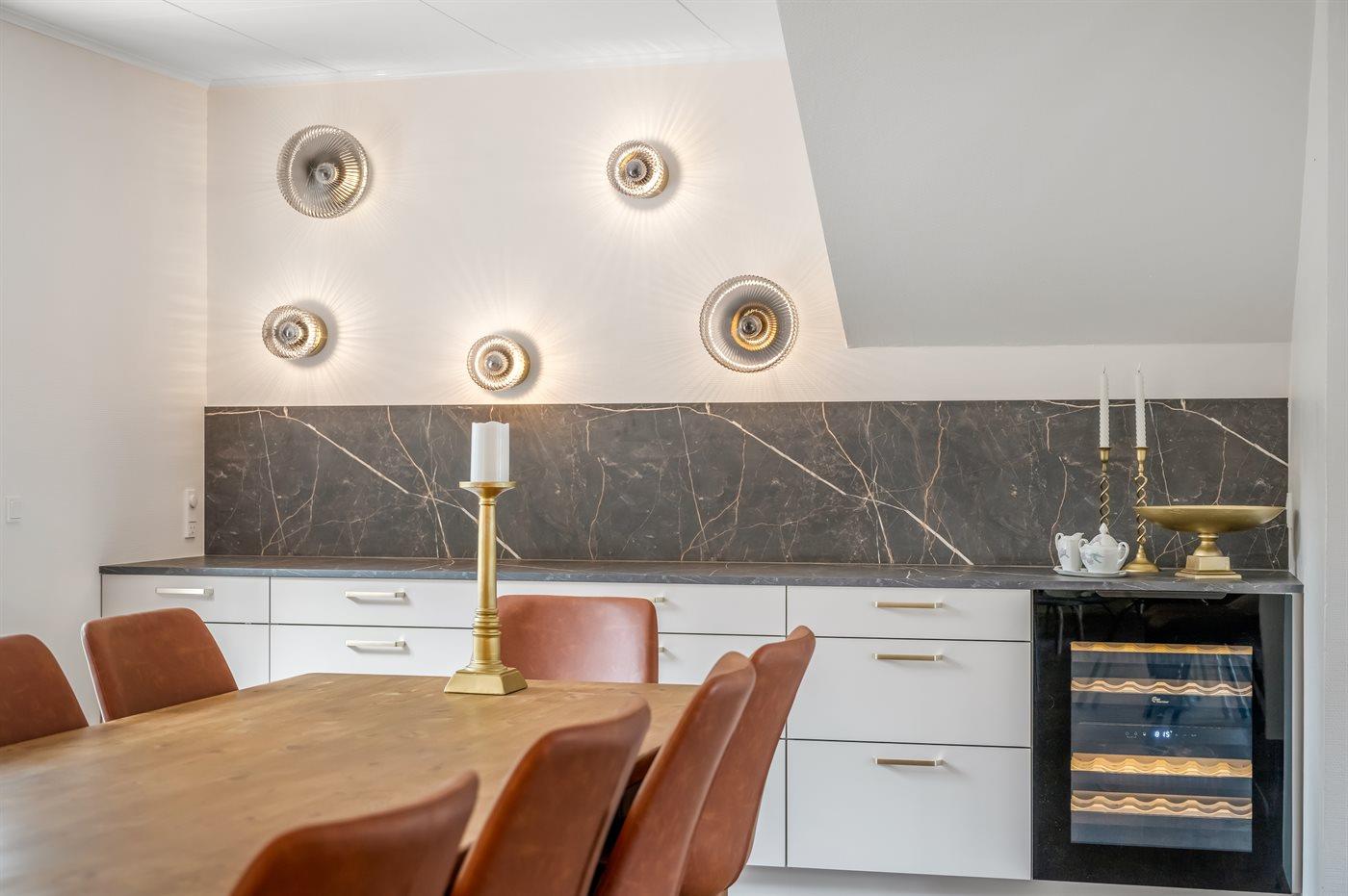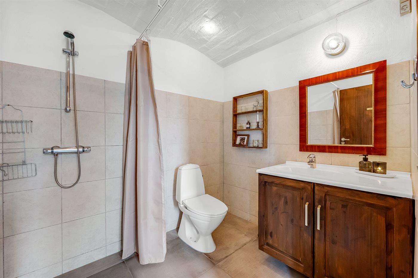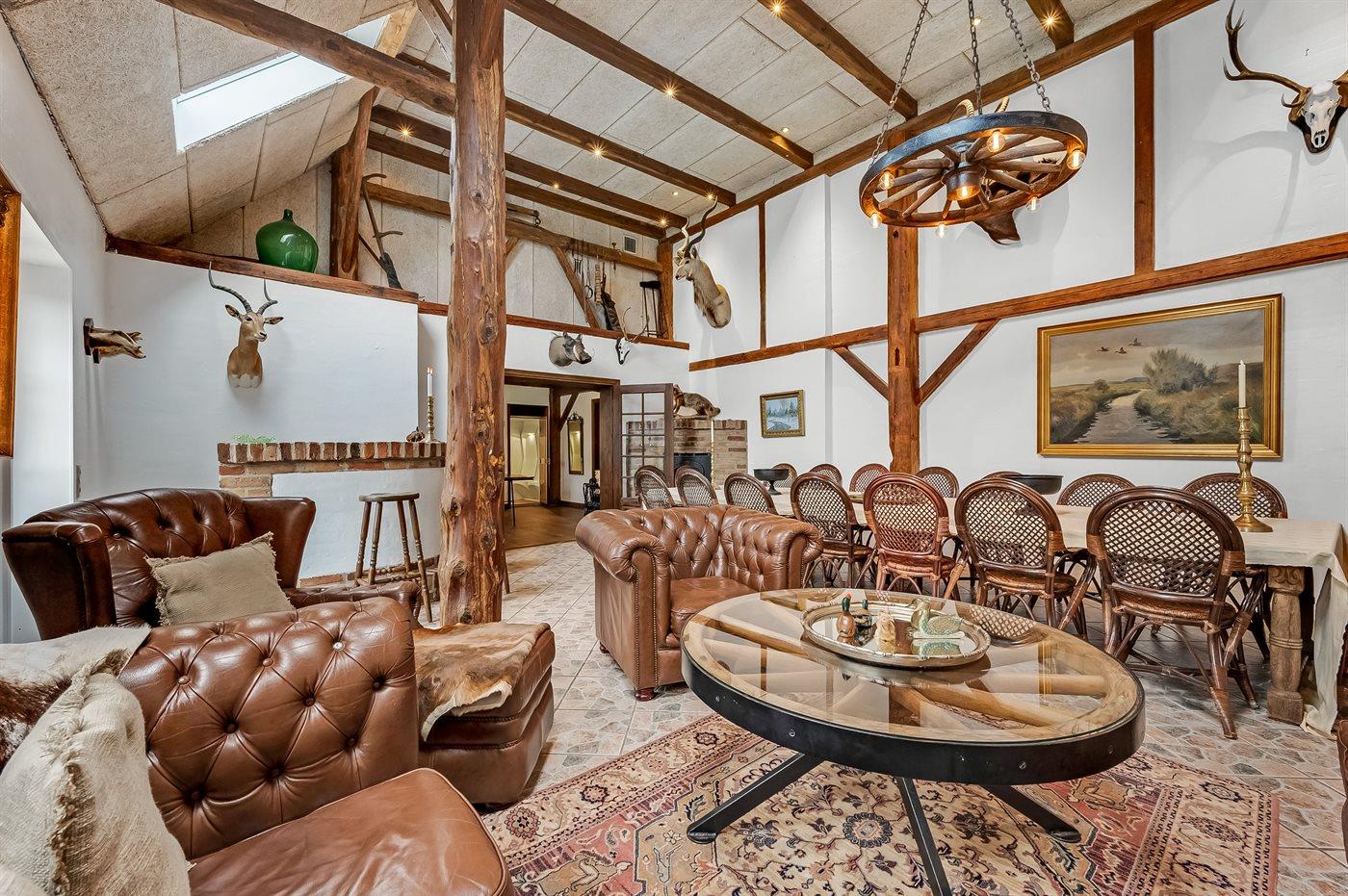 De synlige trækonstruktioner, de smukke stengulve og det hvælvede loft i poolafdelingen giver huset en varm og rustik atmosfære. Den rummelige spisestue med plads til 24 personer ligger i åben forbindelse med det veludstyrede køkken.