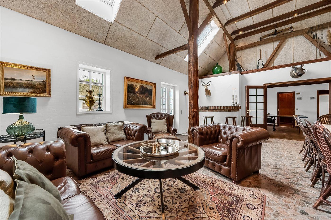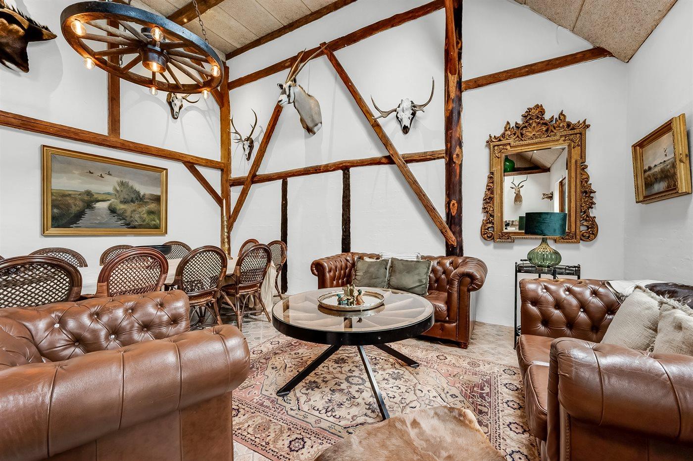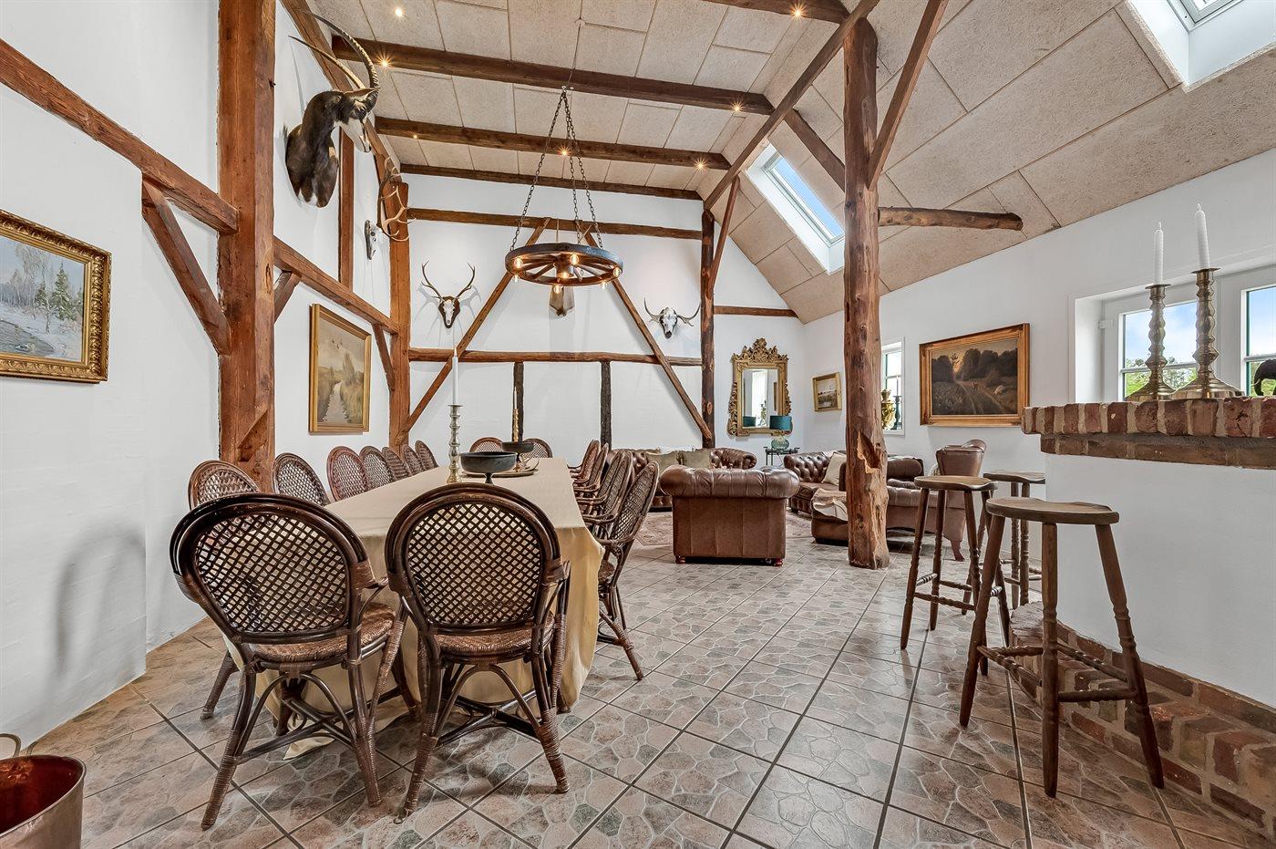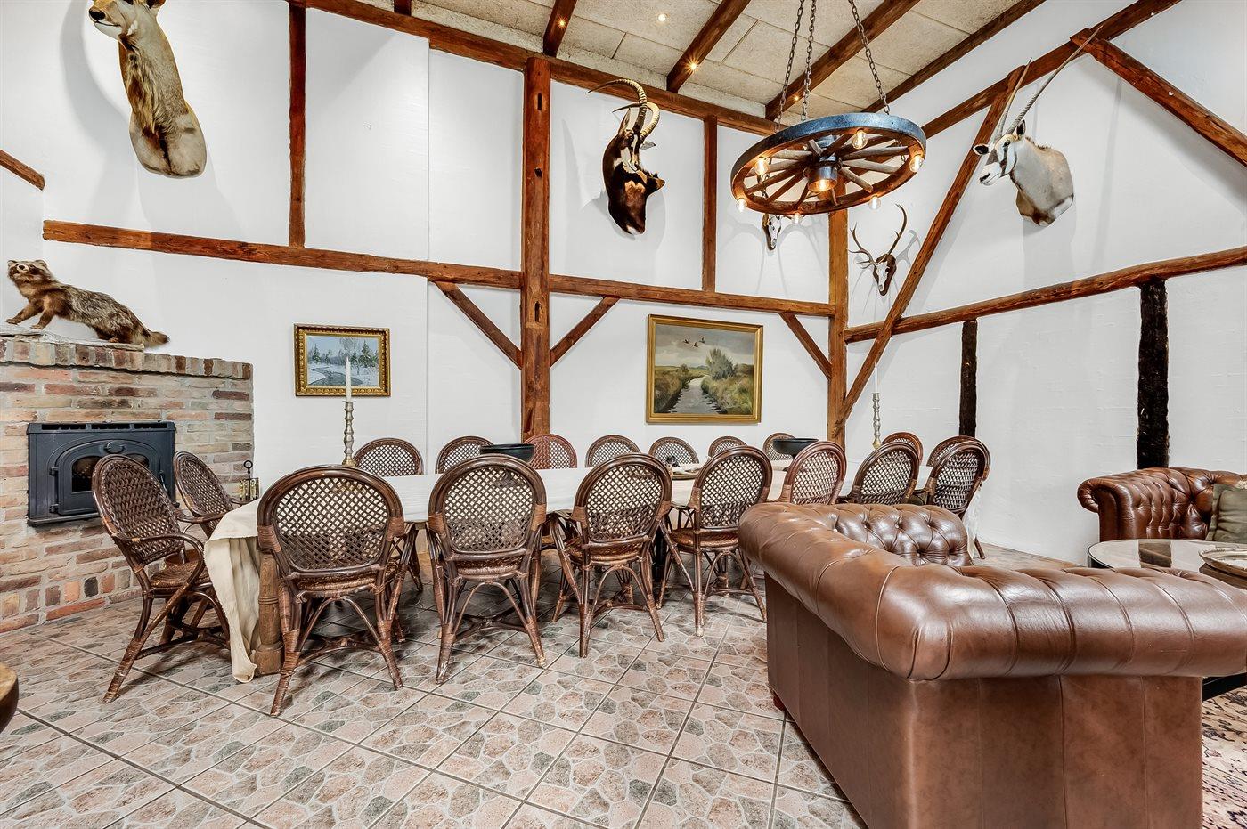 Husets jagtstue er indrettet med spiseplads til 18 personer og indbyder til hyggelige stunder. Med fritlagte bjælker, rå støttepæle, kakkelovn og bar emmer rummet af jagthytte-stemning. Rundt omkring i huset findes små hyggekroge med siddepladser, hvor man kan slappe af, spille spil og nyde hinandens selskab.
