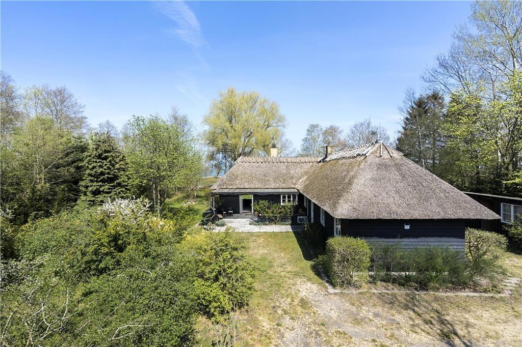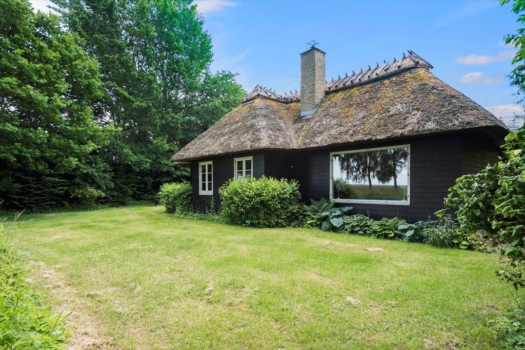 Smuk vinkelbygget feriebolig med stråtag og fantastisk beliggenhed i 1. række lige ud til den dejlige børnevenlige strand med badebro i Strøby Ladeplads.