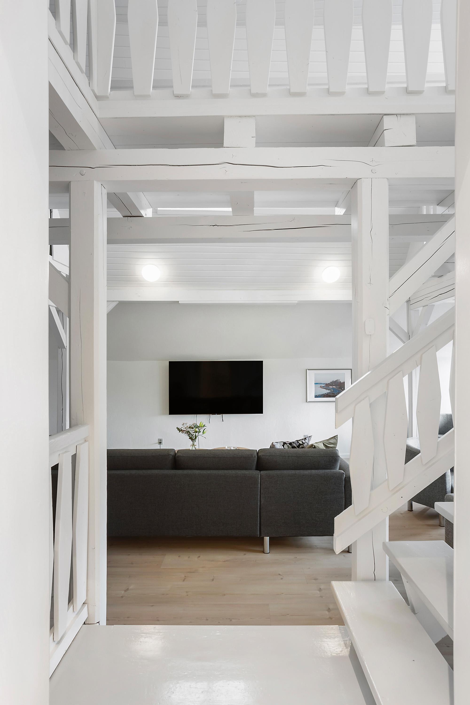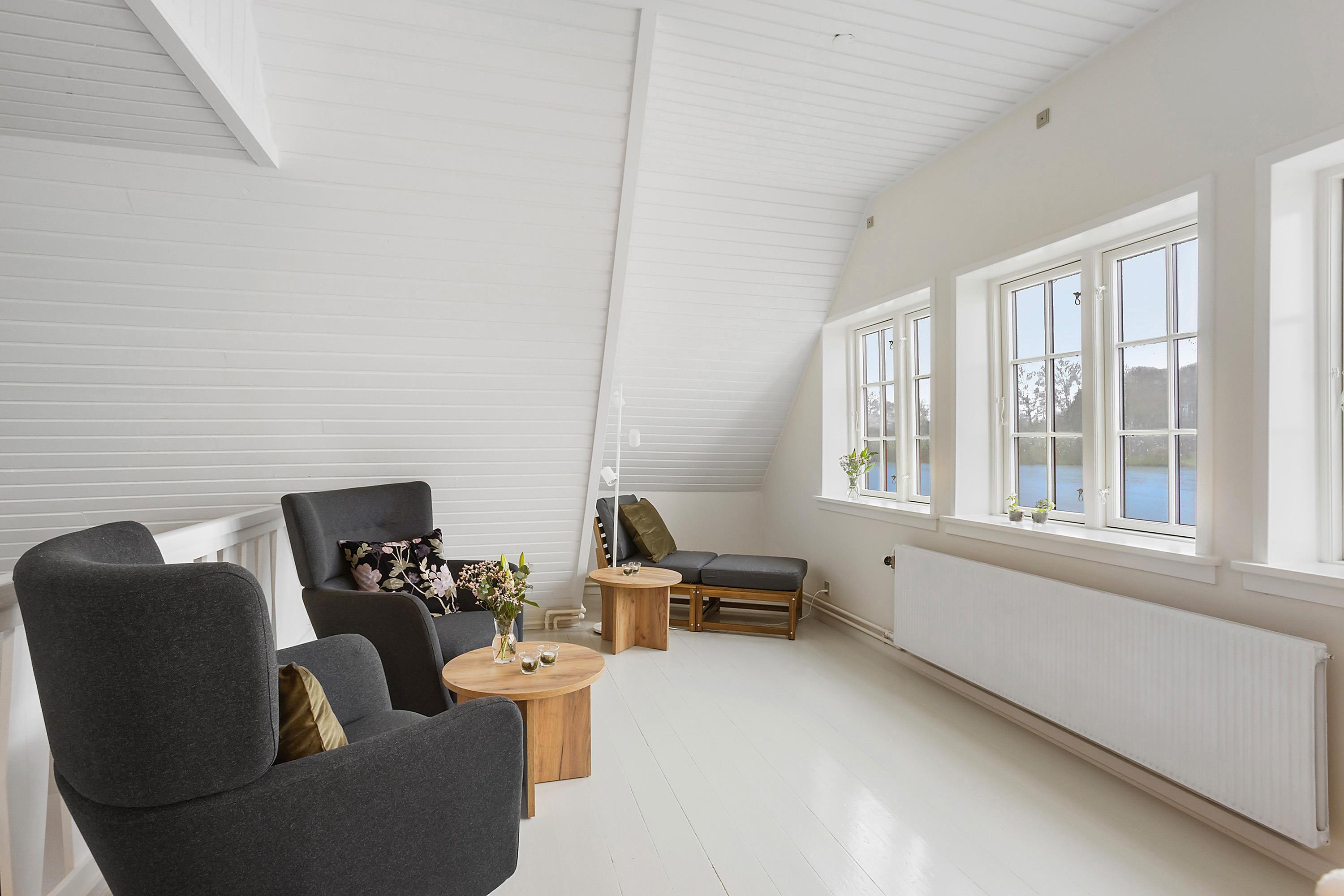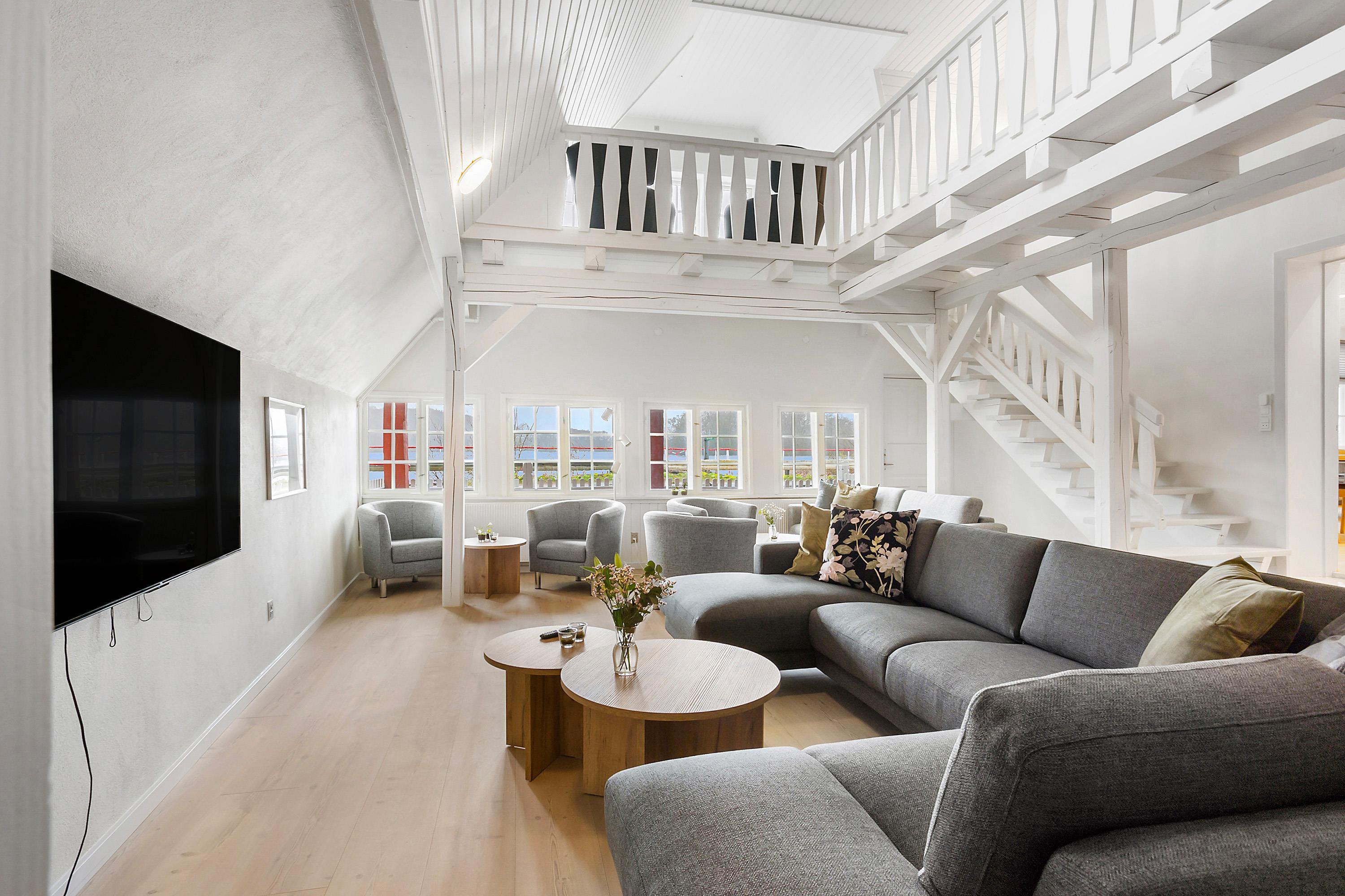 Huset er indrettet med entré, stort køkken/alrum med adgang til stor charmerende opholdsstue med synlige bjælker og adgang til hyggelig 1. sal/repos med loungeområde og udsigt over Hvidkilde Sø, samt hyggehjørne med TV/spillehjørne til familiens yngre medlemmer. I opholdsstuen er der desuden adgang til 2 toiletter.