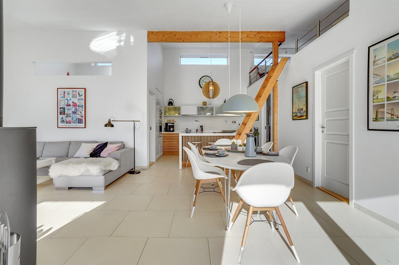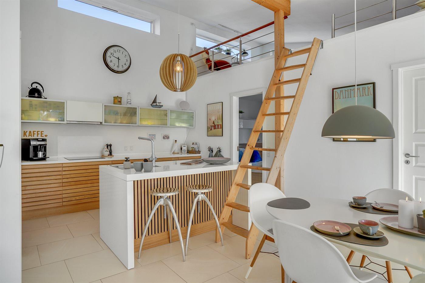 Køkkenet er udstyret med 1 køleskab. Der er 4 induktionskogeplader, varmluftovn, mikrobølgeovn samt opvaskemaskine Der er desuden installeret en kogende vandhane.