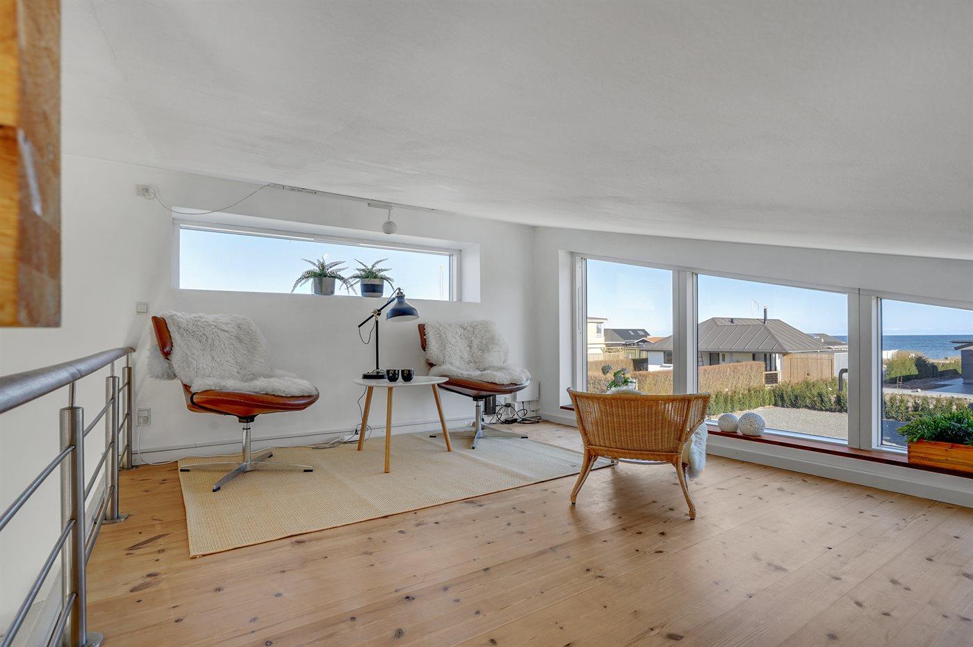 Huset er rummeligt med lofter til kip og smagfuldt indrettet. Fra køkkenalrummet er der stige op til hemsen, der er indrettet som et læsehjørne med 2 chaiselong stole. Herfra kan havudsigten nydes fra huset. I det ene værelse er der et fjernbetjent ovenlysvindue. Fra badeværelset er der direkte udgang til udendørs bruser (koldt og varmt vand) i et afskærmet hjørne af terrassen.