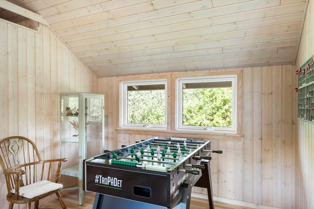 Dette sommerhus på Kronvildtvej 20 må være lidt af et drømmehus for familier, der elsker at lege og have det sjovt. En del af husets opholdsafdeling er nemlig indrettet som et aktivitetsrum, og ude har I masser af plads til at boltre jer i den grønne have – og derudover har I fri adgang til Tranum Feriebys kæmpestore fællesareal, der byder på masser af gratis underholdning.