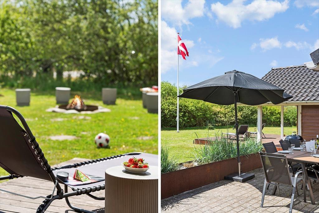 Fra sommerhusets opholdsrum har du direkte adgang til en sydvendt træterrasse, der hurtigt kan blive udnævnt som den foretrukne opholdsplads, når solen skinner. Der er også flisebelagte terrasseområder ved huset, hvis du trænger til at flytte lidt rundt, og hvis du i stedet vil op af havestolen for at bevæge dig lidt, kan du udfordre familien i kroket eller vikingespil. Den slags er der nemlig masser af plads til på den grønne græsplæne på den 1552 m2 store grund, der ligger lidt tilbagetrukket for enden af en lille sidevej til Kronvildtvej – og samtidig bare 100 meter fra feriebyens fantastiske fællesareal.