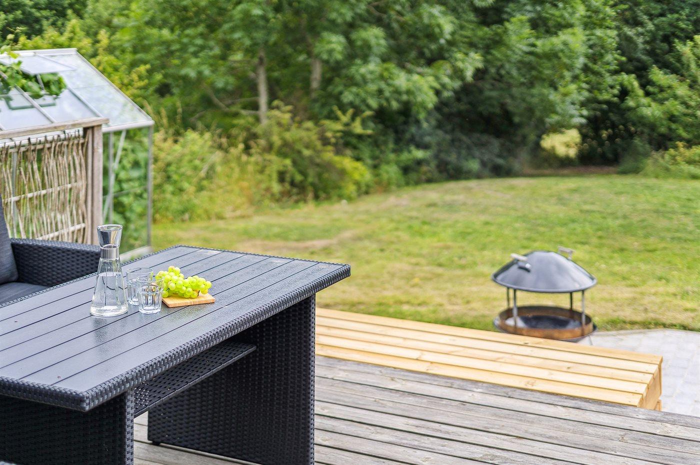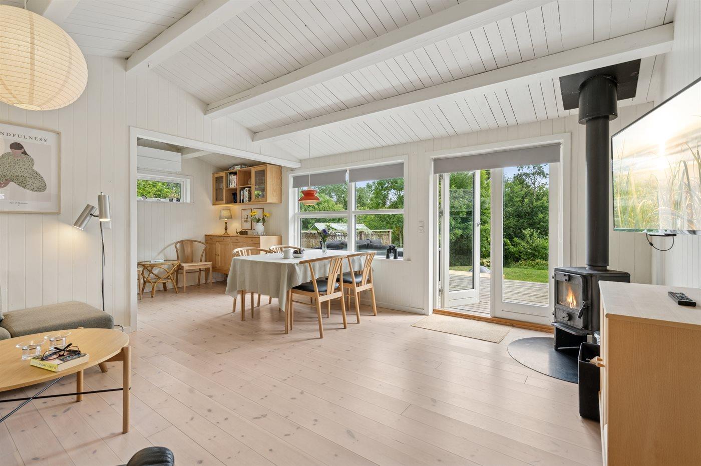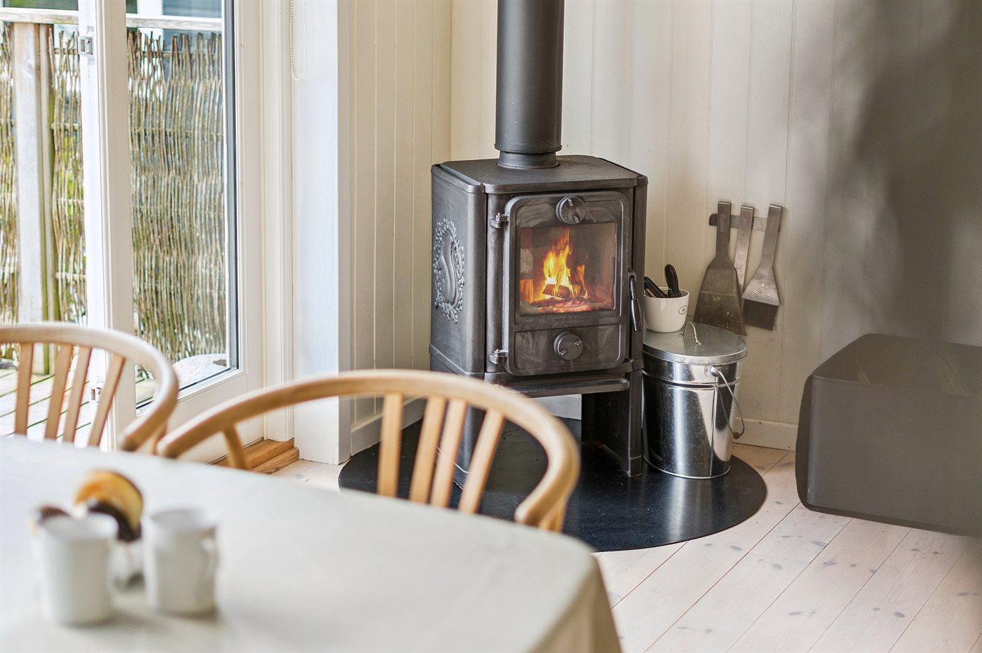 Den hyggelige stue og spiseplads i åben forbindelse med køkkenet er husets samlingspunkt. Her er brændeovn og udgang til et dejligt stort terrasseområde. Der er desuden udekøkken, hvor det under åben himmel er muligt at tilberede maden.