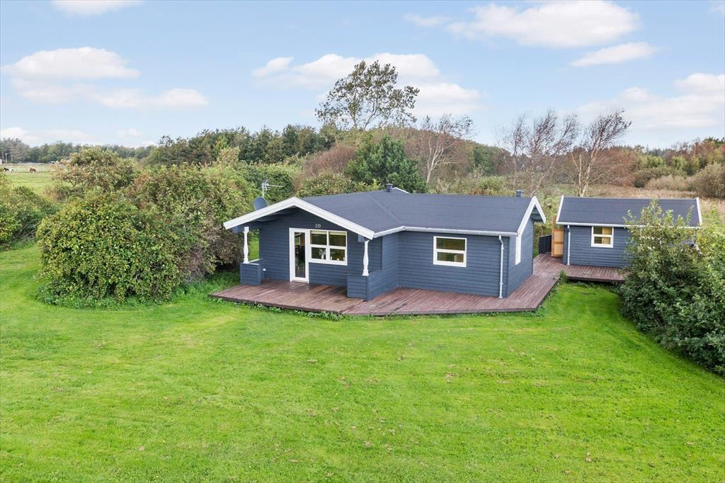Sommerhuset ligger på en fredfyldt grund, hvor du kan være i ét med naturen. På den dejlige terrasse kan du starte dagen med morgenkaffen, mens fuglene synger omkring dig, eller tilbringe afslappende eftermiddage med en god bog i hånden. Terrassen er det perfekte sted at samle familien til grillaftener, hvor I kan nyde hinandens selskab under de lange, lyse sommeraftener. Den omkringliggende natur giver en følelse af privatliv, og her er der plads til både afslapning og leg i det fri.