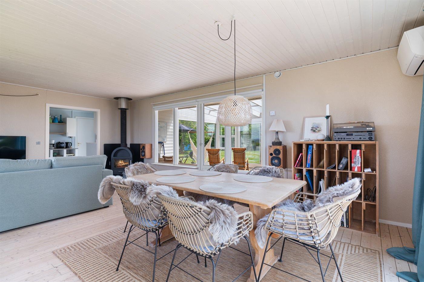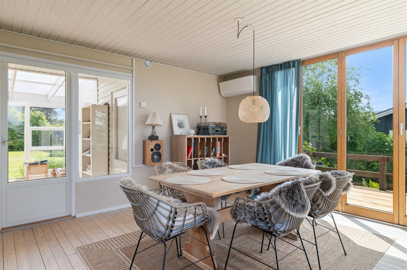 Huset er hyggeligt indrettet og har en skøn udestue på husets bagside - herfra er der udgang til den sydvendte terrasse og haven. I haven er der god plads til udendørs aktiviteter.