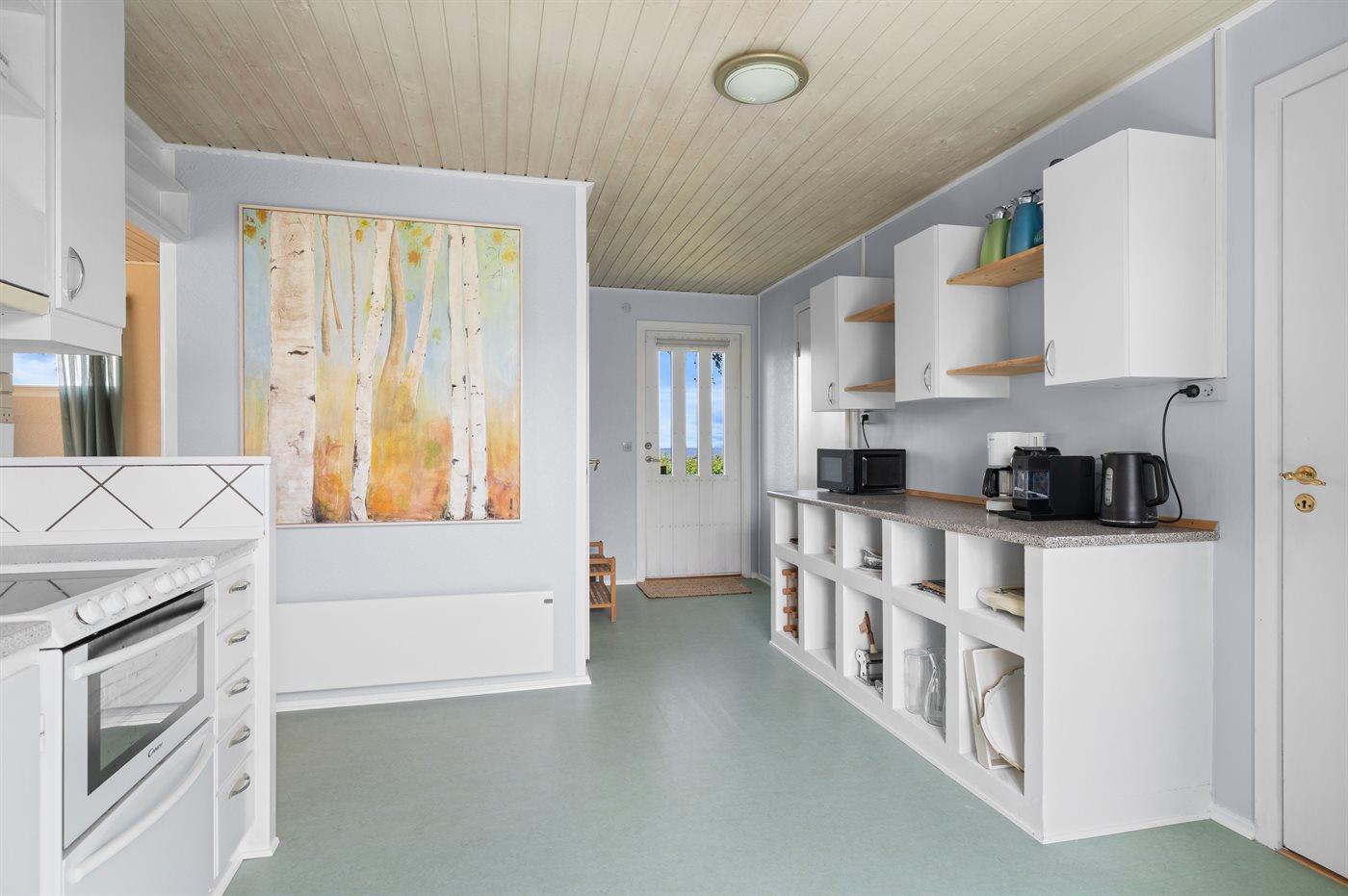 Køkkenet er udstyret med 1 køleskab. Der er 4 keramiske kogeplader, varmluftovn, mikrobølgeovn samt opvaskemaskine.