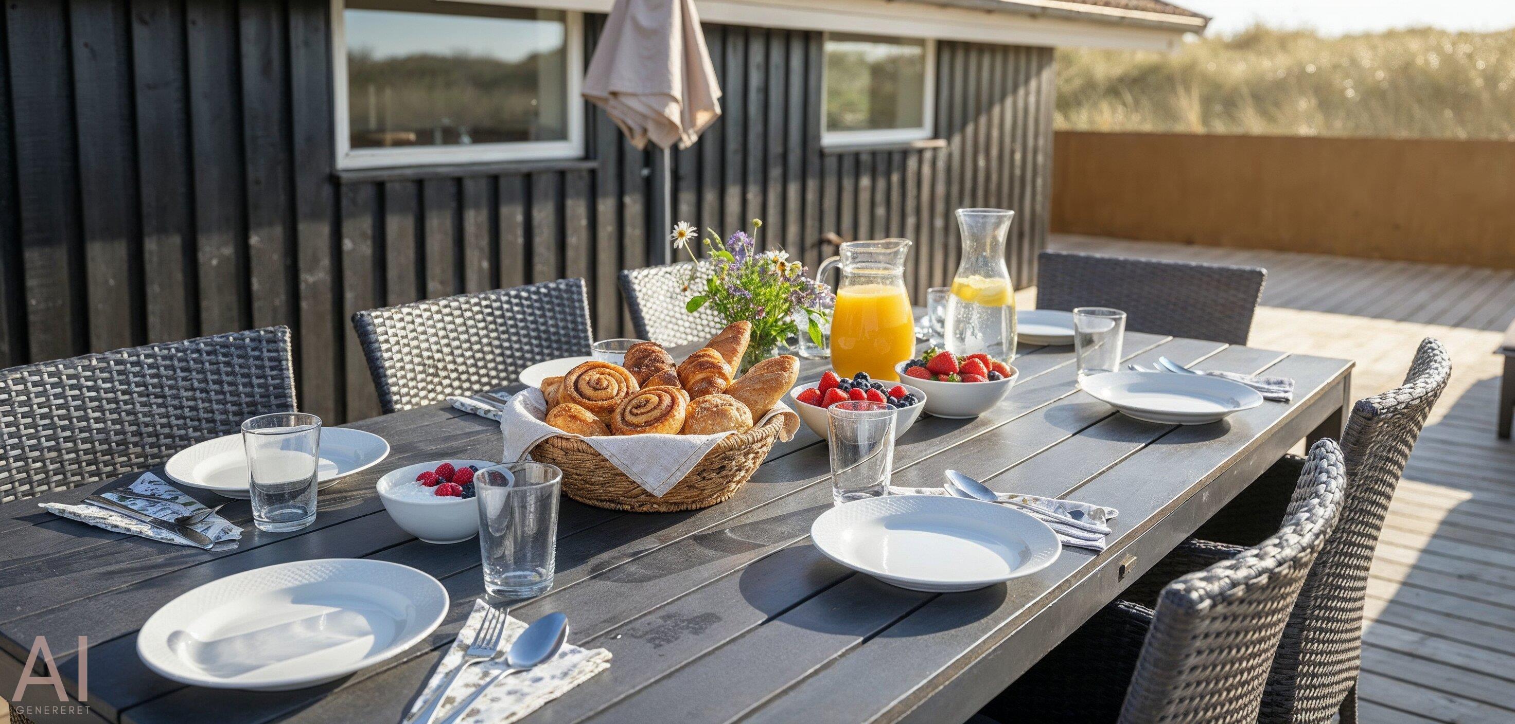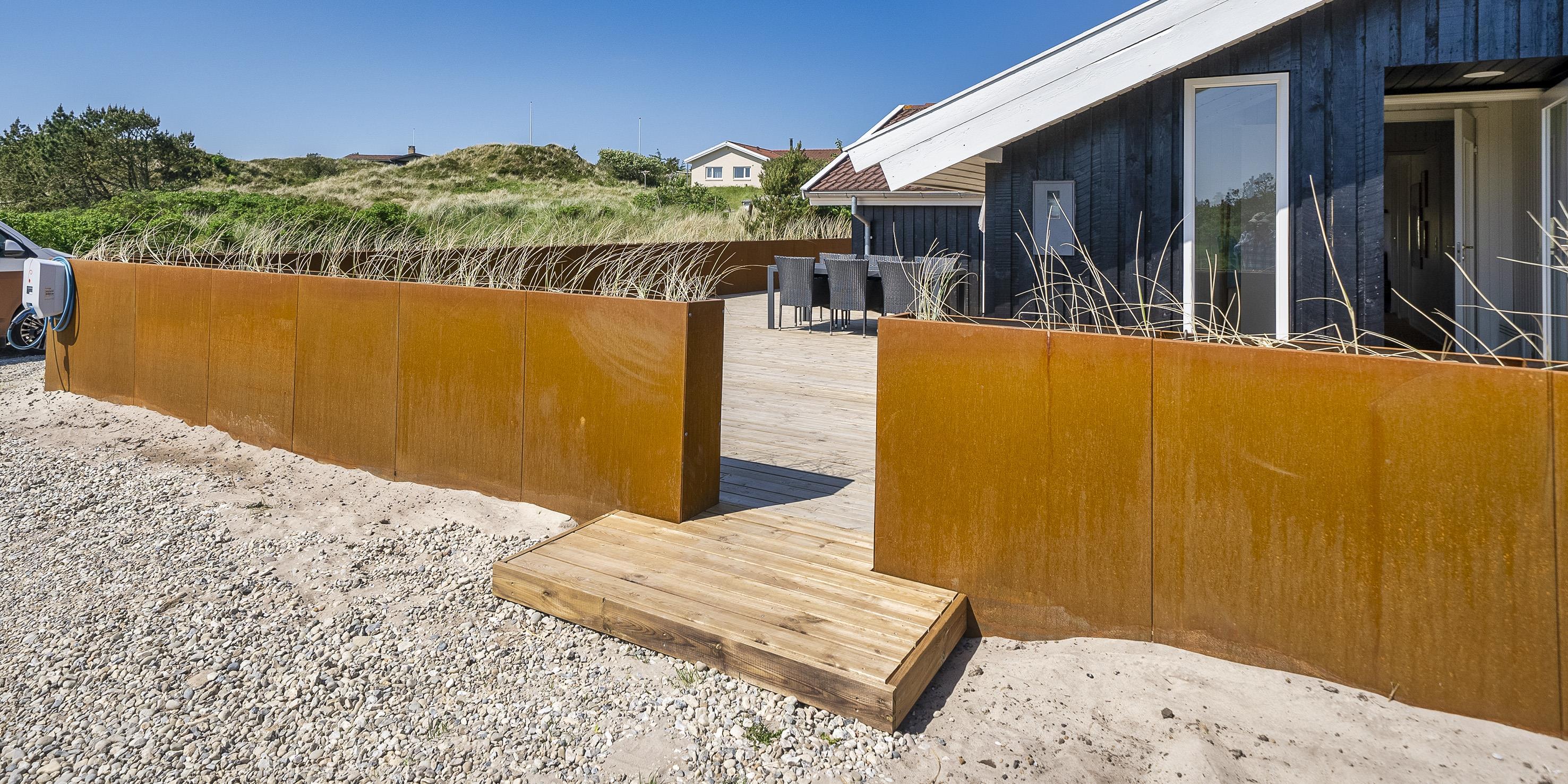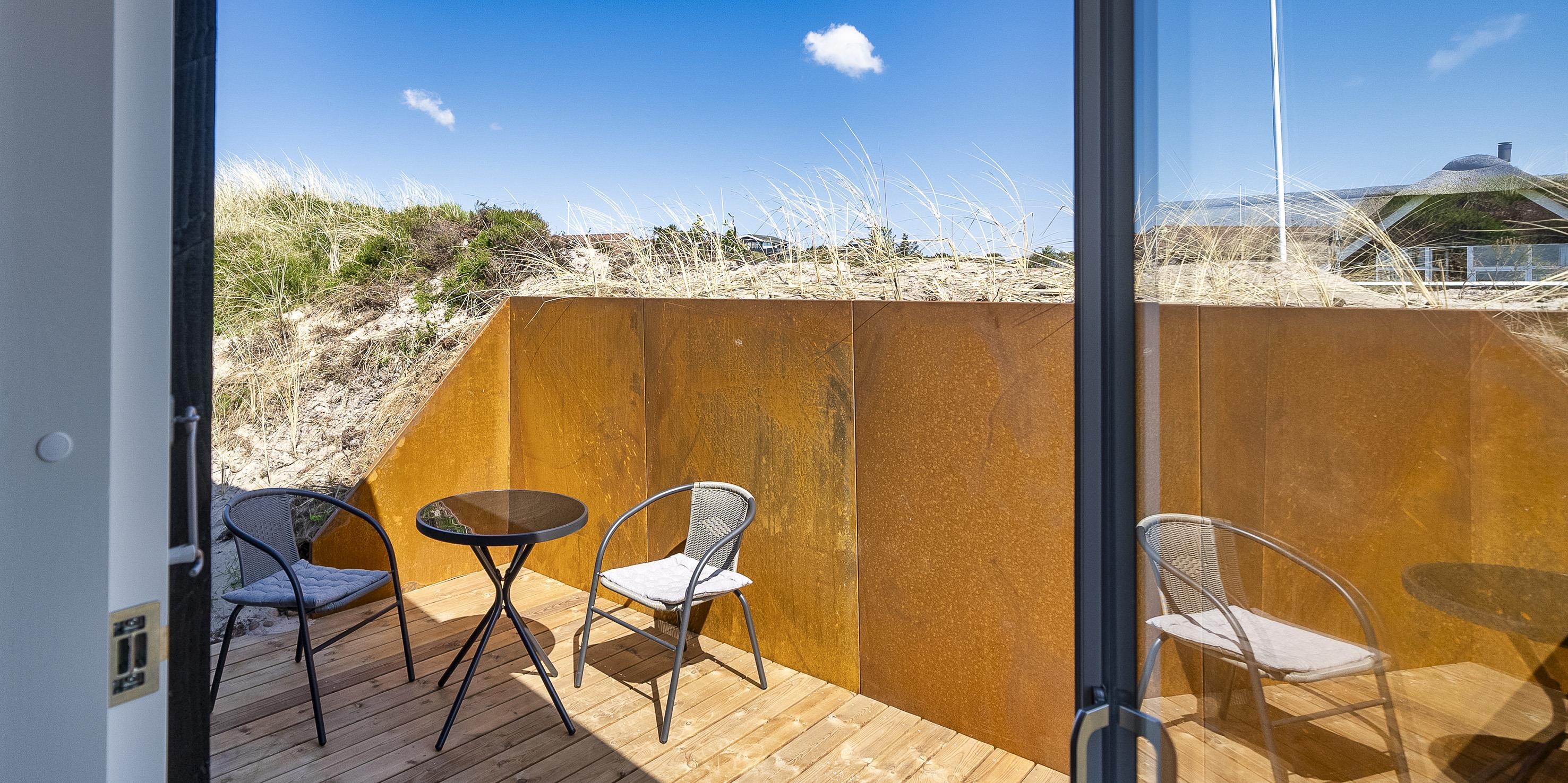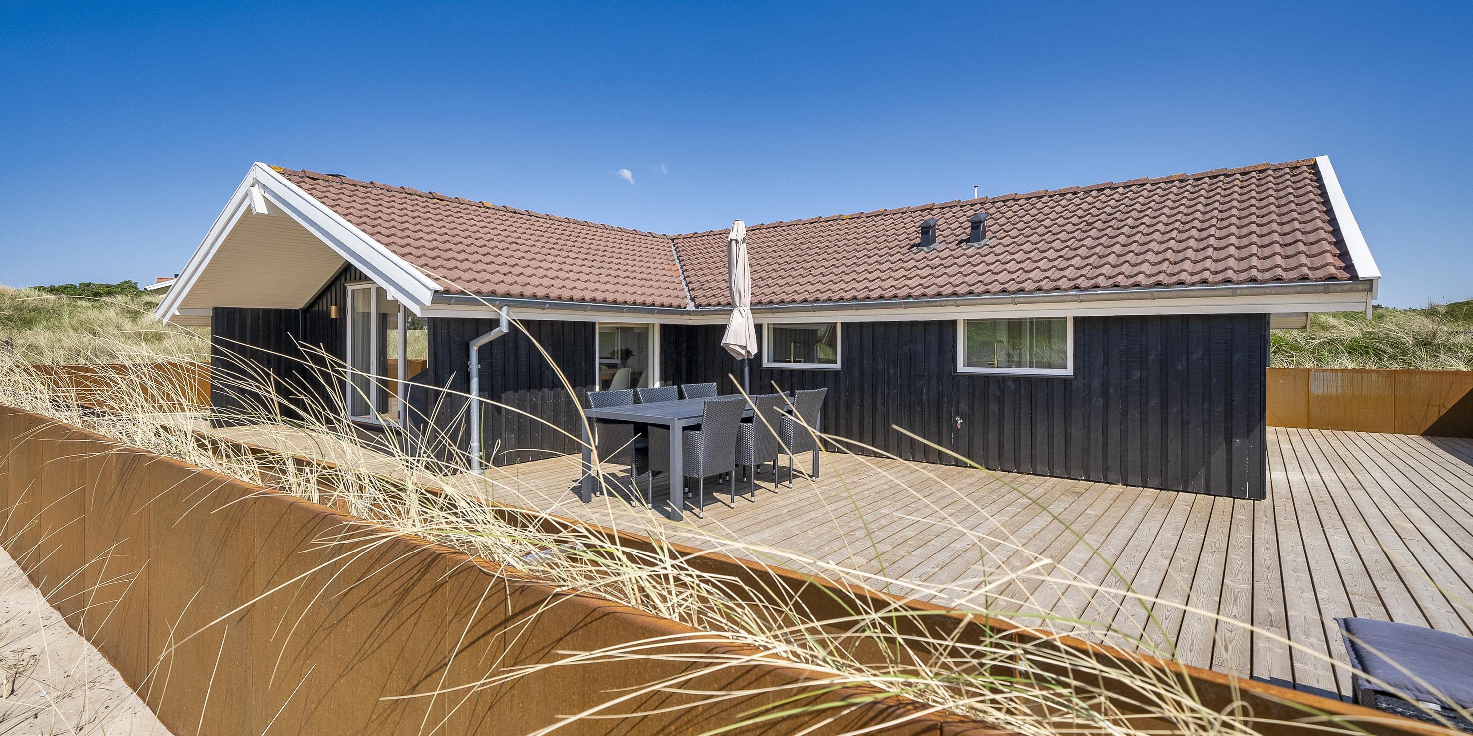 Allerede ved ankomsten til huset er feriedrømmene i gang. Den store flotte, delvis overdækkede træterrasse, er omgivet af kasser med hjelme, som giver gode lækroge.