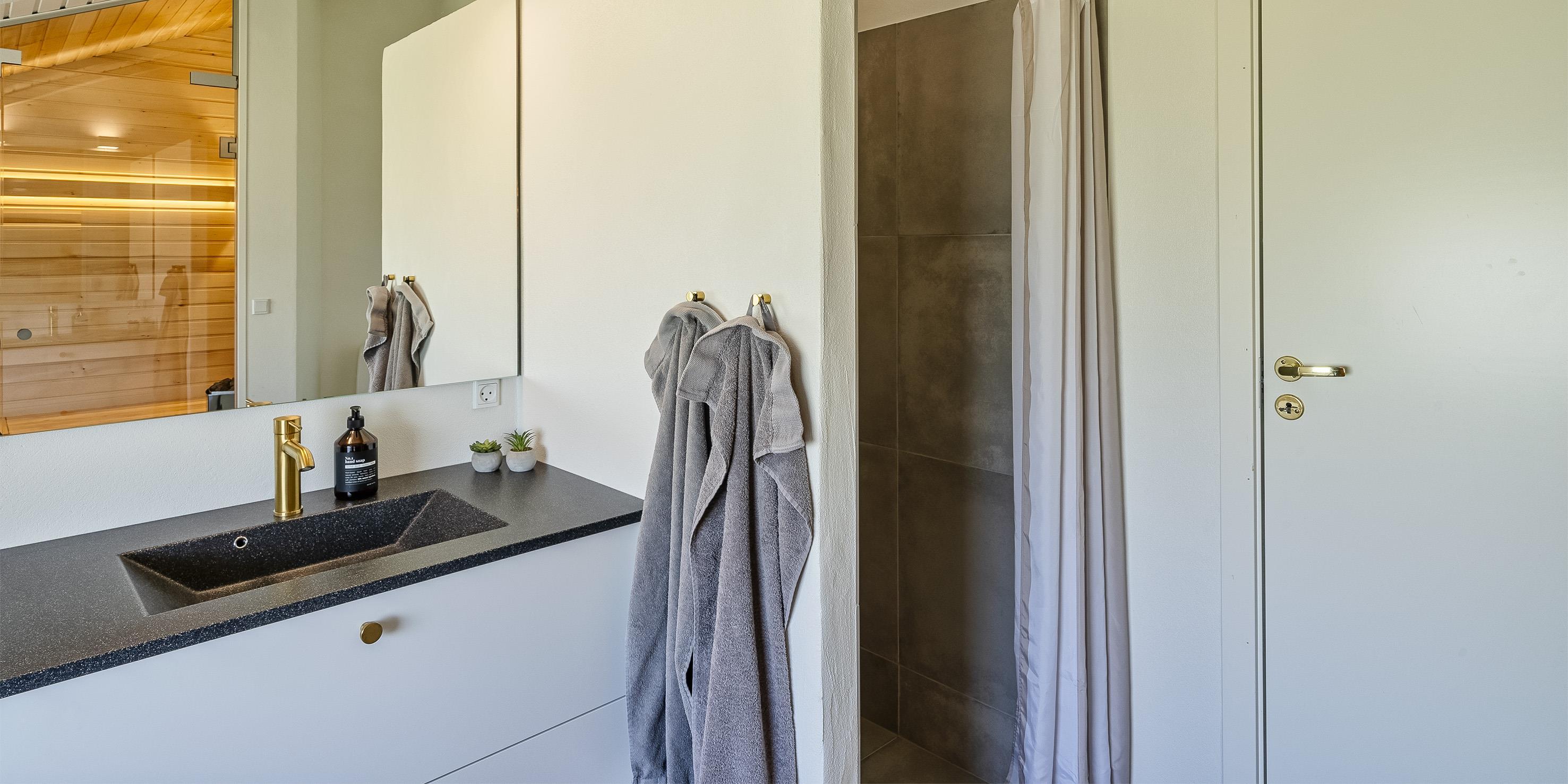 3 Soveværelser med gode senge (DS + DS + 2ES). Pænt badeværelse med gulvvarme, toilet, håndvask, bruser, sauna og Luksus badekar med integreret lysterapi og spa air-massage.