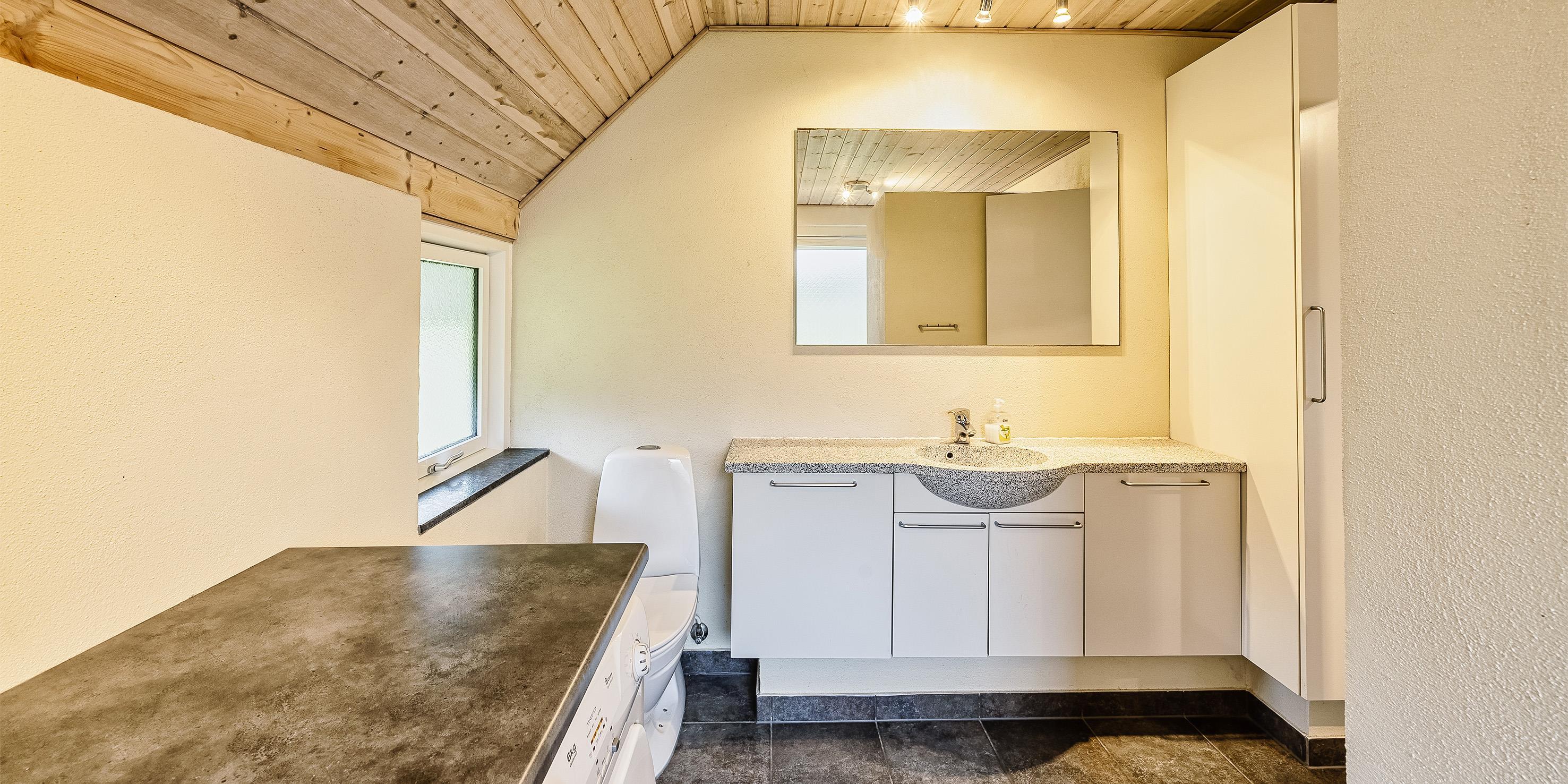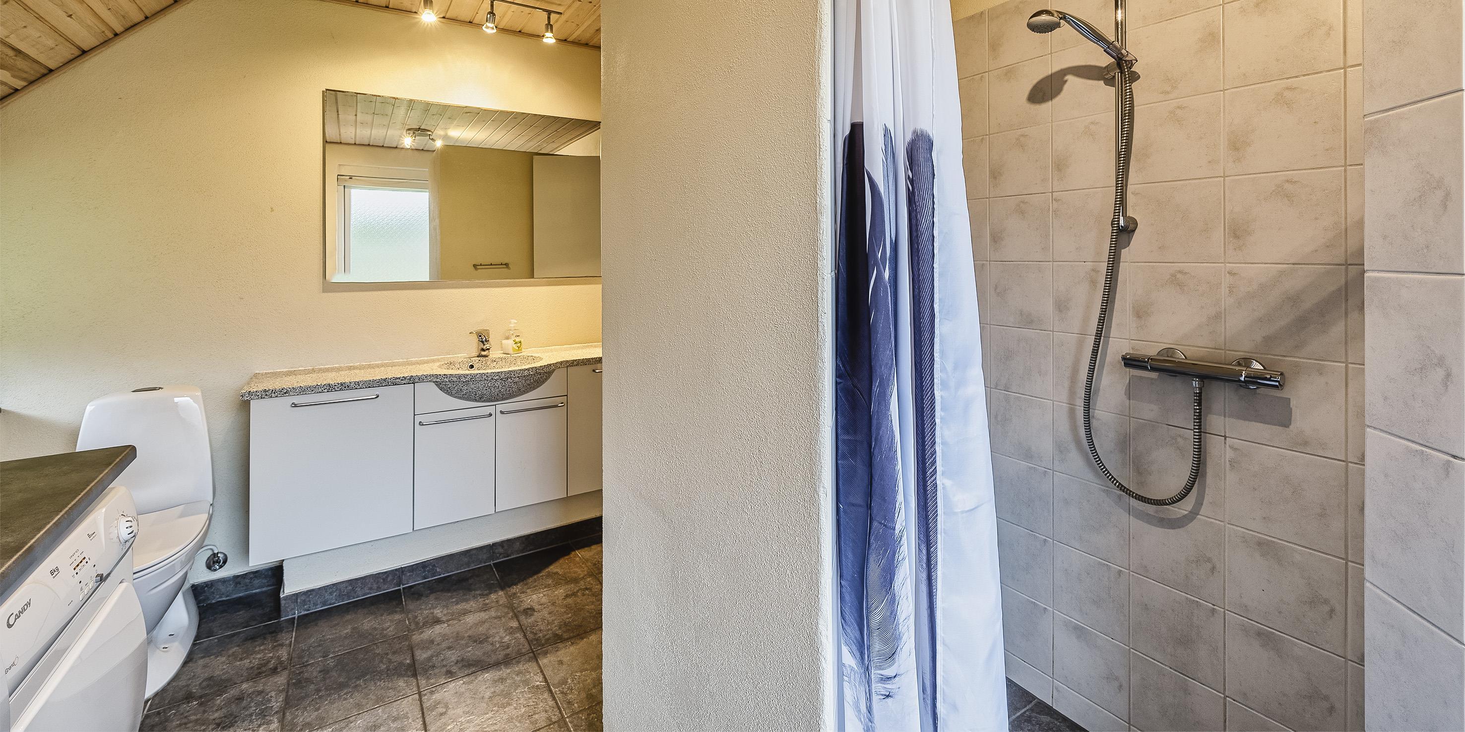 Bad med toilet, bruser og vask