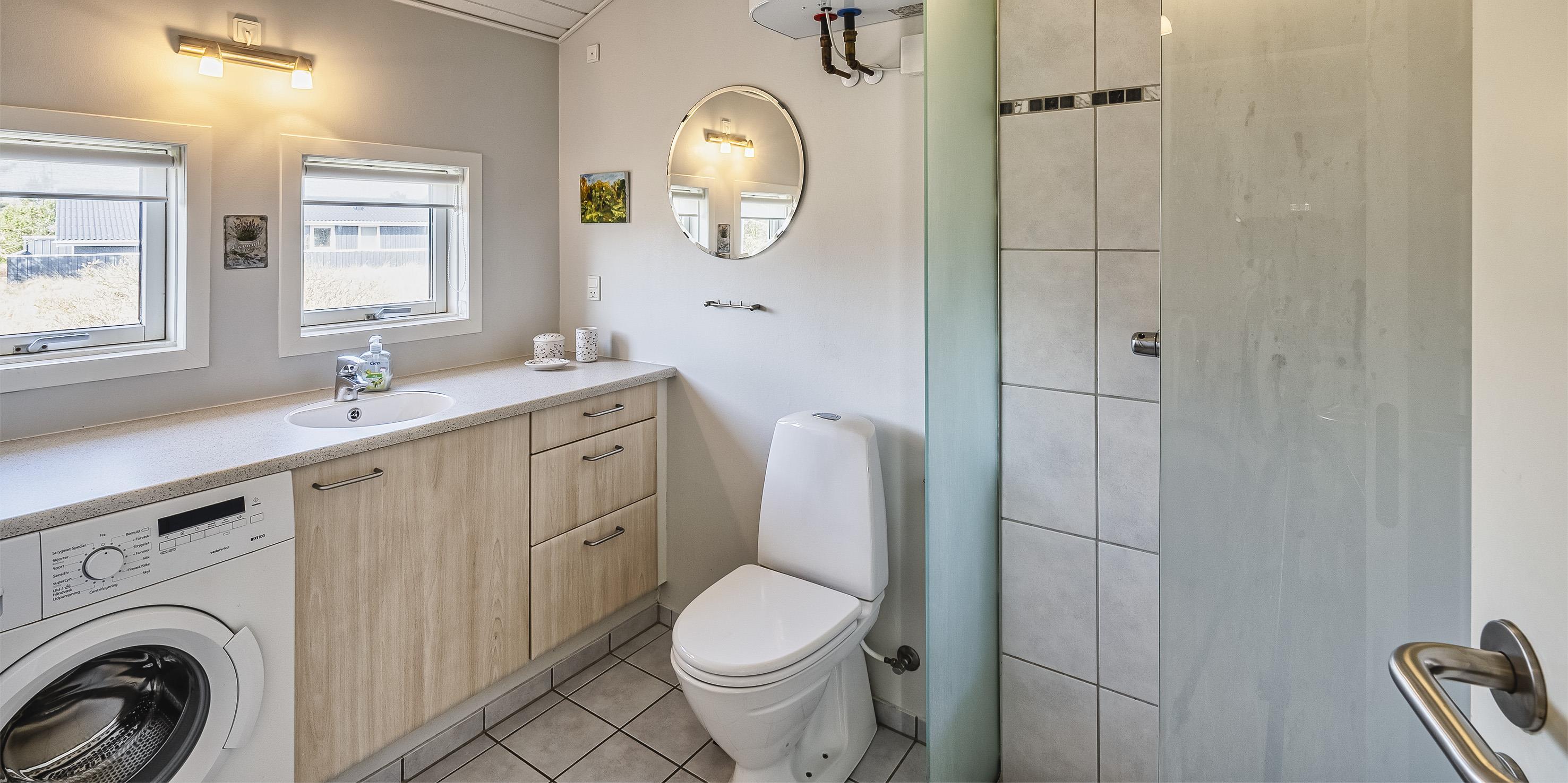 Bad med toilet, bruser og vask