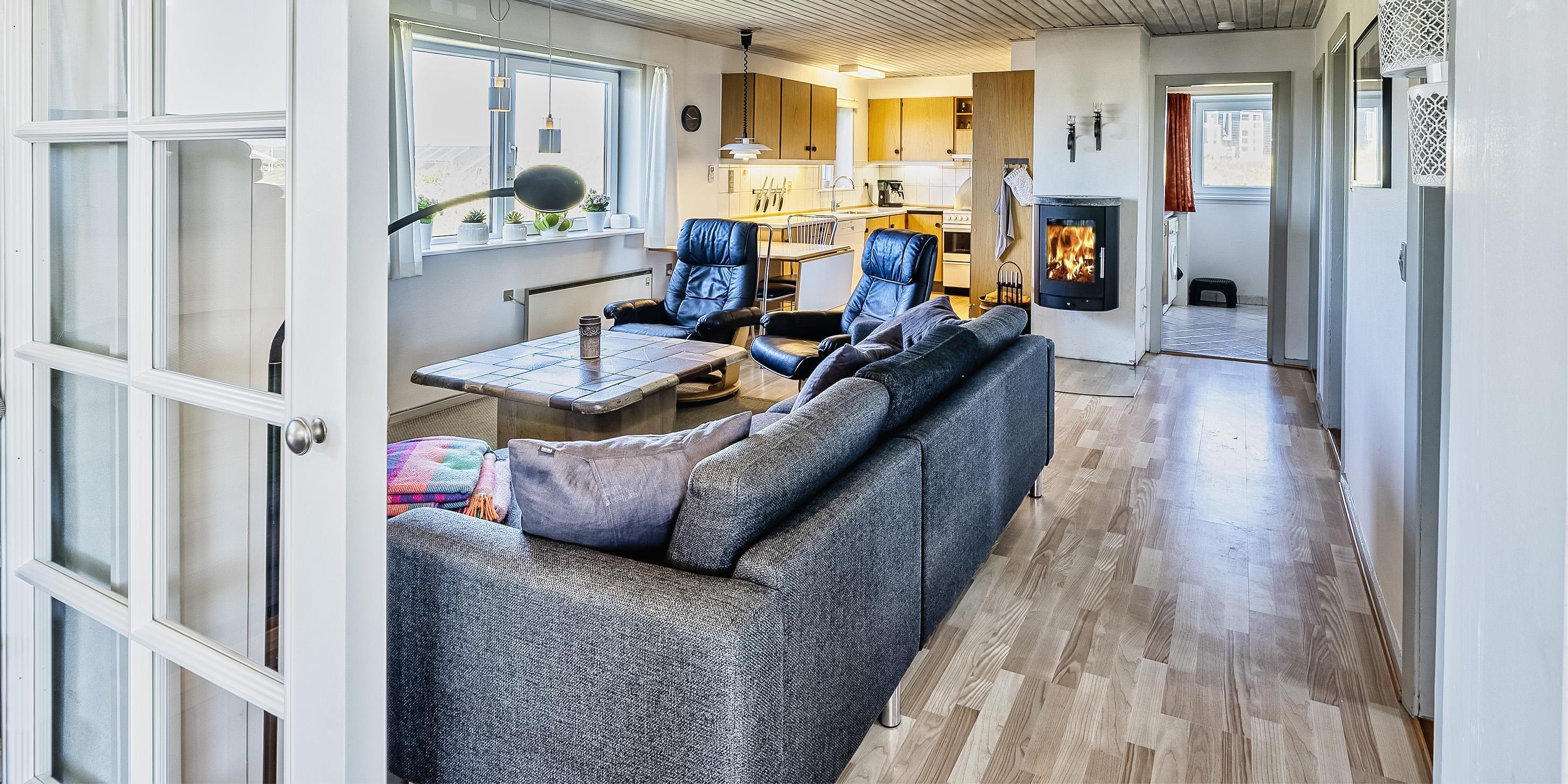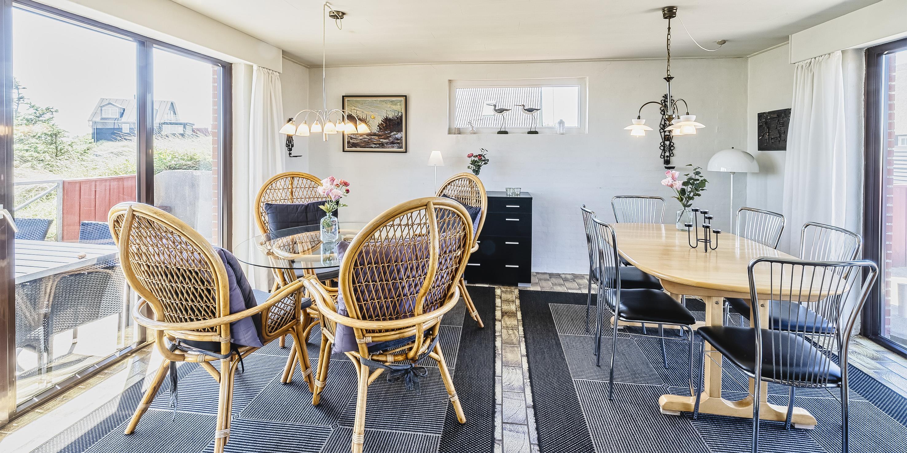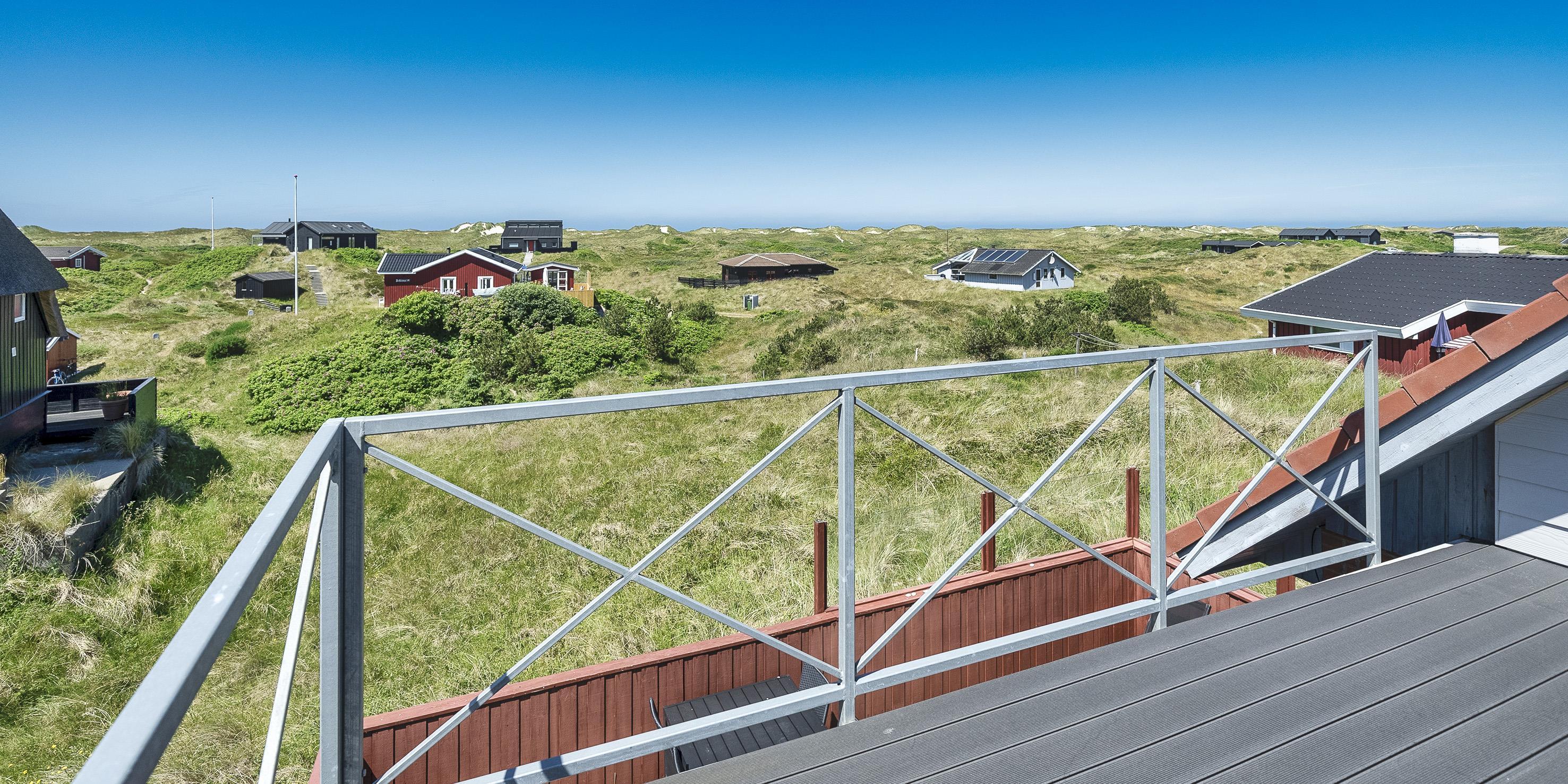 Hyggeligt sommerhus i 2 etager til 6 personer med havudsigt, beliggende på en klitgrund, ca. 200 meter fra stranden. Stue med brændeovn, fjernsyn og parabol (ingen danske programmer). Chromecast. Køkken med mikroovn og opvaskemaskine. 4 soveværelser: DS + DS + S + S. 2 soveværelser med hver 1 enkeltseng. Badeværelse med bruser/wc. Vaskemaskine. 1. sal: 2 soveværelser med hver 1 dobbeltseng. Trappen til 1. sal er meget stejl. Varmepumpe. Trådløs Internetadgang. 1 hund tilladt. Balkon samt lukket terrasse. Rygning er ikke tilladt. Byggeår 1957, løbende vedligeholdt.