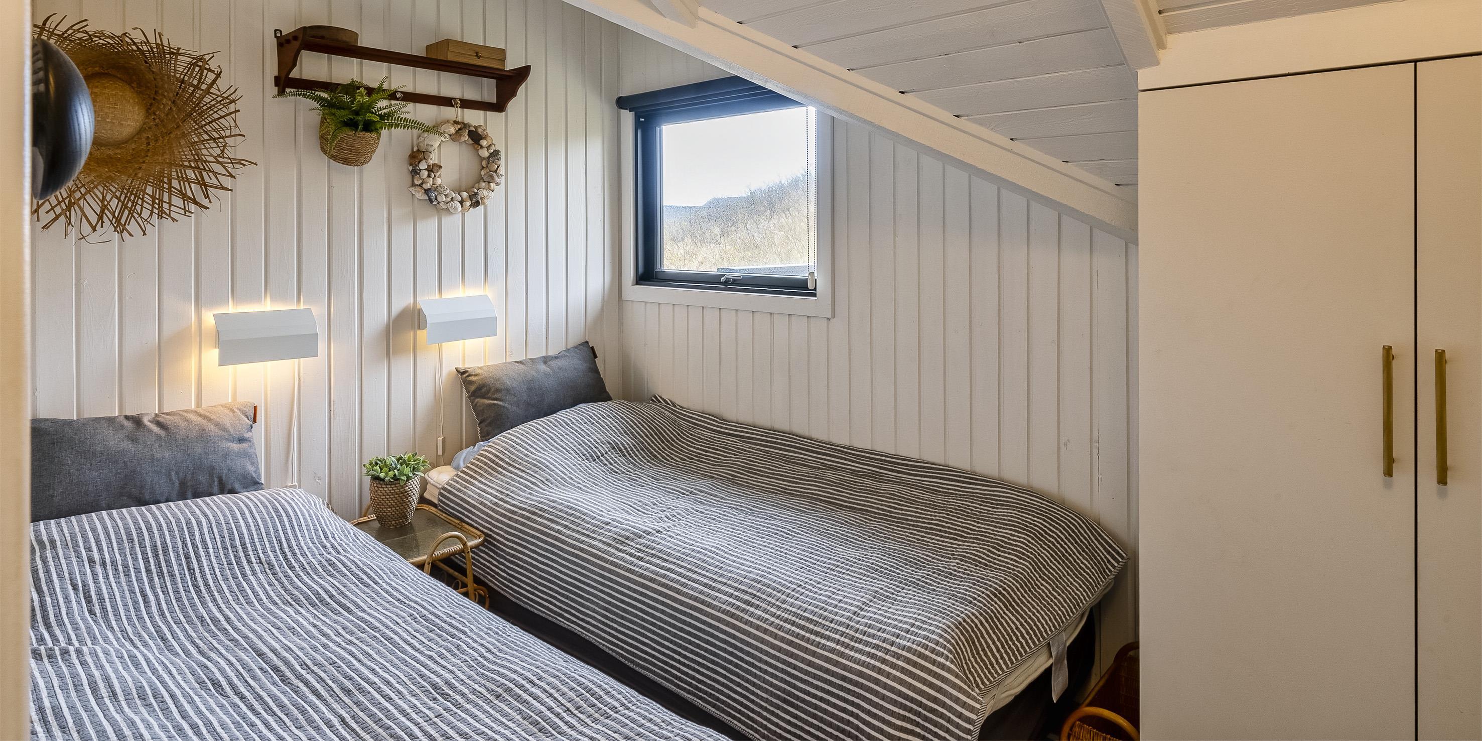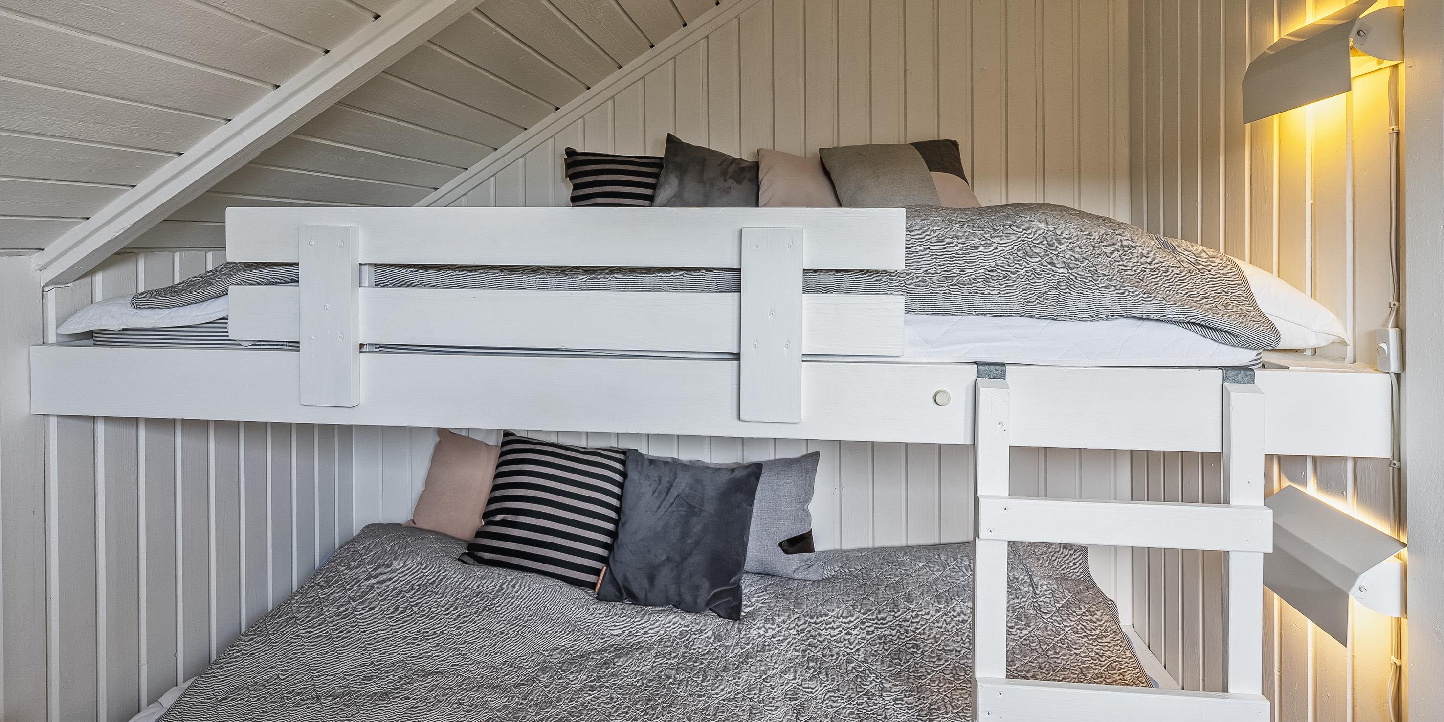 3 soveværelser. 2 med 2 enkeltsenge (á 90x200 cm). 1 med køjeseng.