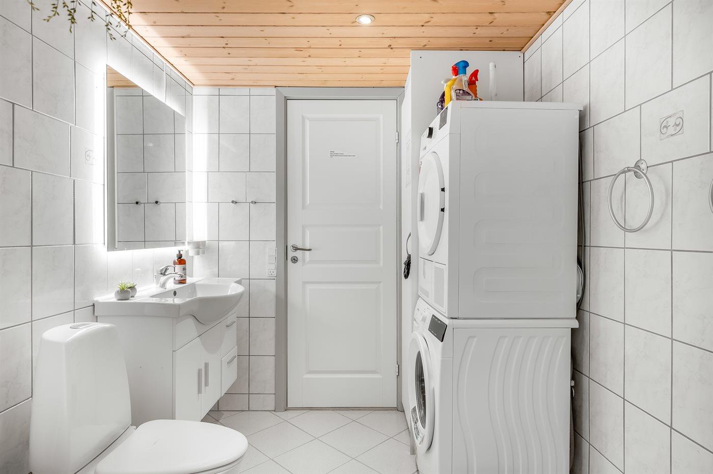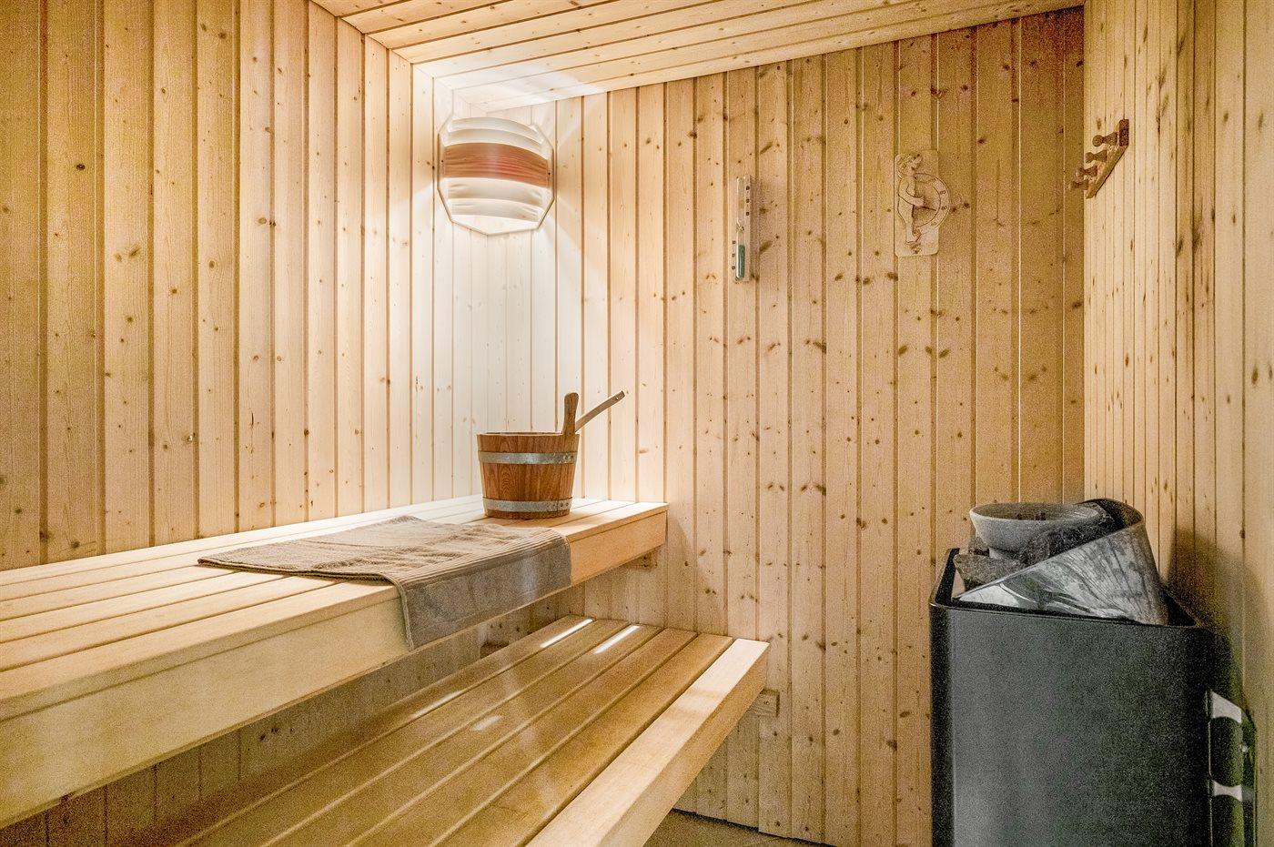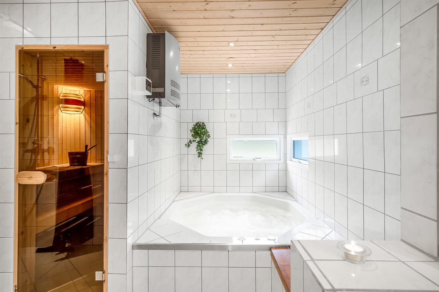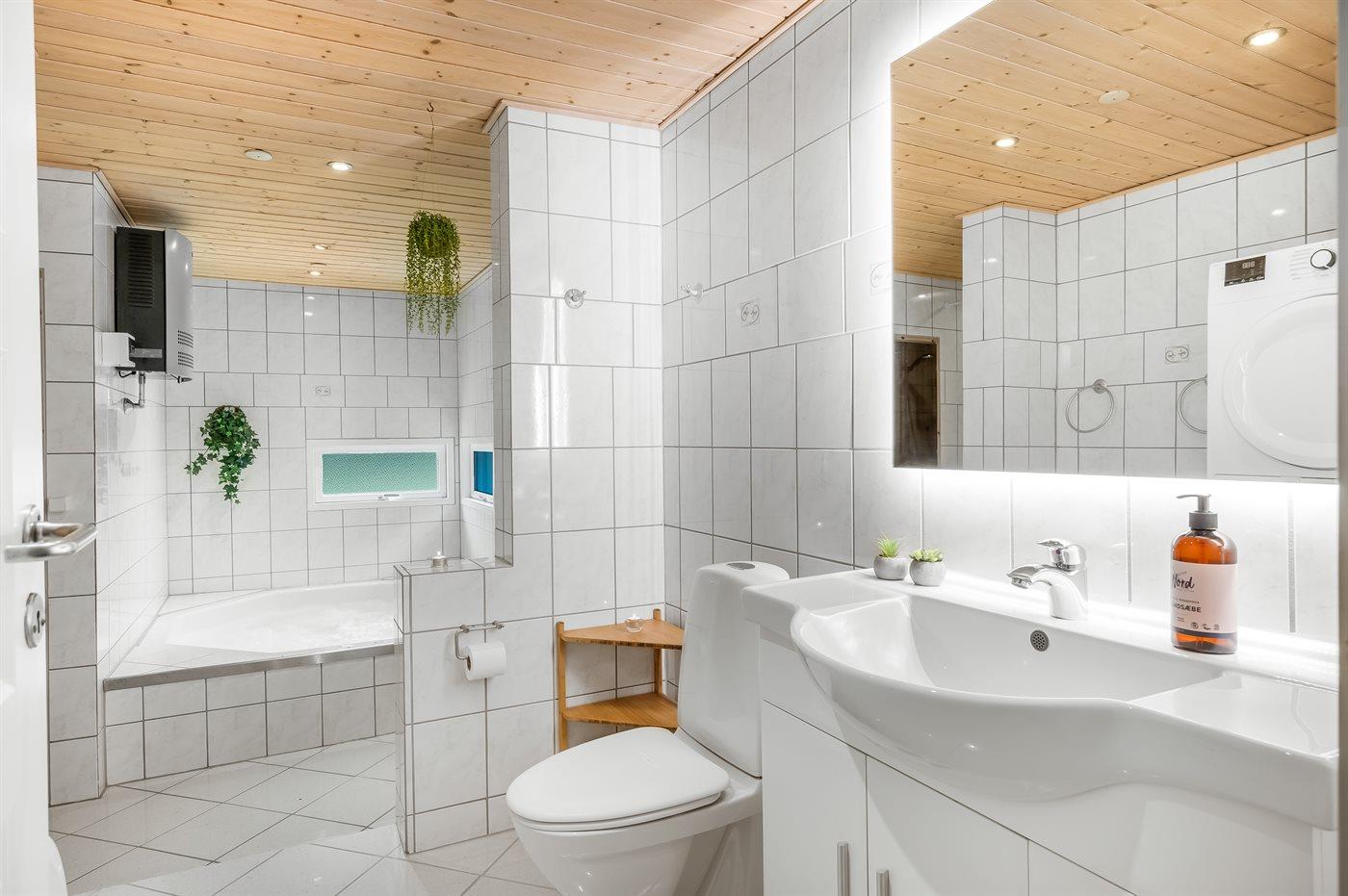 Der er 2 badeværelser med bruseniche og 2 toiletter. Der er gulvvarme på 2 badeværelser. I saunaen er der mulighed for afslapning.