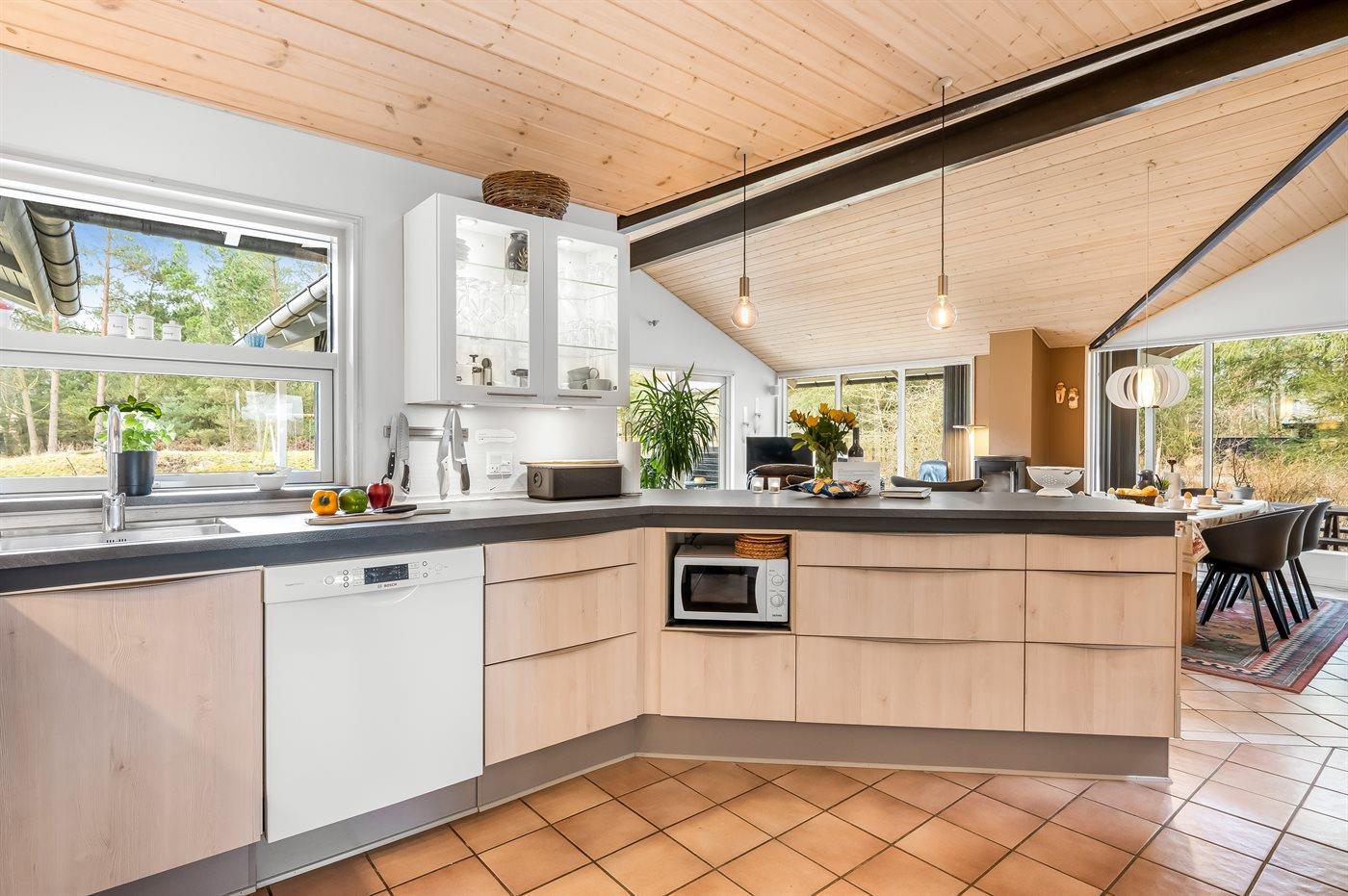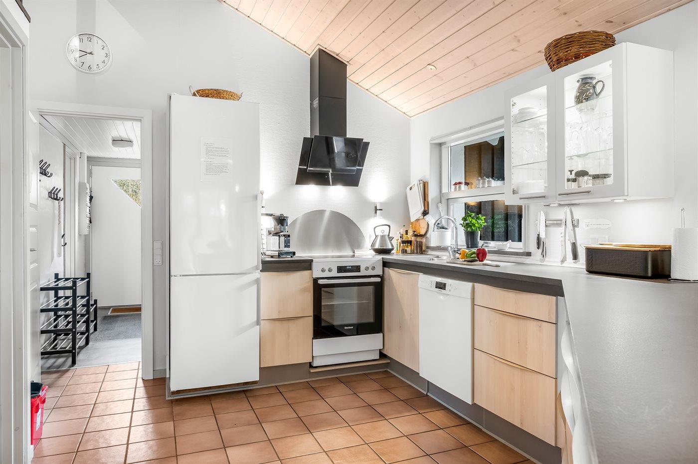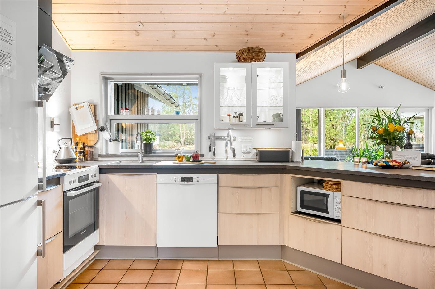 Køkkenet er udstyret med 1 køleskab. Der er 4 keramiske kogeplader, bageovn, mikrobølgeovn samt opvaskemaskine.
