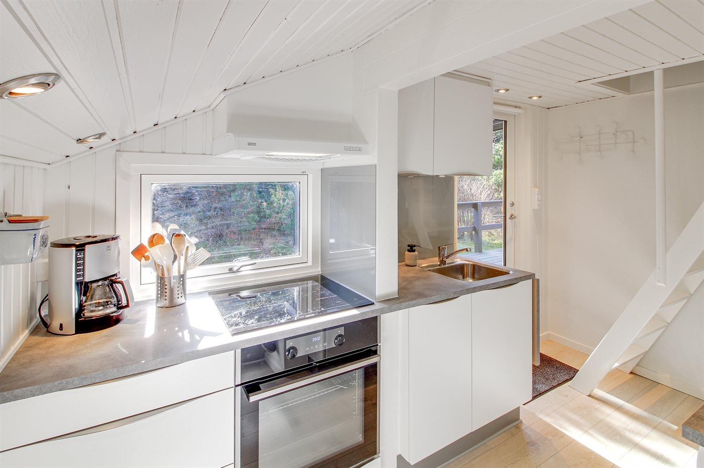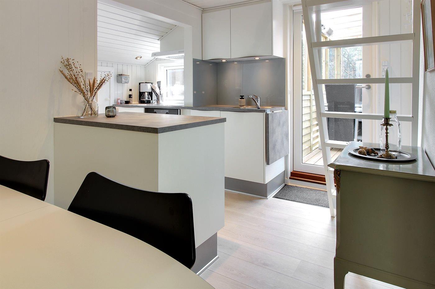 Køkkenet er udstyret med 1 køleskab. Der er 4 keramiske kogeplader, bageovn, mikrobølgeovn samt opvaskemaskine.