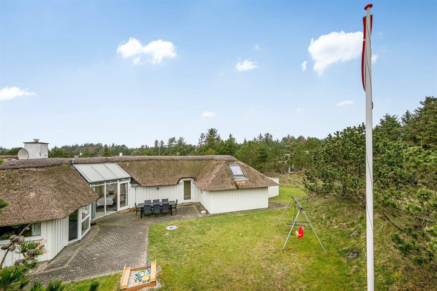 Dejligt sommerhus i Vejers Strand med stråtag, stor naturgrund og indendørs spa til afslapning.