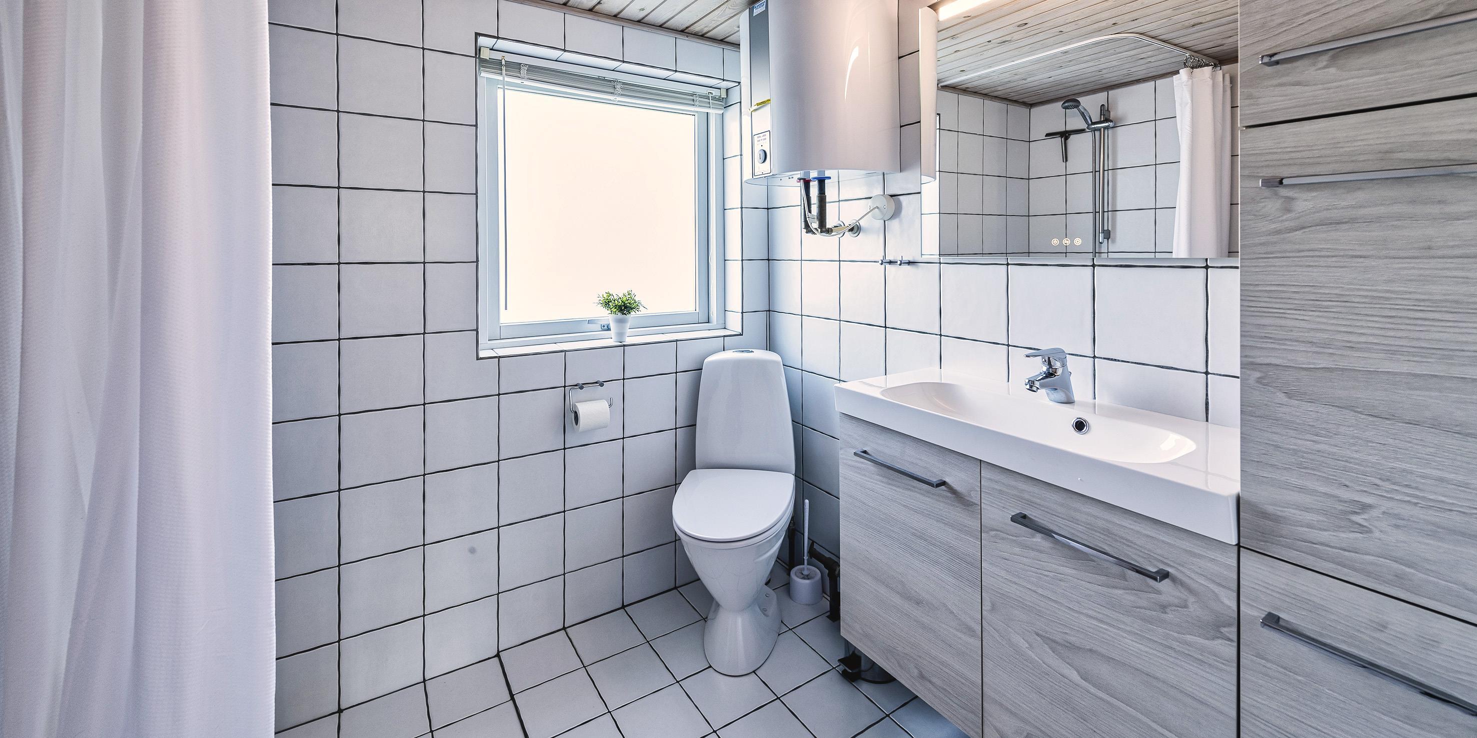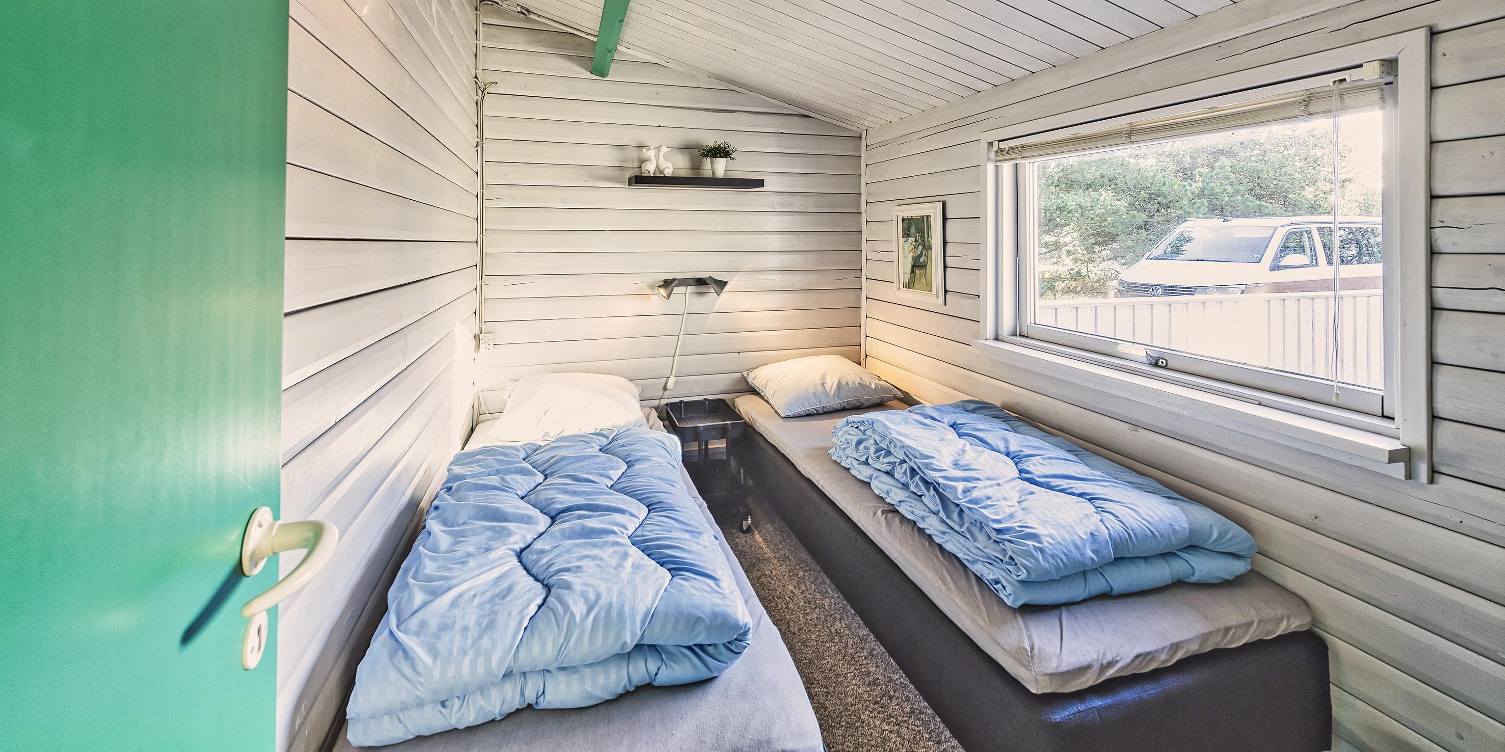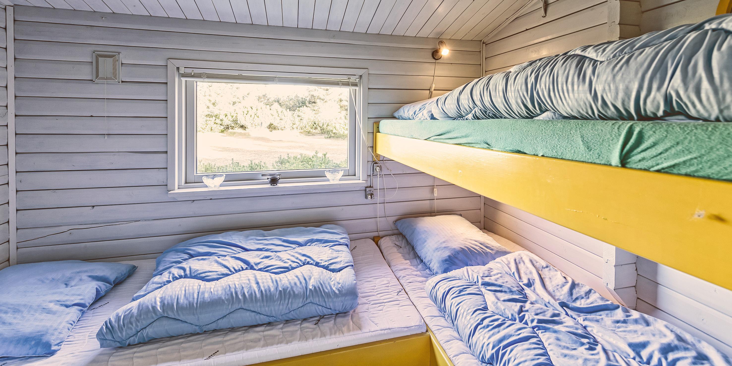 3 soveværelser. 1 med dobbeltseng 180x200 cm. 1 med 2 enkeltsenge (á 80x200 cm). 1 med 1 køjeseng og 1 enkeltseng.
