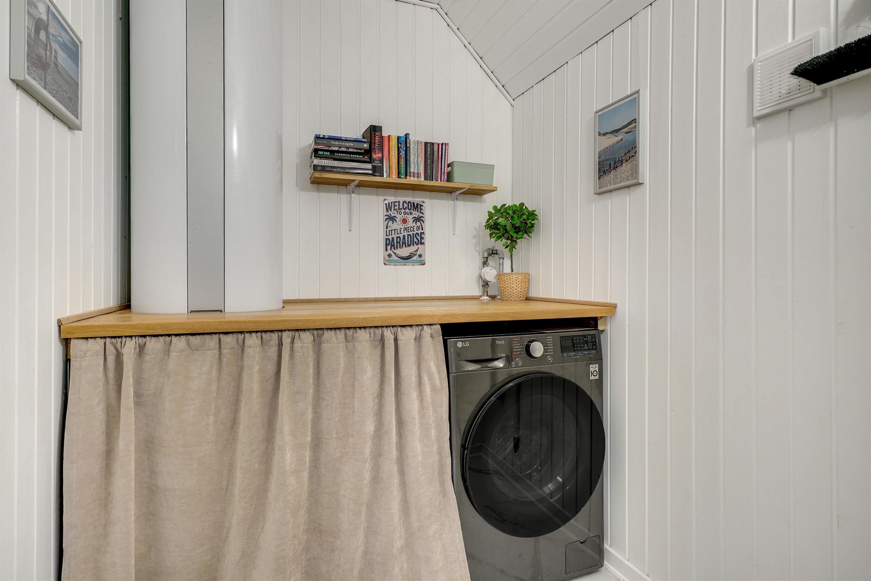 Indenfor er huset funktionelt indrettet og opført i hyggelig og charmerende stil der oser af ægte sommerhusstemning.