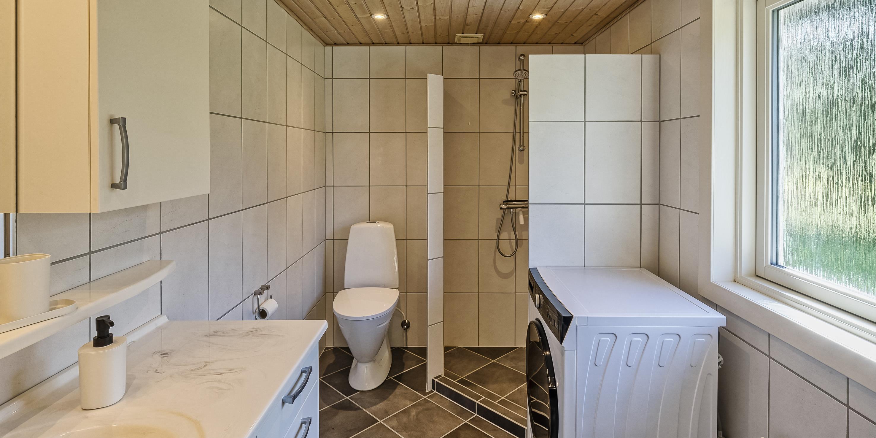 Bad med toilet, bruser og vask
